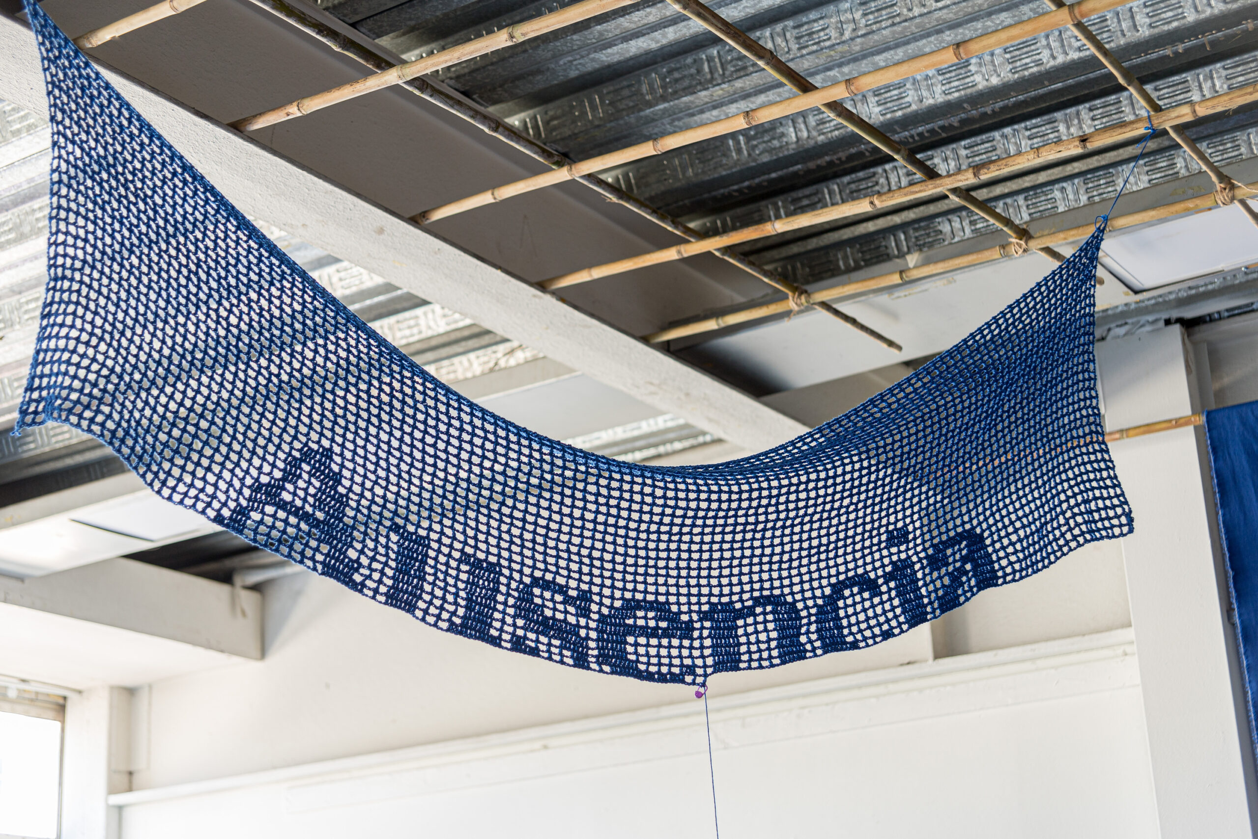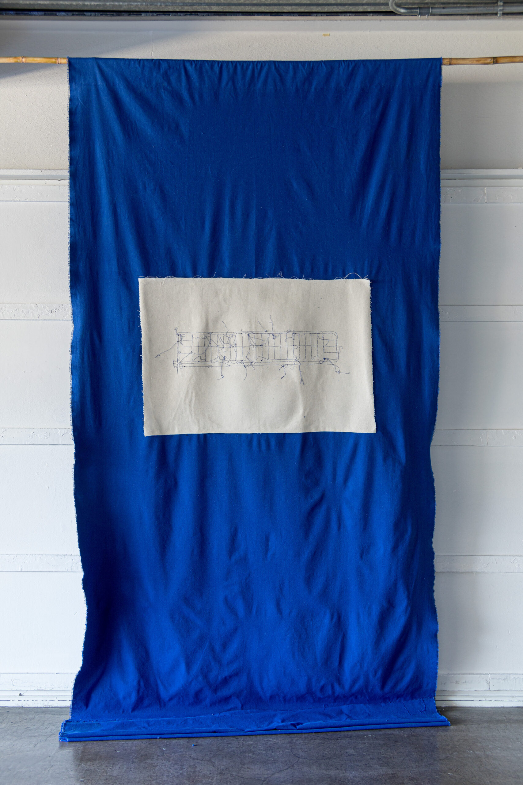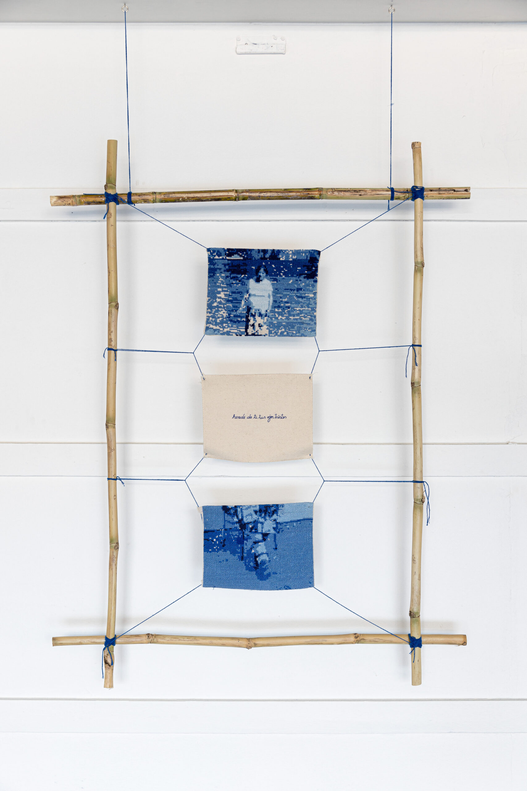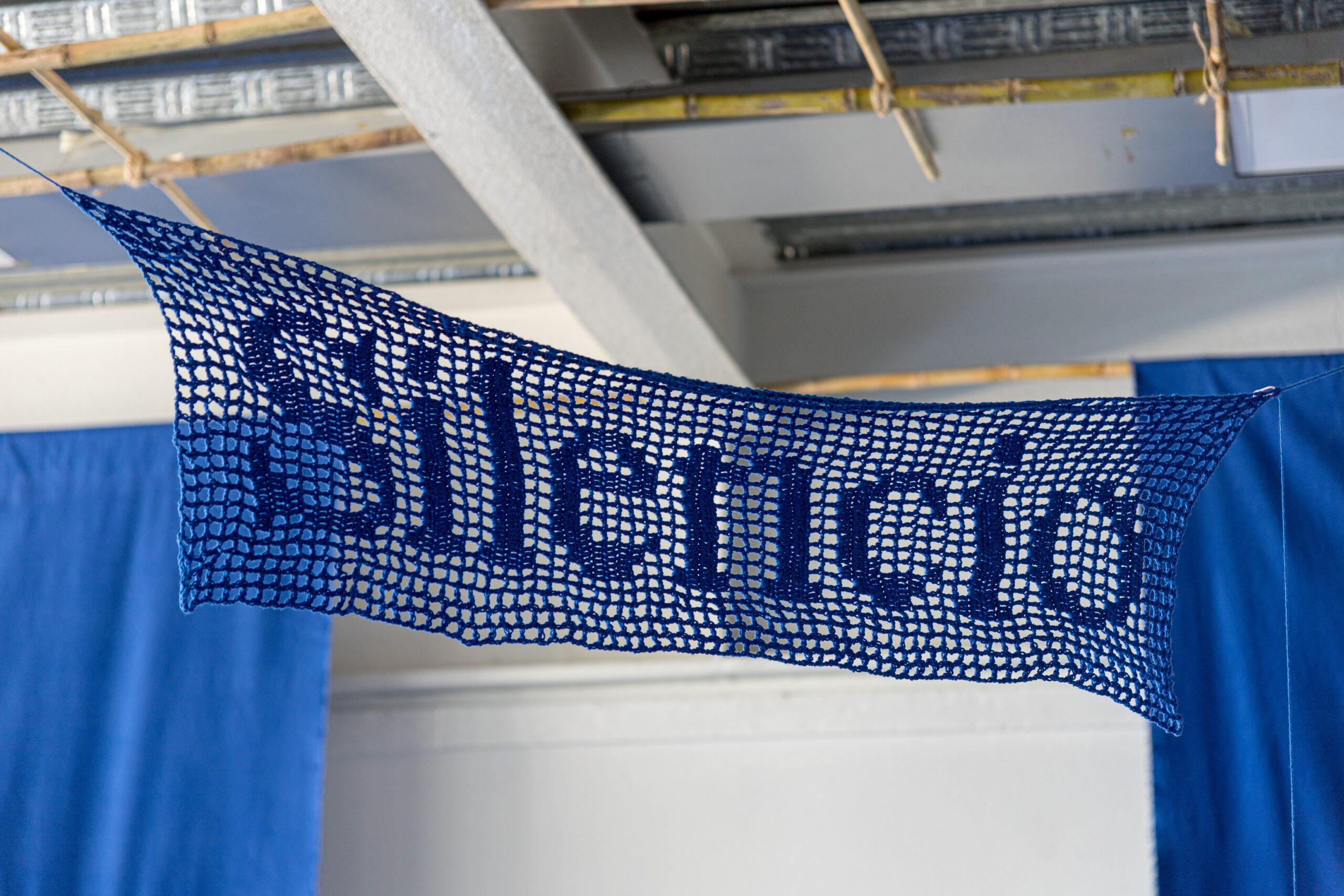 AYLINE FIGUEROA. La tierra se tiñe de azul en la orilla , tejido a crochet en hilo de algodón azul, técnica filet, medidas variables. Planos en planta de los lugares habitados por mi familia, bordados con hilo azul sobre tela lona, 90 x 60 cm aprox. Reproducción de imágenes en bordado punto cruz junto a frase bordada en tela lona, medidas variables, 2024.