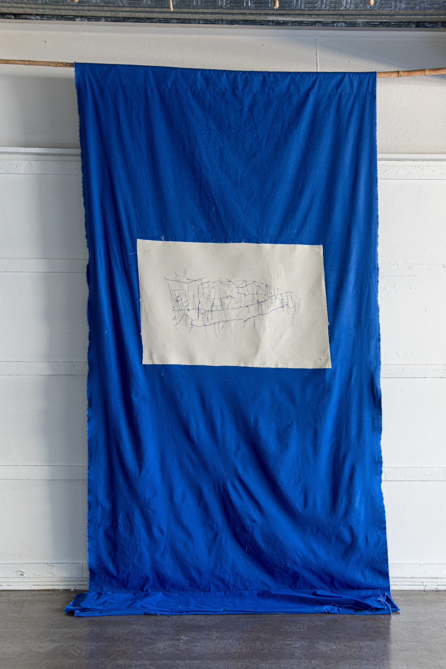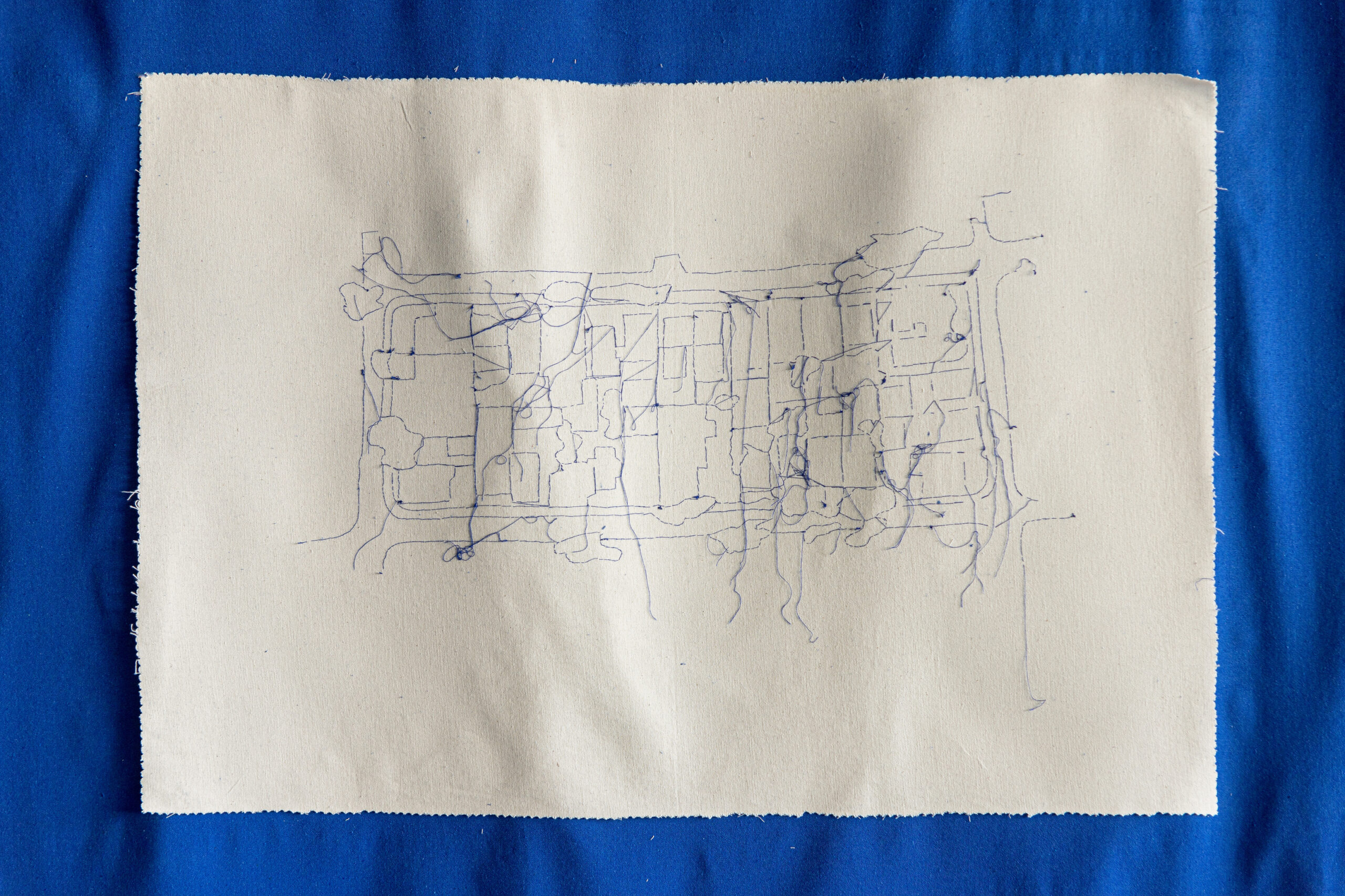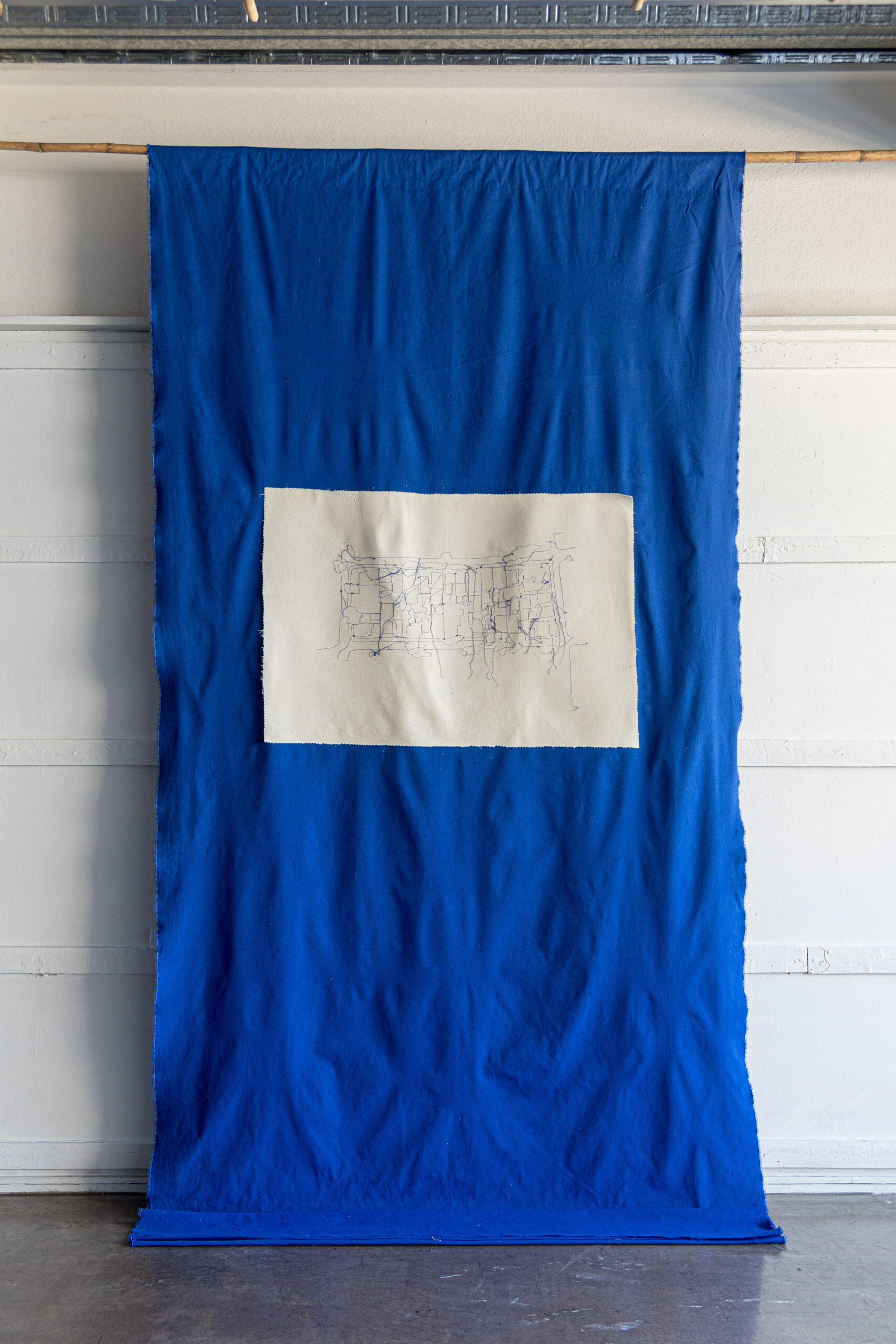 AYLINE FIGUEROA. La tierra se tiñe de azul en la orilla , tejido a crochet en hilo de algodón azul, técnica filet, medidas variables. Planos en planta de los lugares habitados por mi familia, bordados con hilo azul sobre tela lona, 90 x 60 cm aprox. Reproducción de imágenes en bordado punto cruz junto a frase bordada en tela lona, medidas variables, 2024.