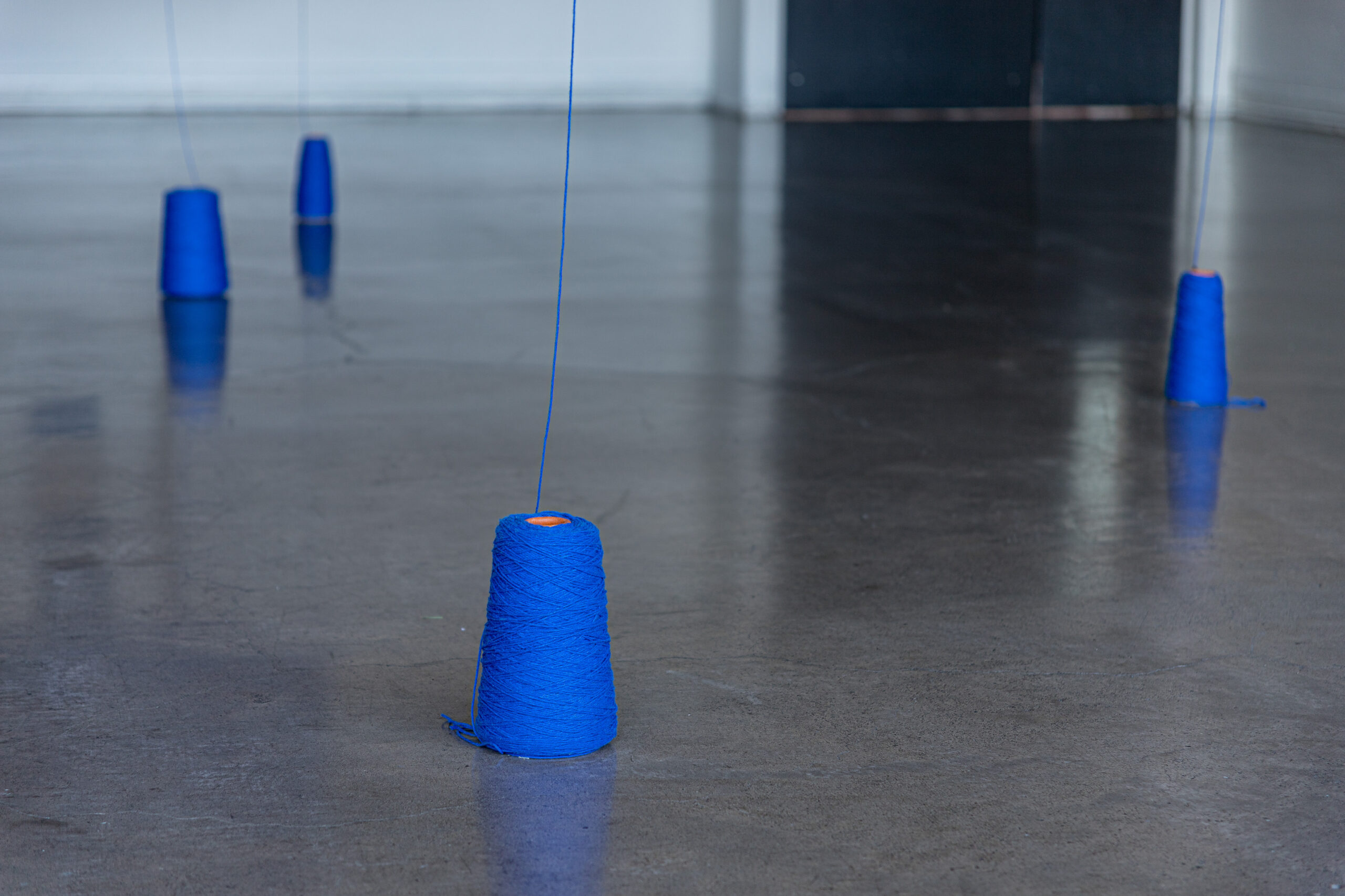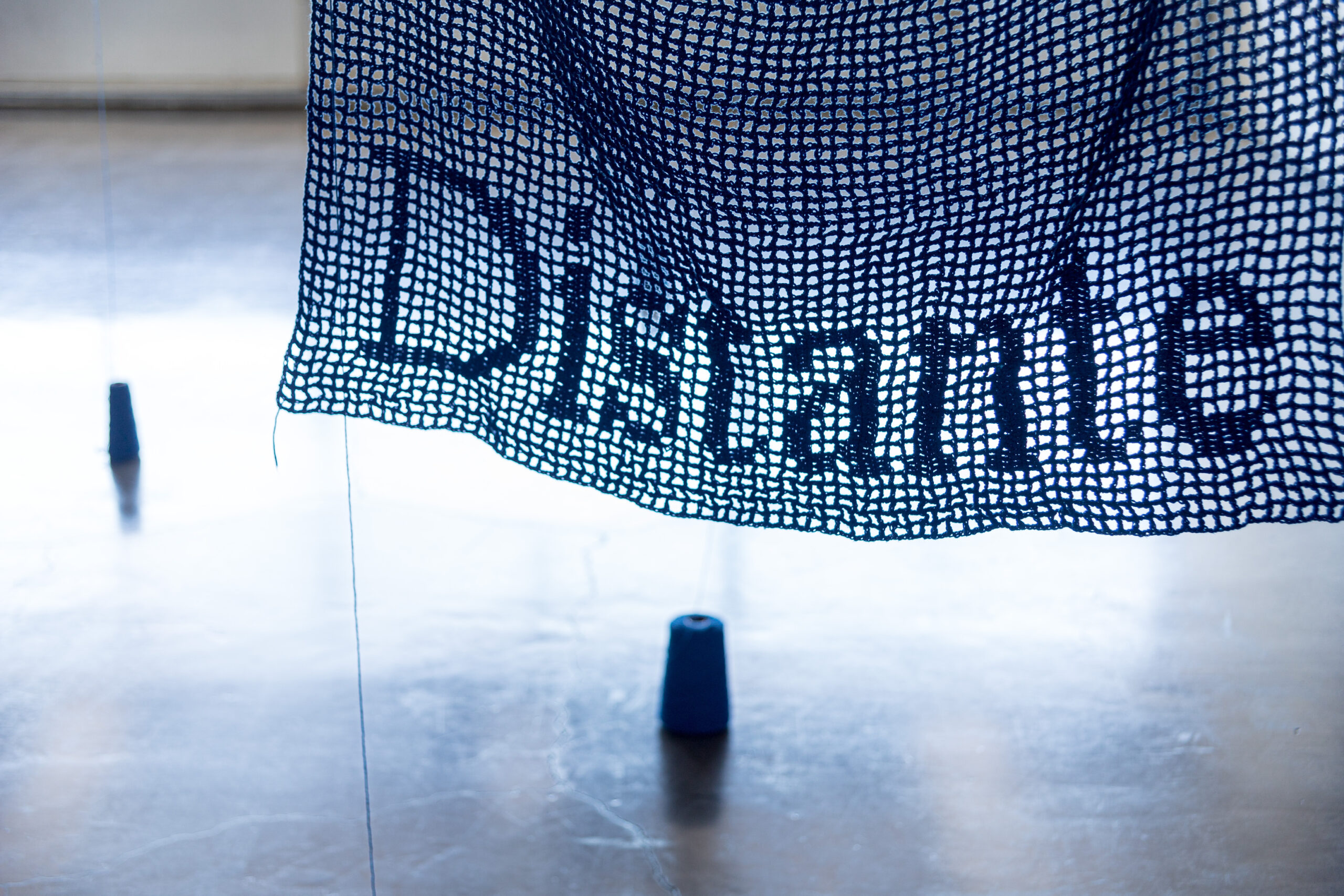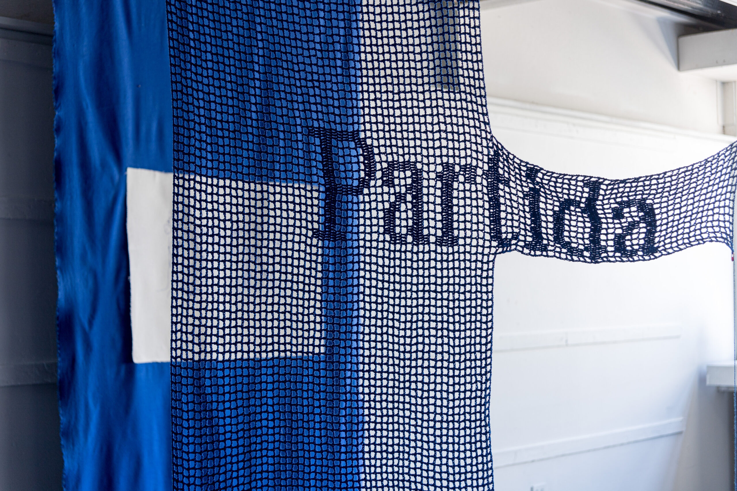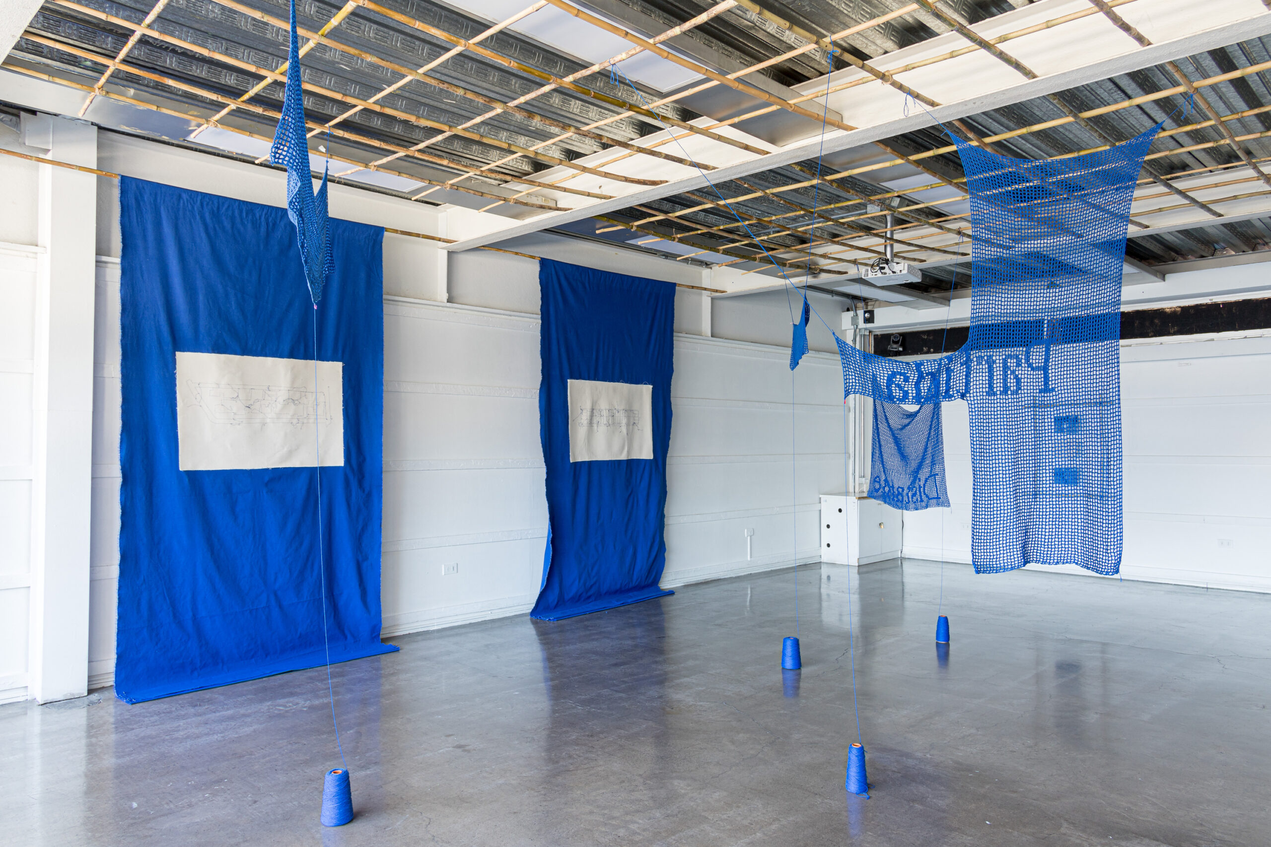 AYLINE FIGUEROA. La tierra se tiñe de azul en la orilla , tejido a crochet en hilo de algodón azul, técnica filet, medidas variables. Planos en planta de los lugares habitados por mi familia, bordados con hilo azul sobre tela lona, 90 x 60 cm aprox. Reproducción de imágenes en bordado punto cruz junto a frase bordada en tela lona, medidas variables, 2024.