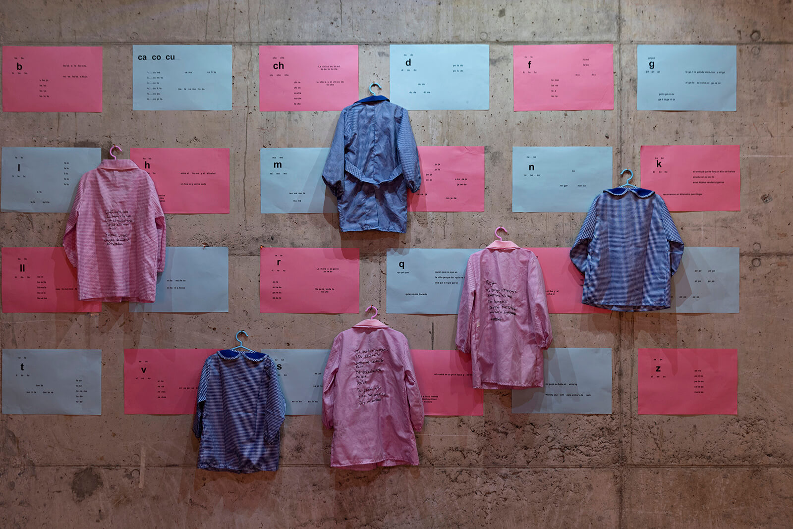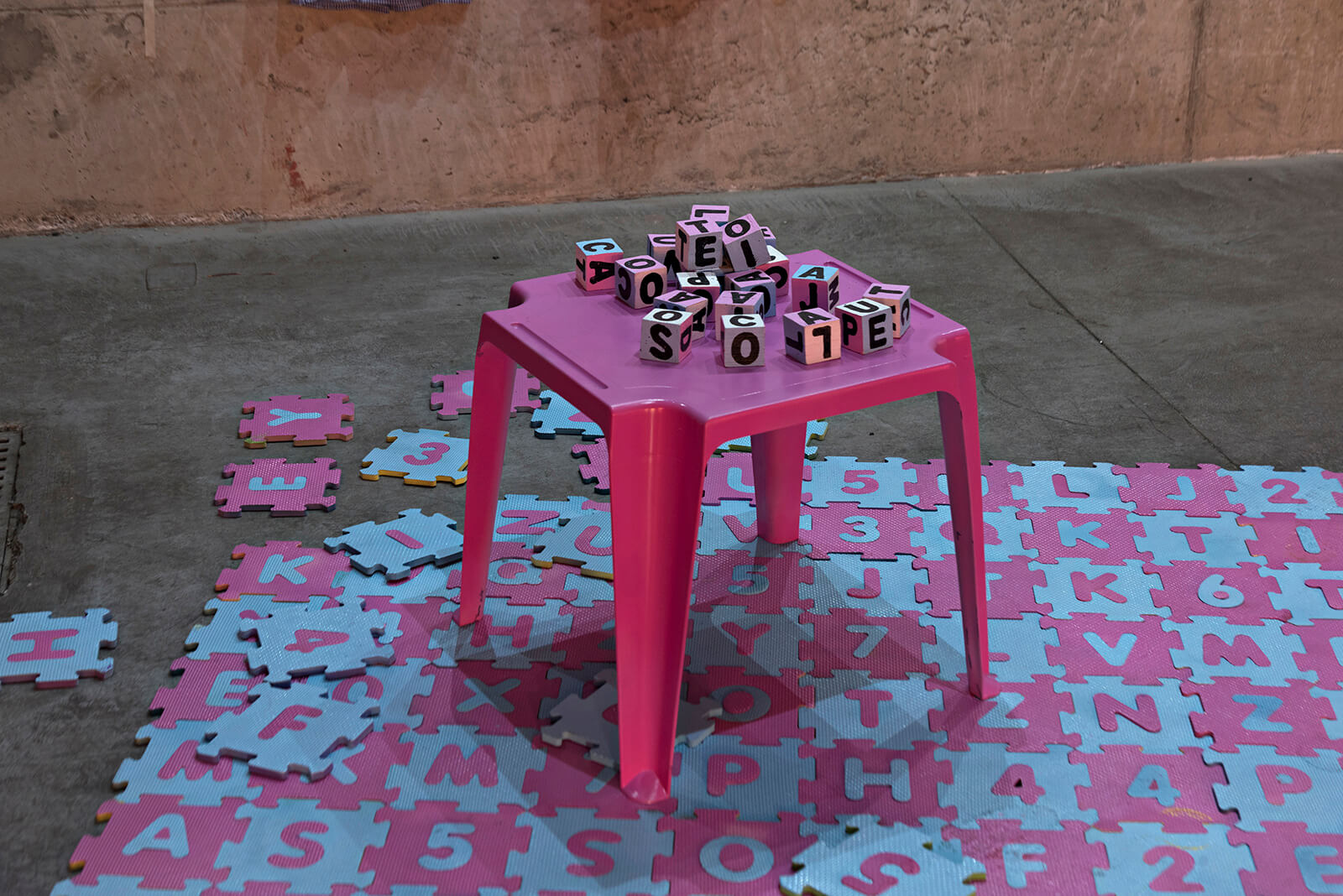 Catalina Vera, Alfabetización, 2018. Cubos de madera y goma eva pintados con acrílico, dimensiones variables.