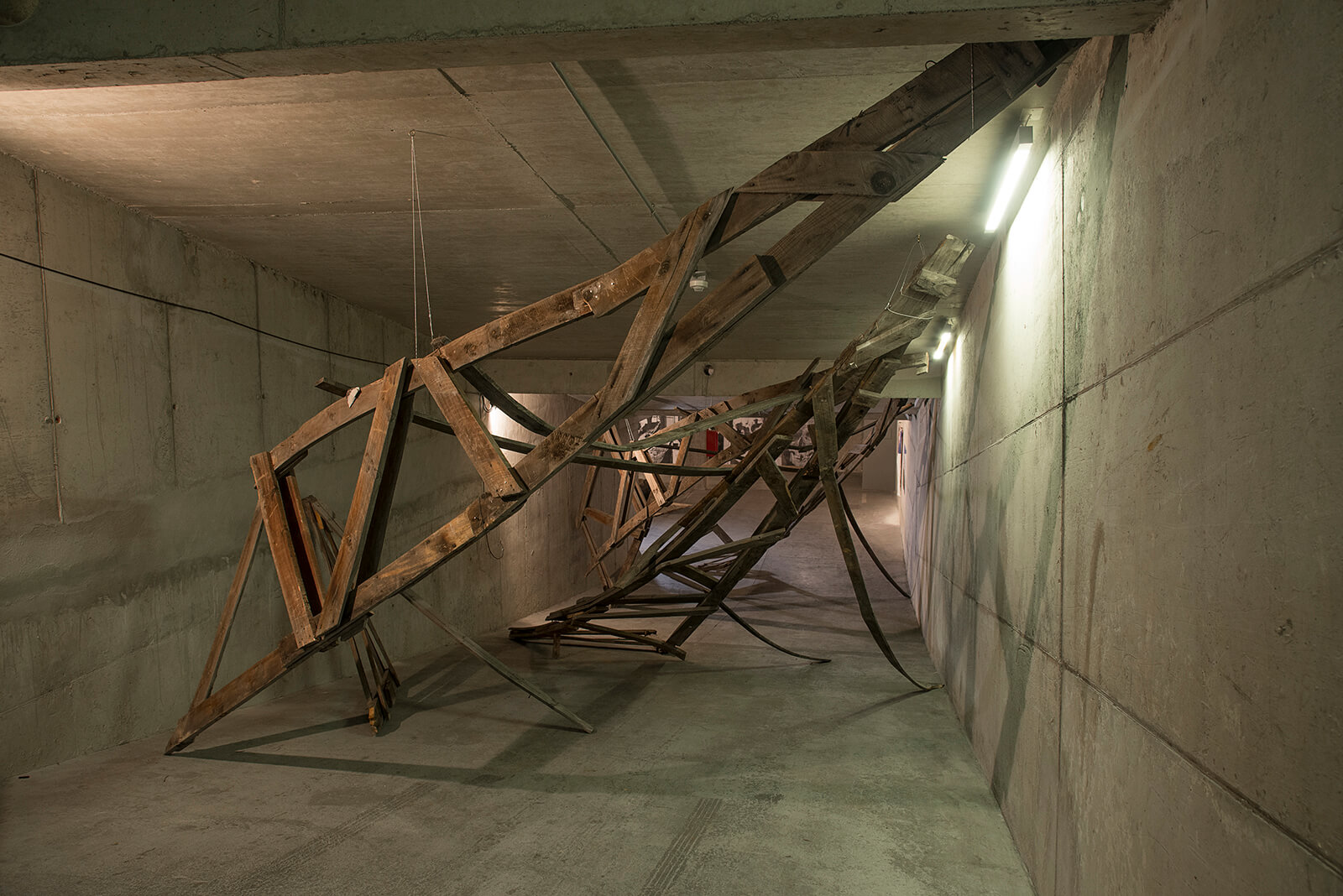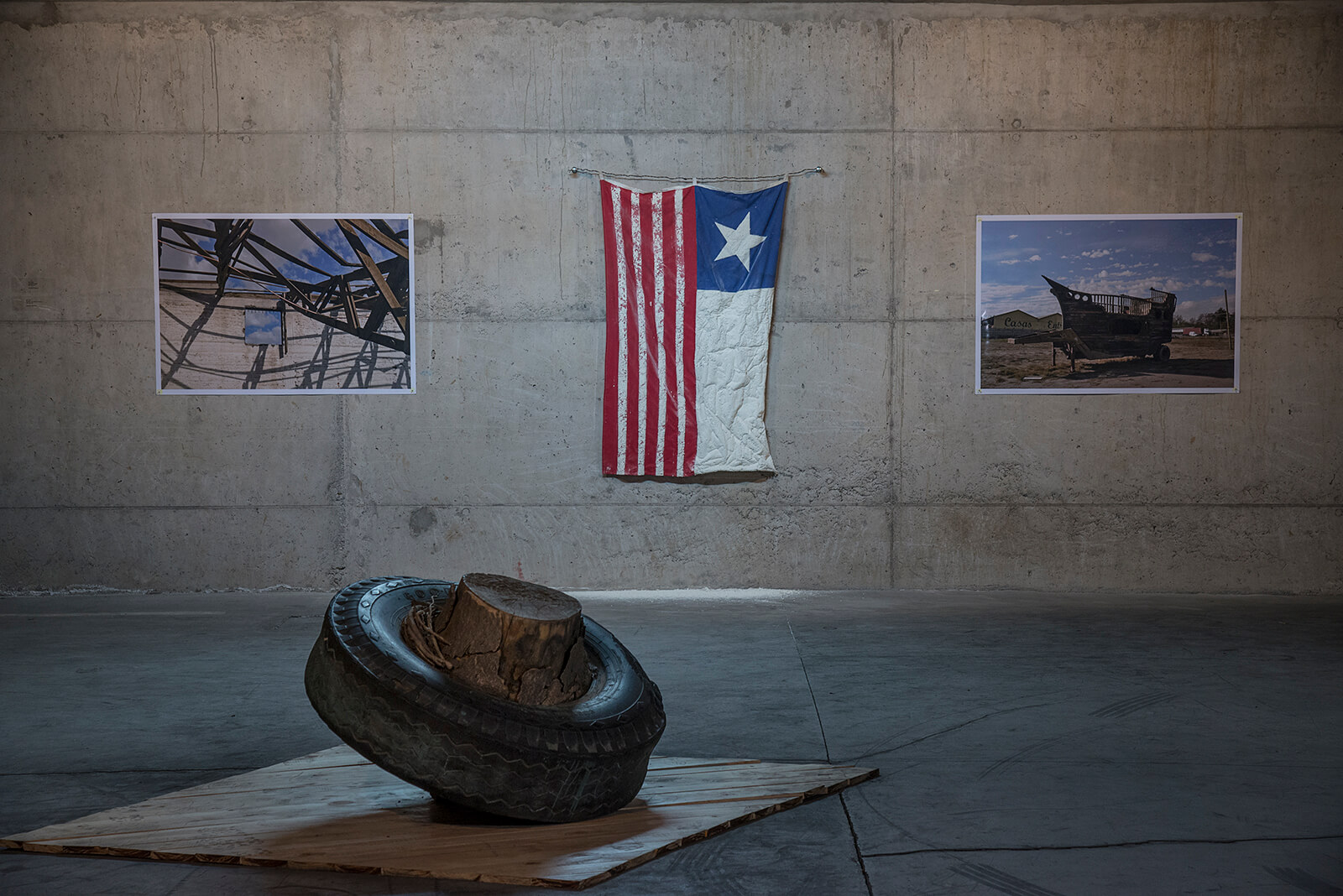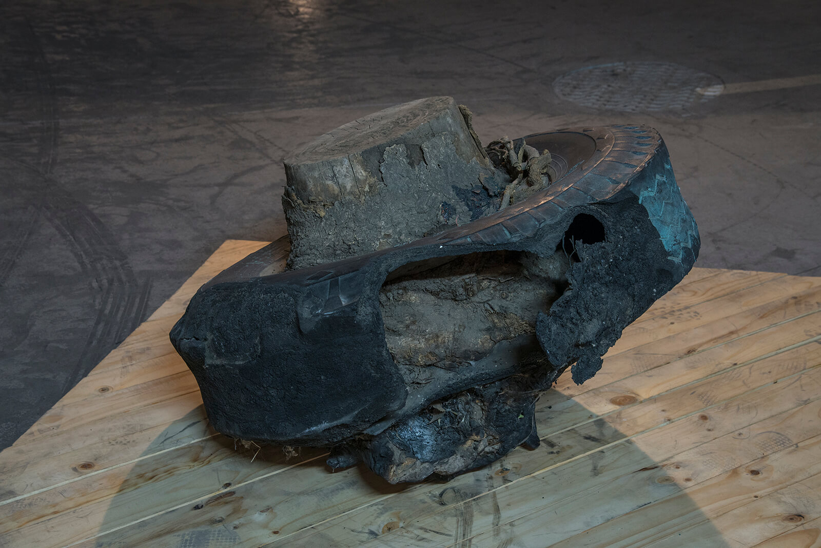 Neumático con tronco incrustado, 200 x 200 x 70 cm.