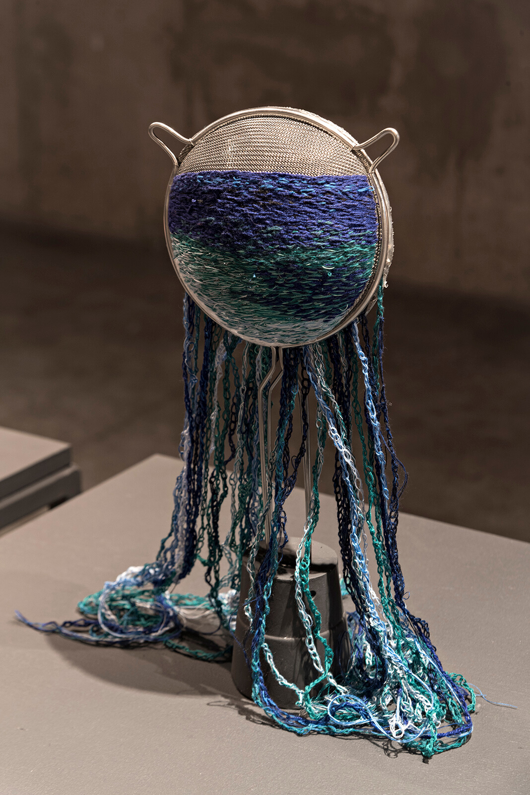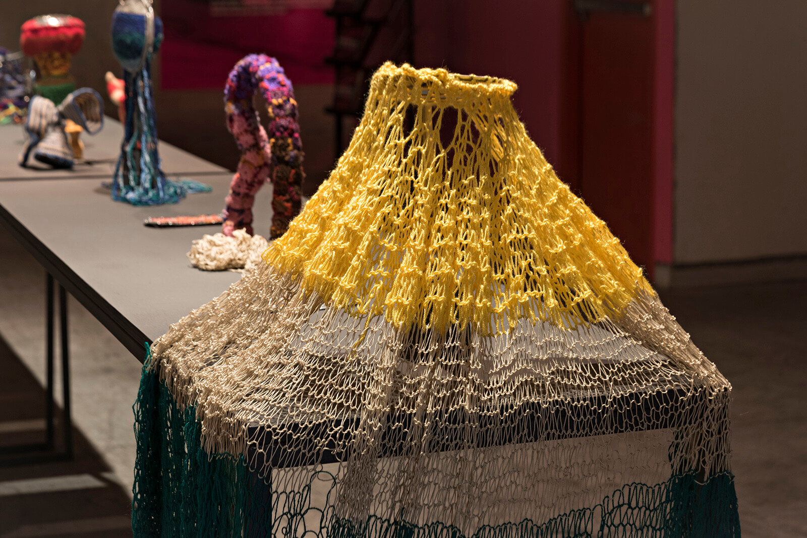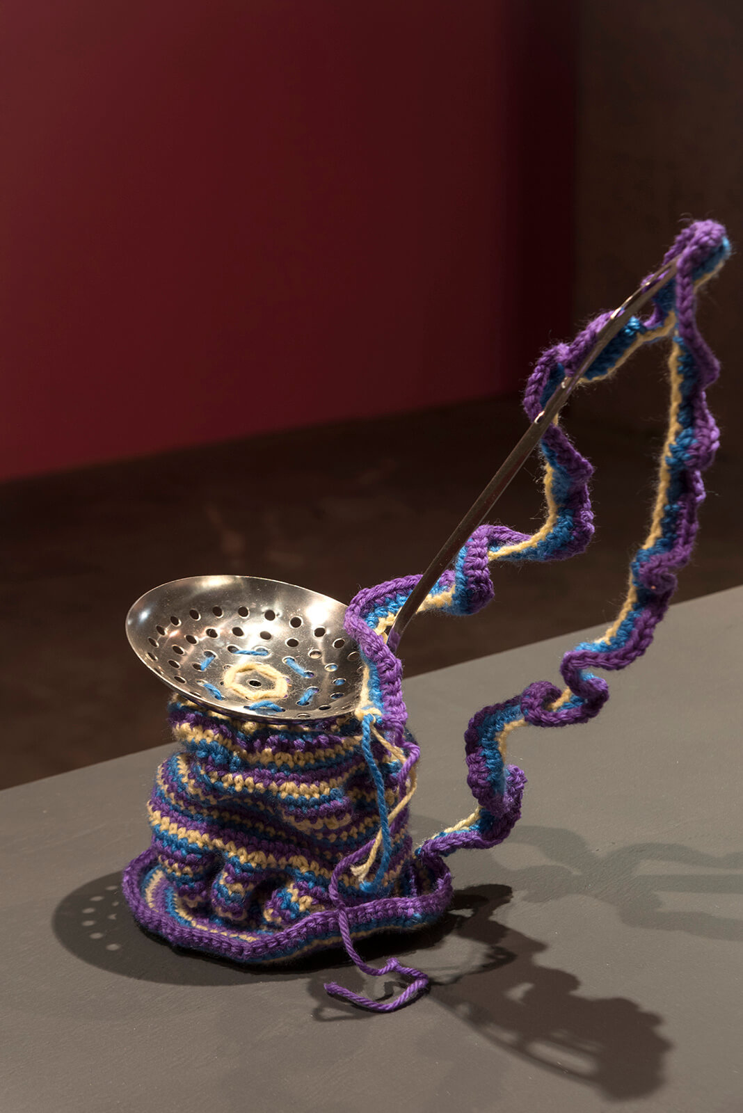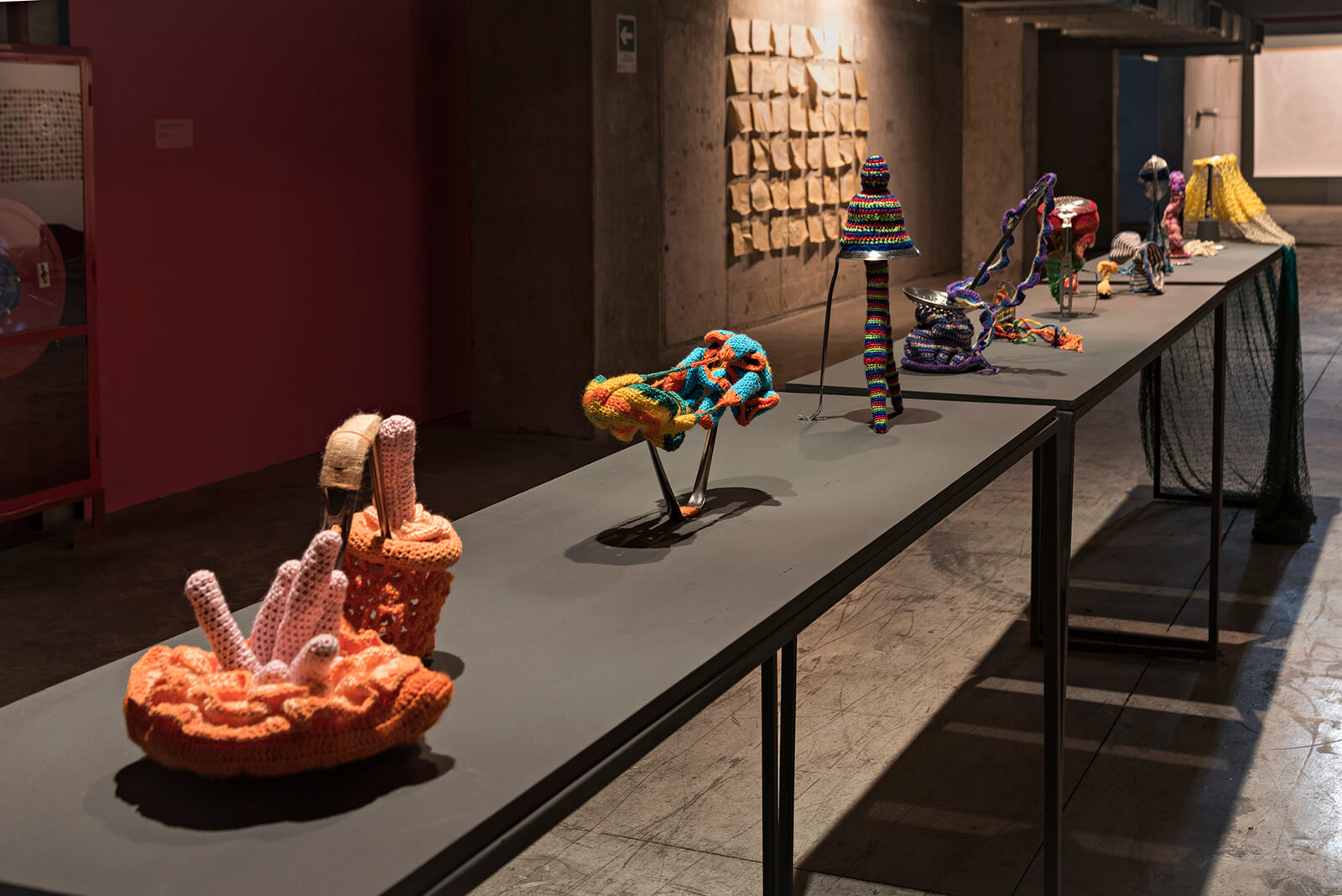 Serie de 13 objetos tejidos con crochet, dimensiones variables.