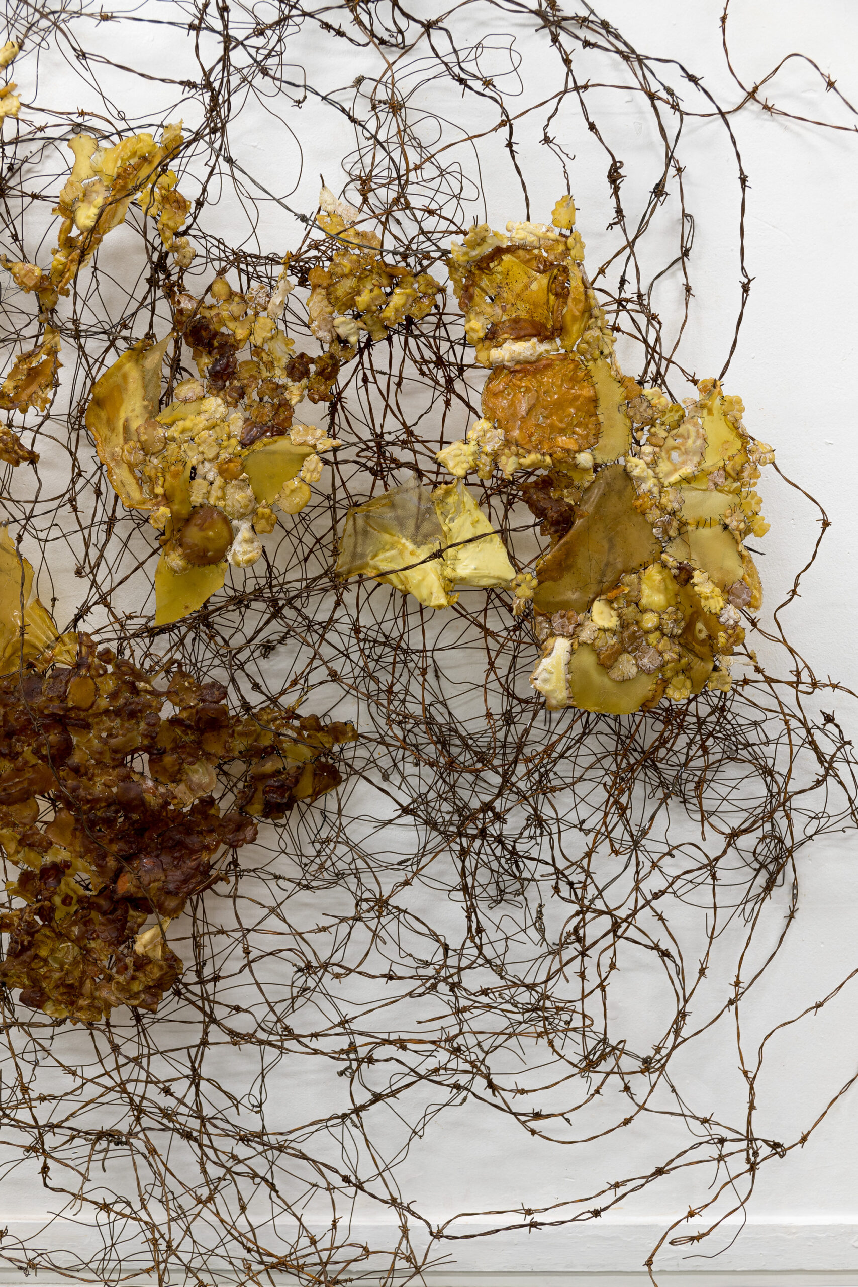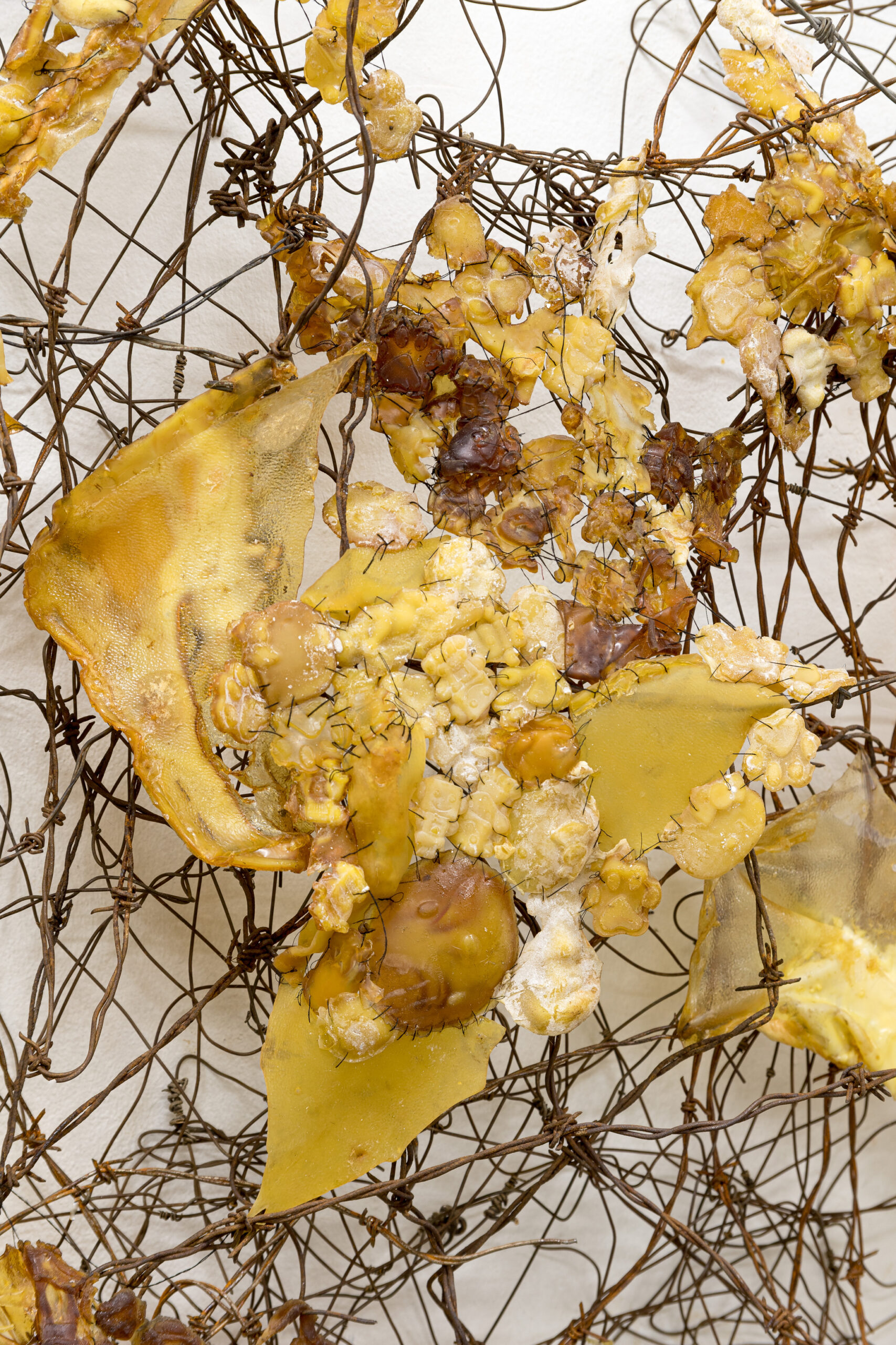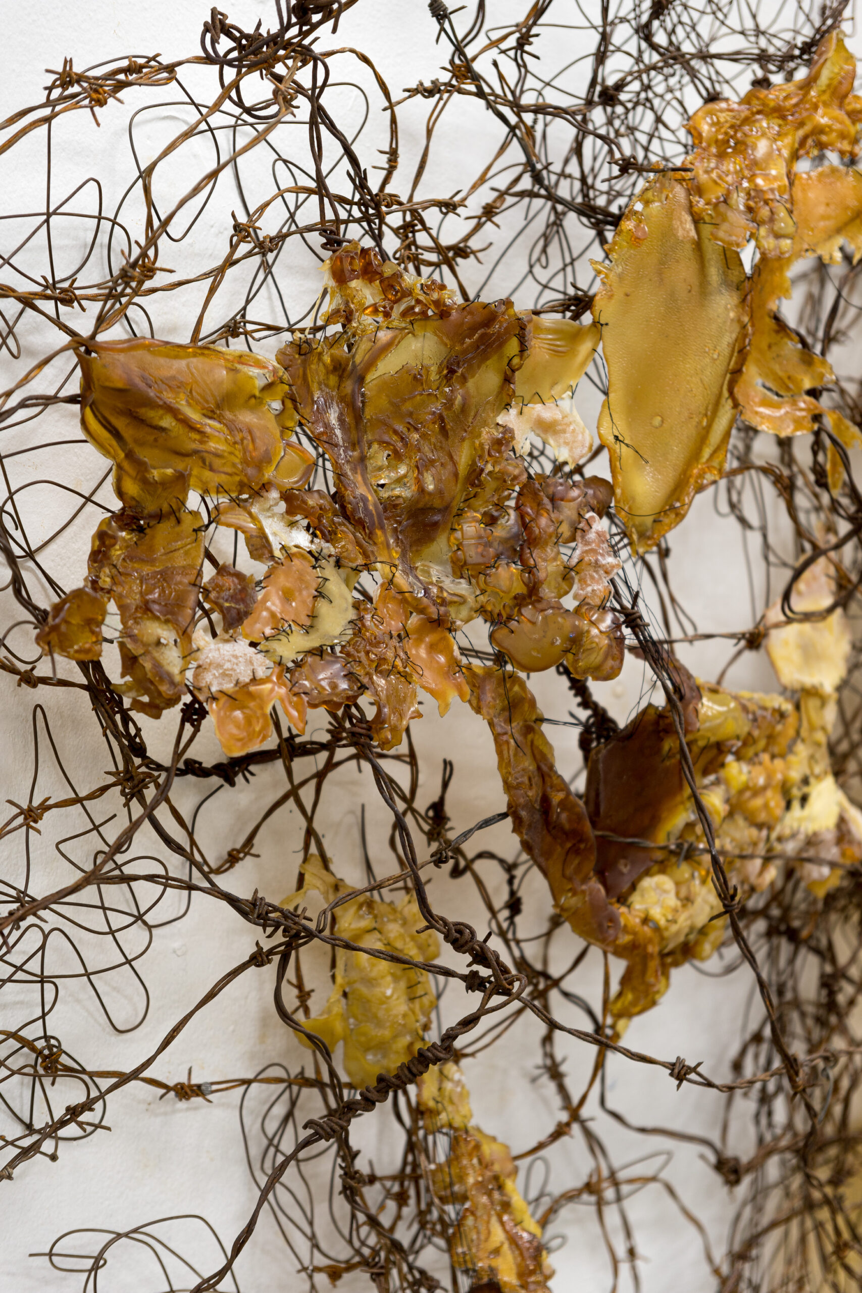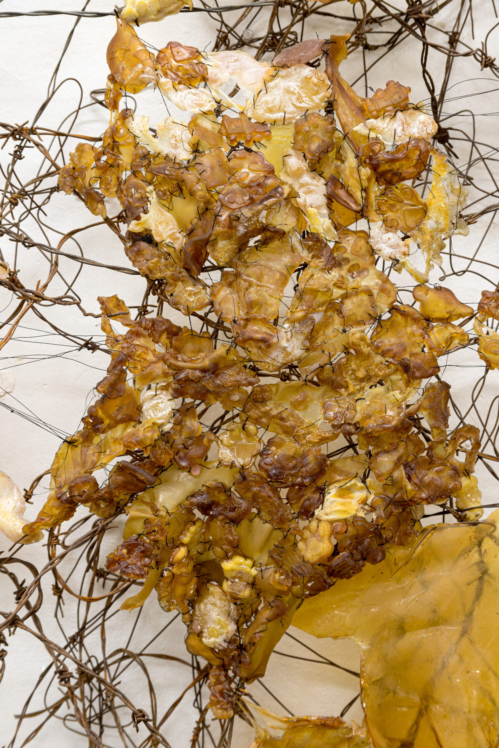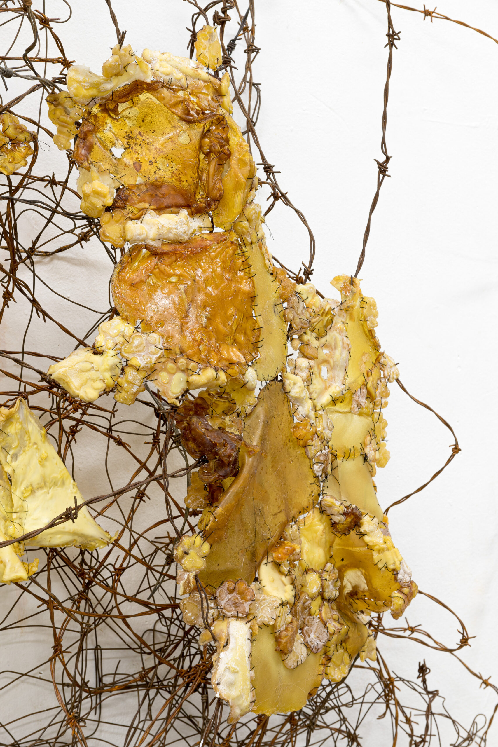 FRANCISCA FLORES. Recuerdos cicatrizados , pieza escultórica de figuras de goma látex entrelazadas entre sí, cocidas sobre base de alambre de púas, 280 x 200 cm, 2024.