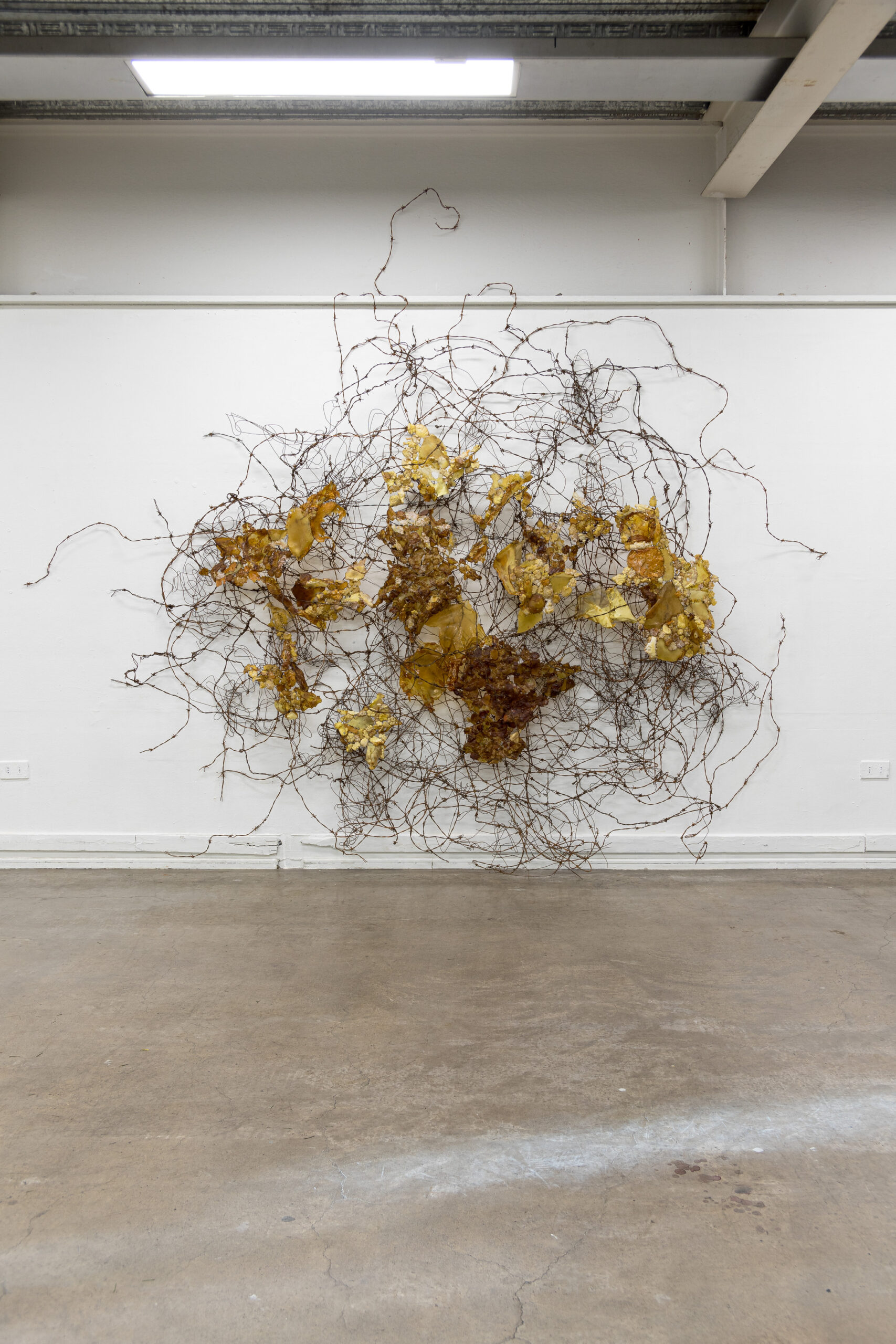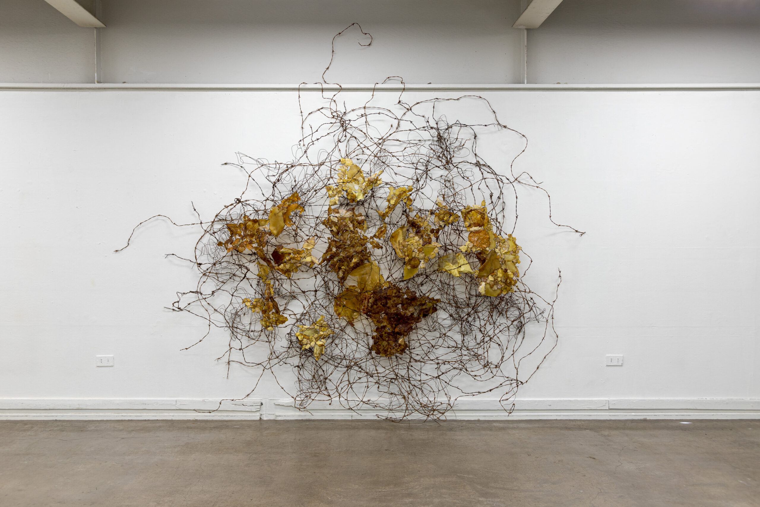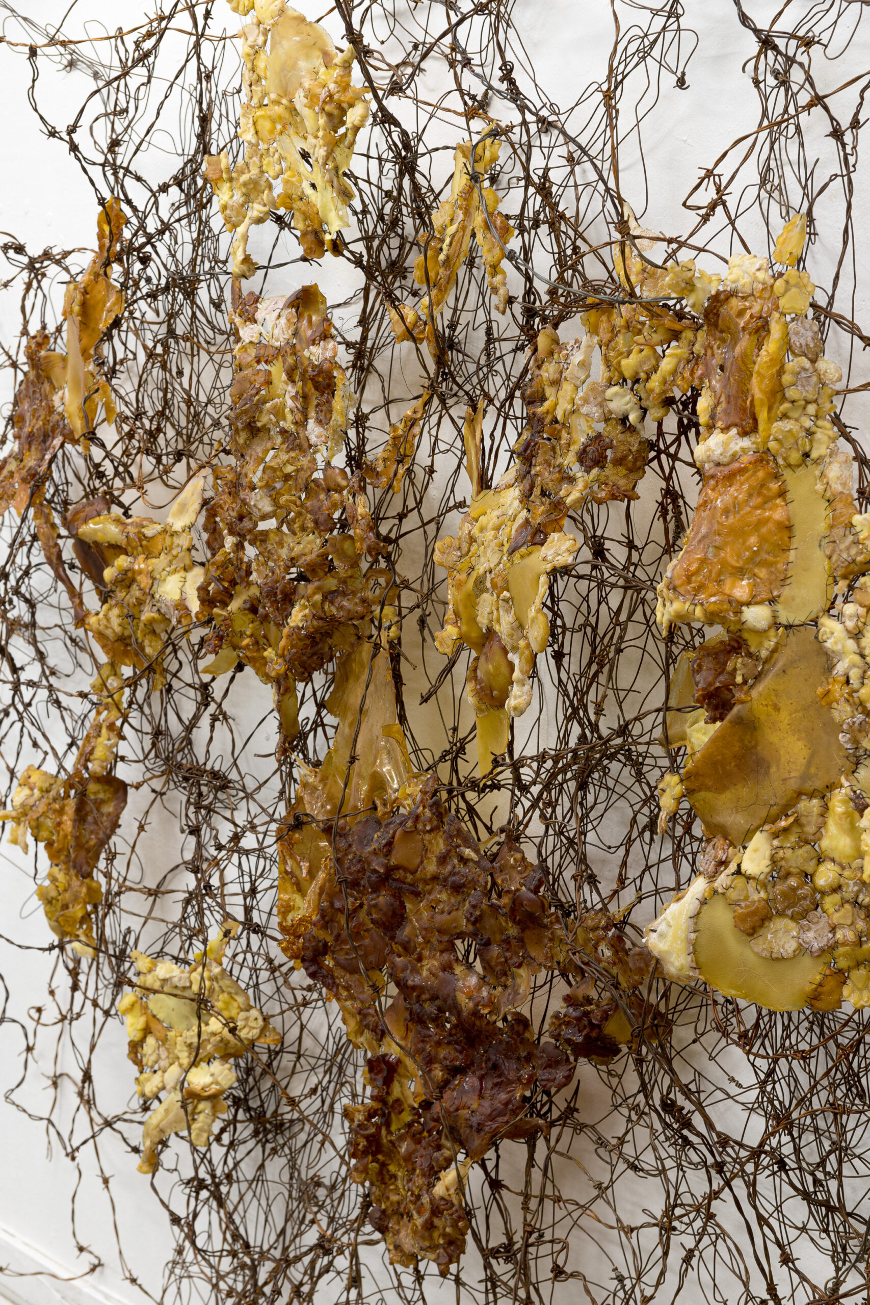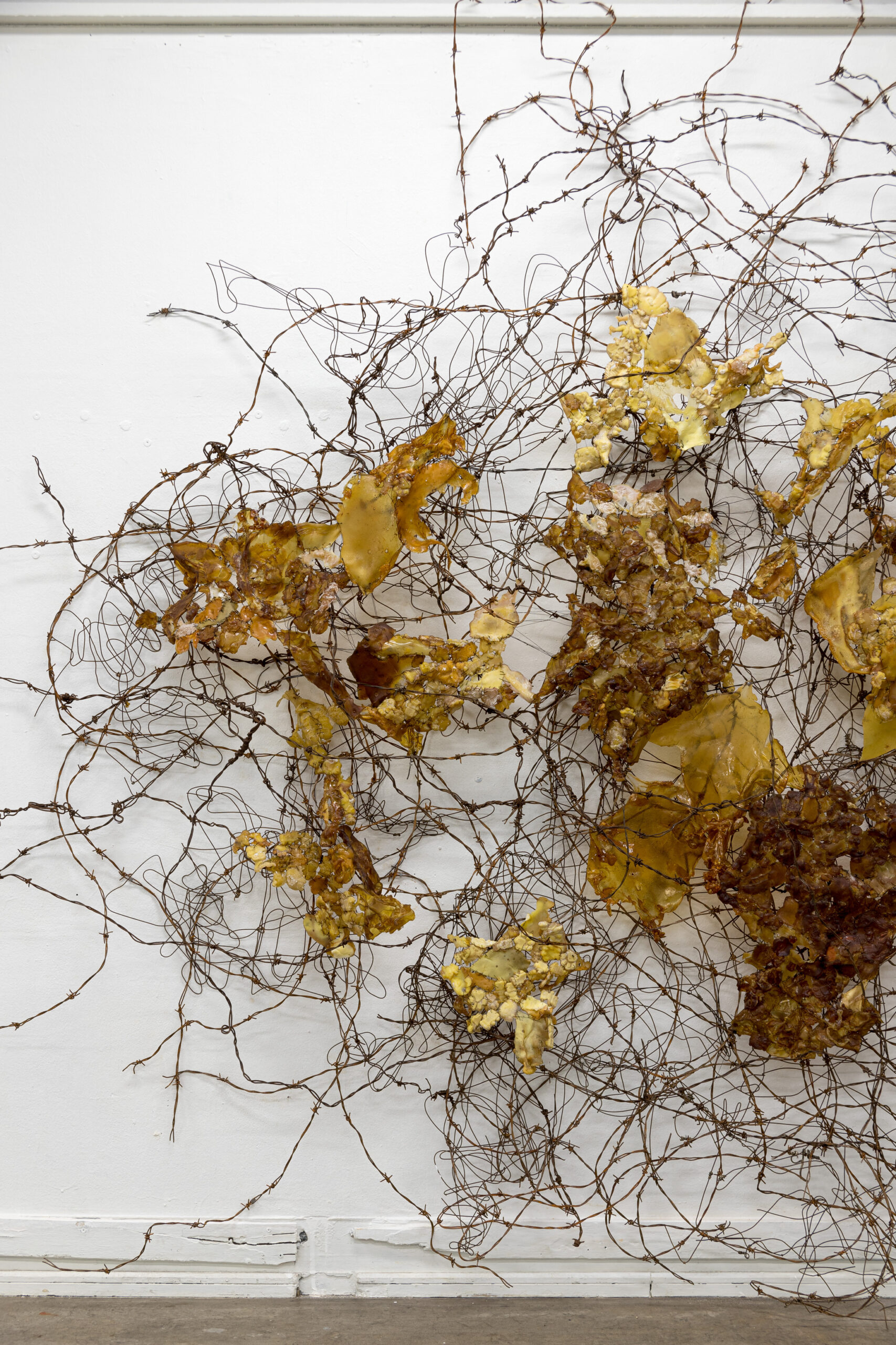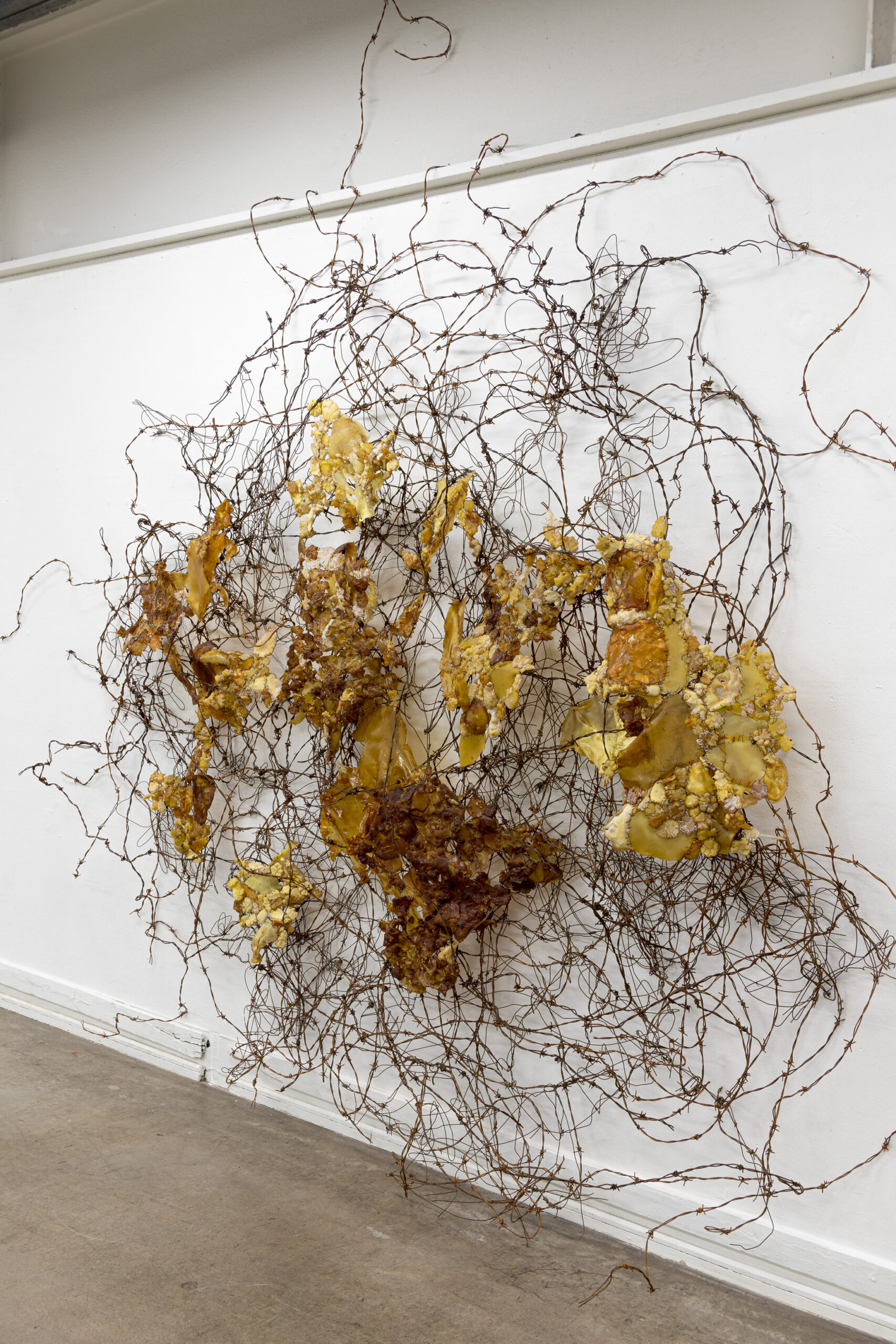 FRANCISCA FLORES. Recuerdos cicatrizados , pieza escultórica de figuras de goma látex entrelazadas entre sí, cocidas sobre base de alambre de púas, 280 x 200 cm, 2024.