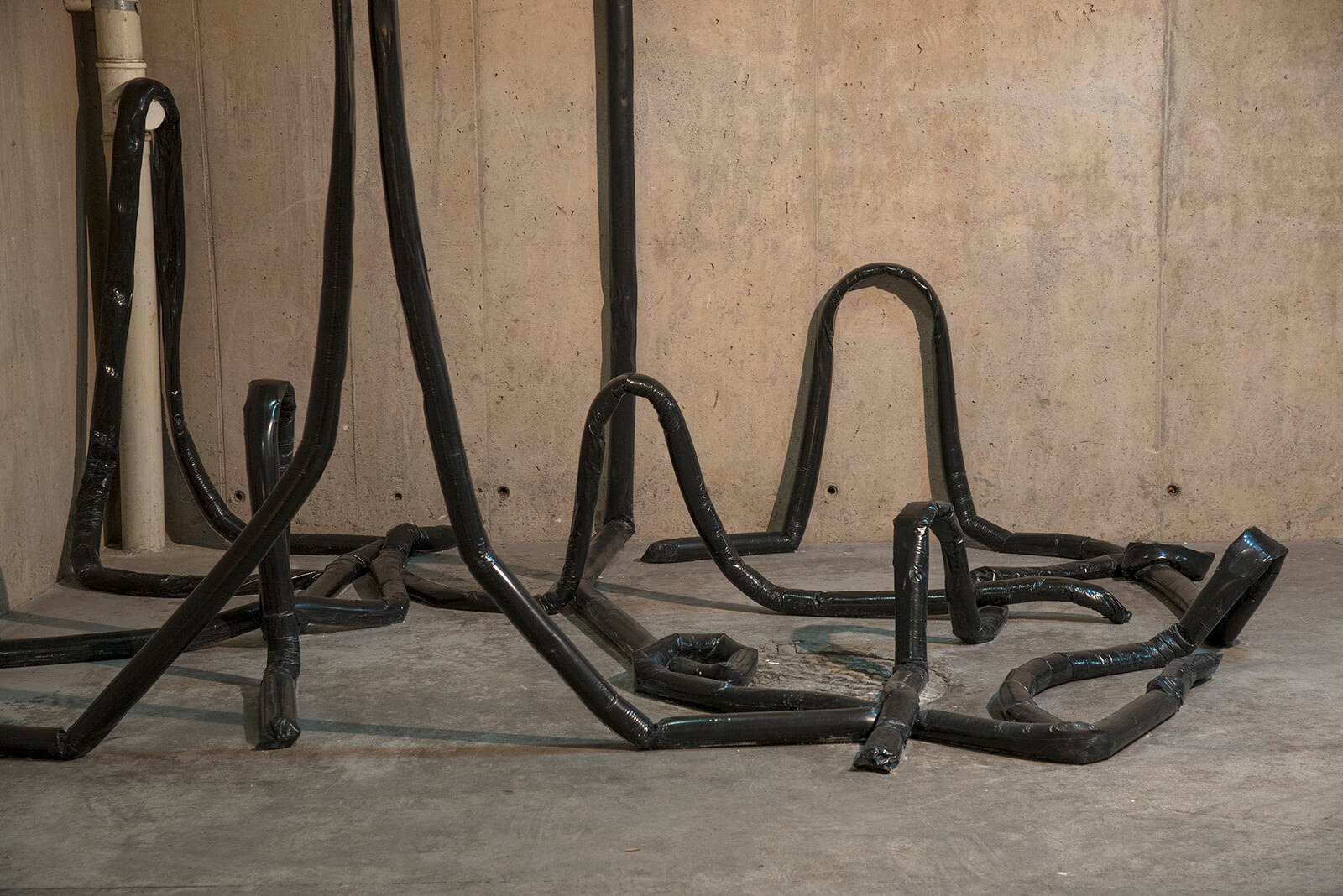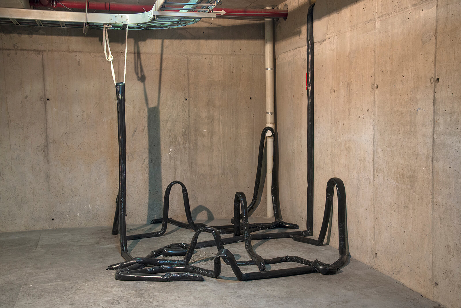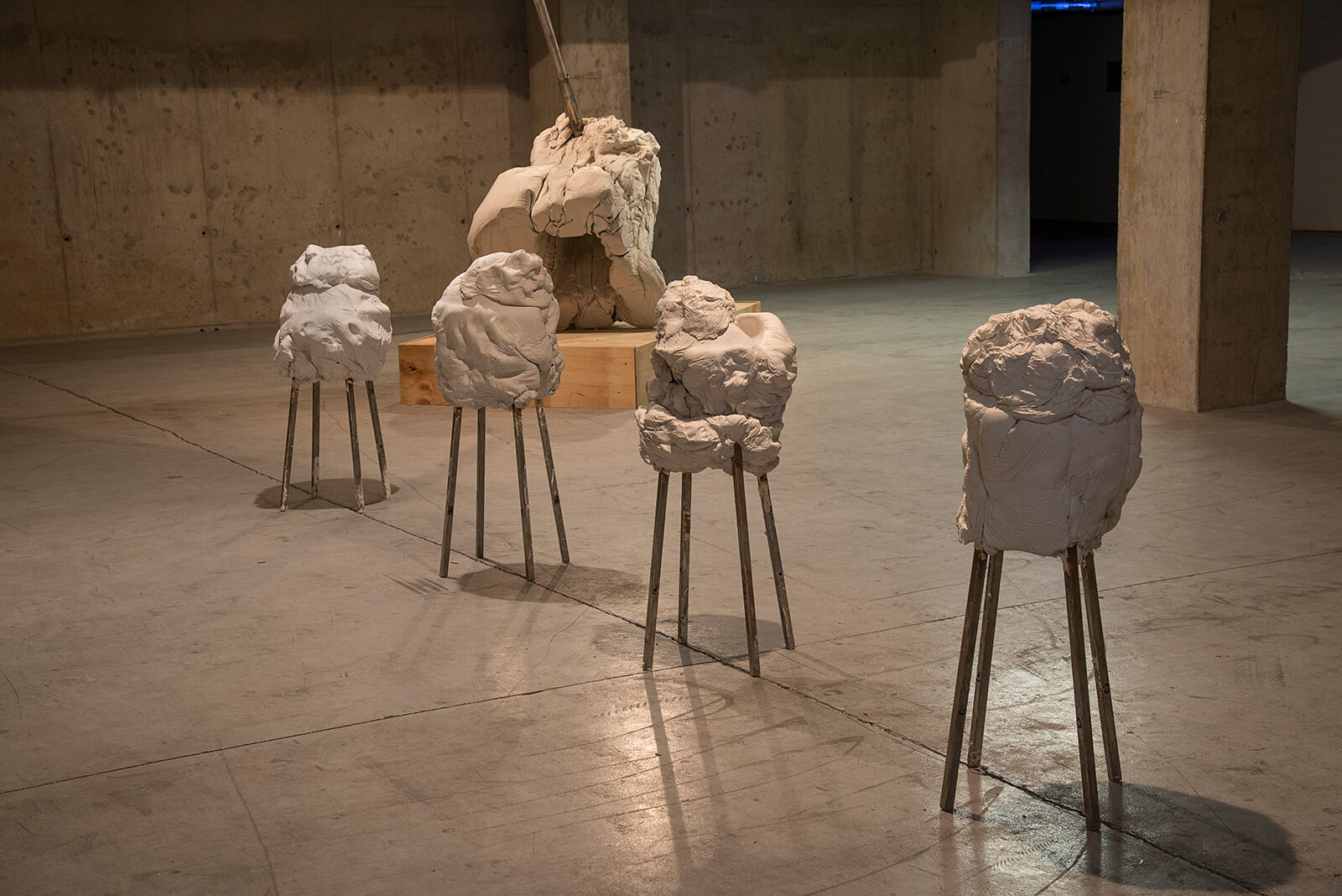 Gabriela Montenegro, La forma sin forma, 2014. Yeso, fierro, madera, mangas plásticas. Dimensiones variables.