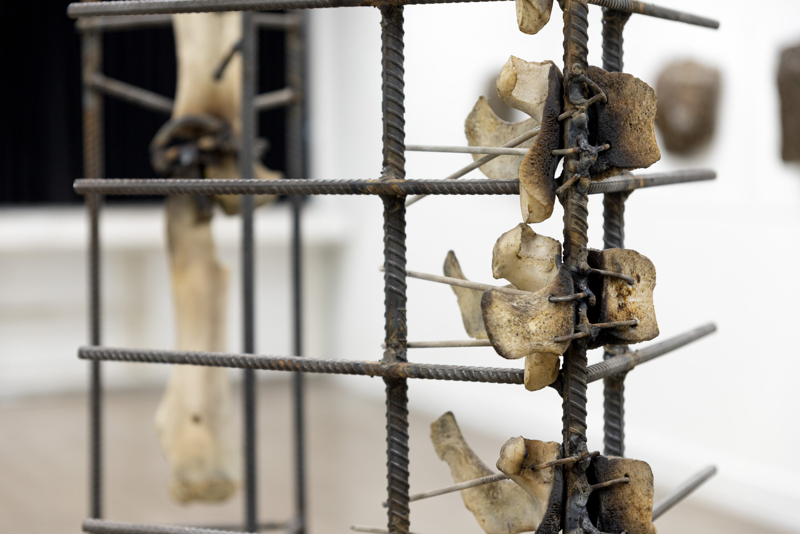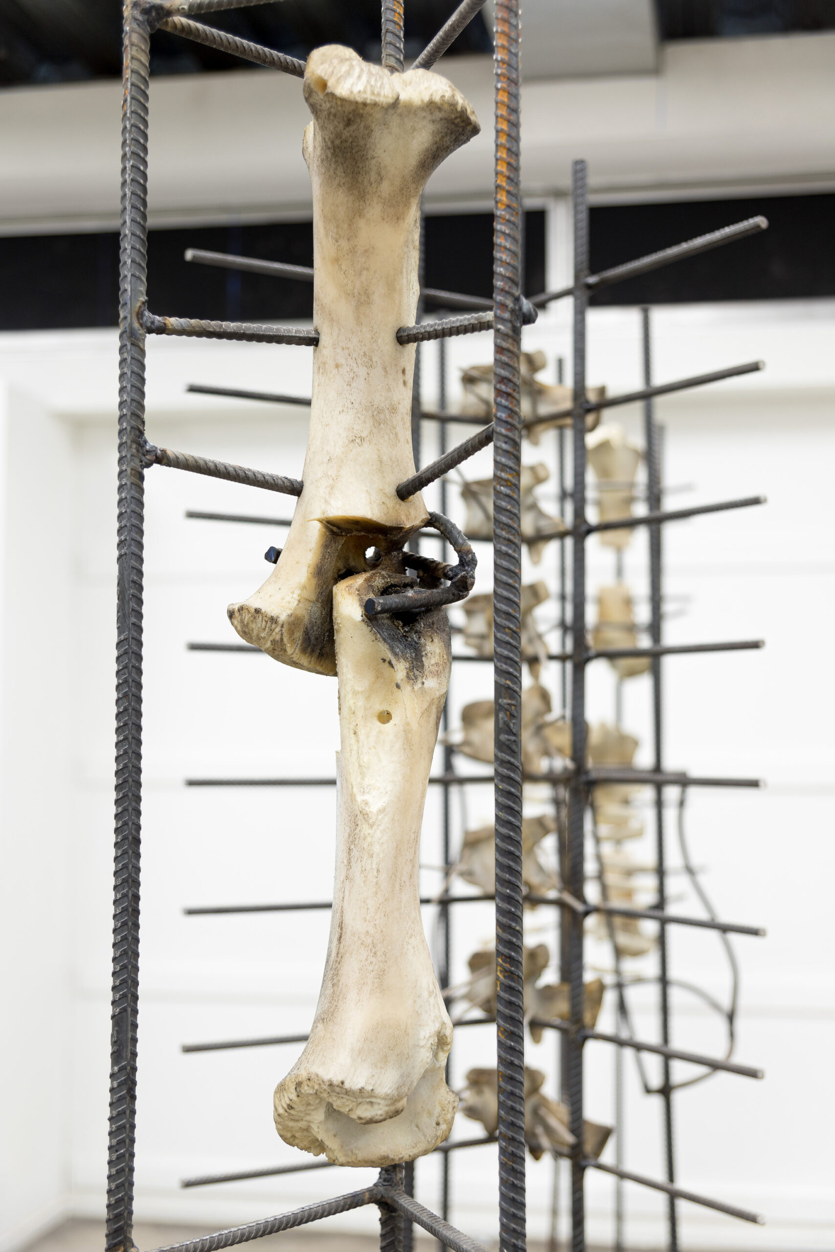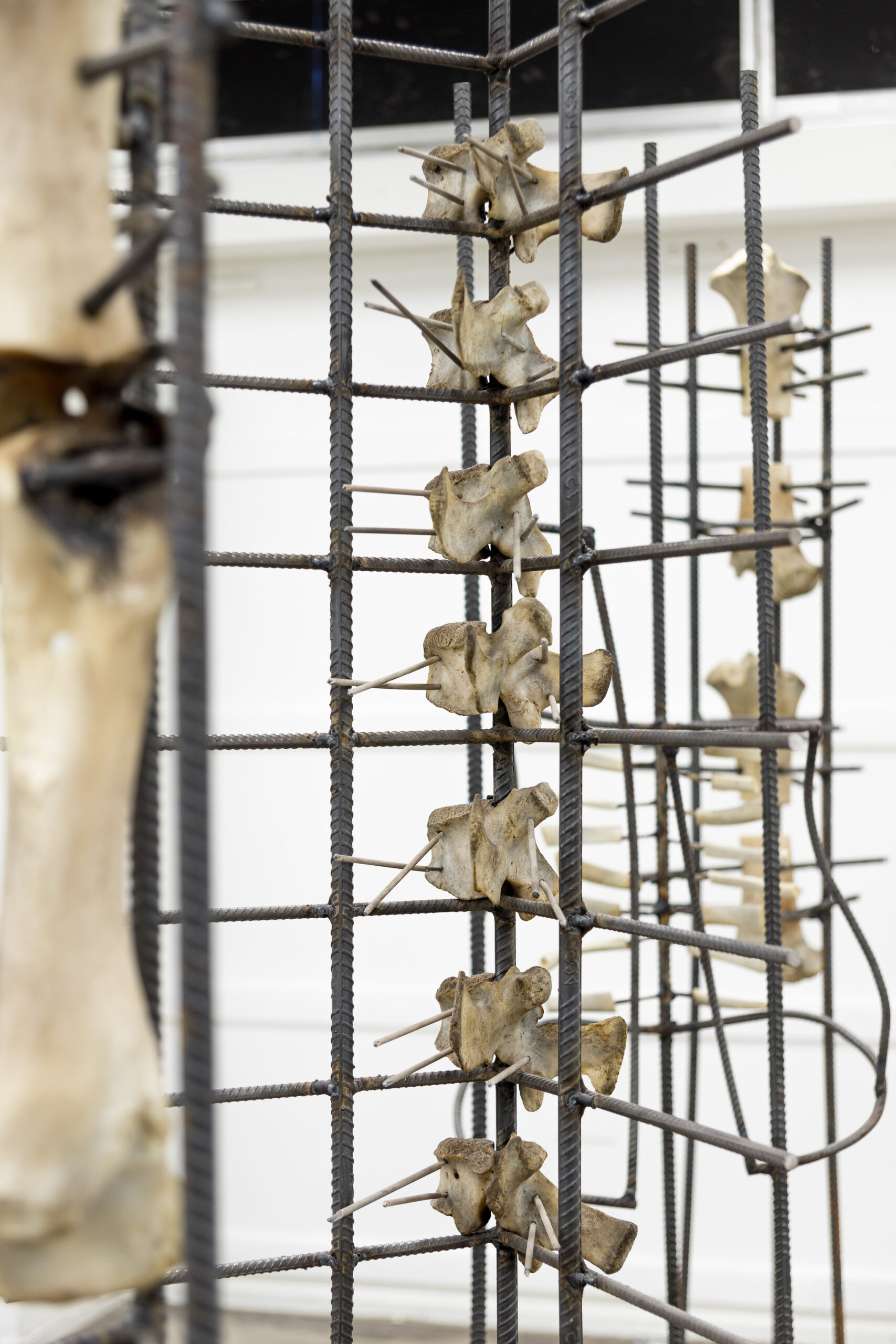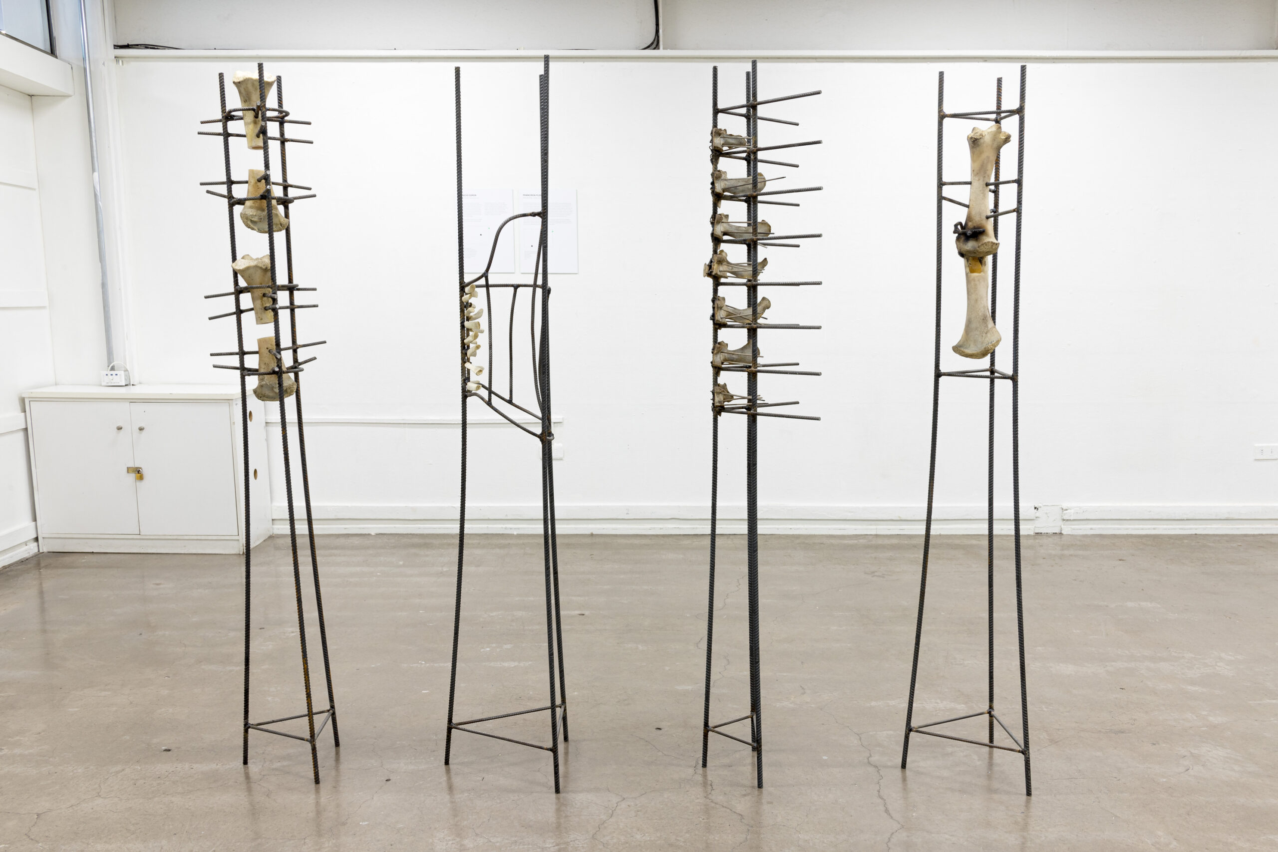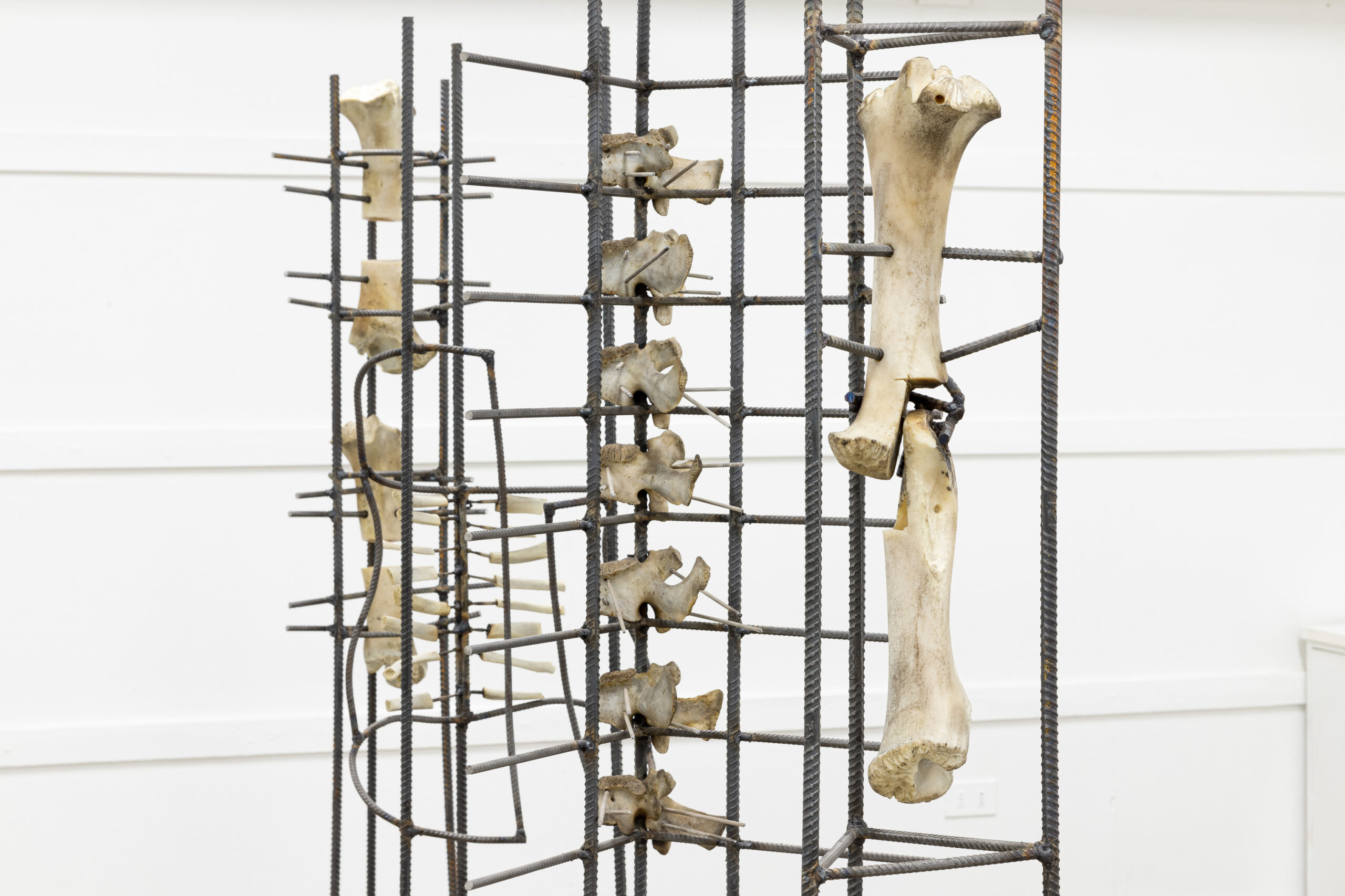 IGNACIO CERDA, Reparación Estructural , serie de cinco esculturas con fierro estriado (Barras de acero) y hueso de animal (Costillas de cerdo y vértebras y fémures de vacuno) junto con tornillos, abrazaderas, tubos de goma transparentes y electrodos, dimensiones variables, 2024.