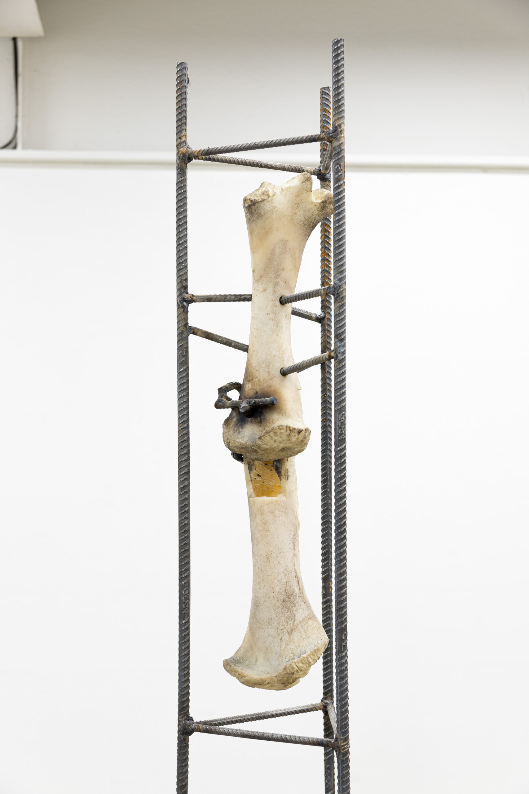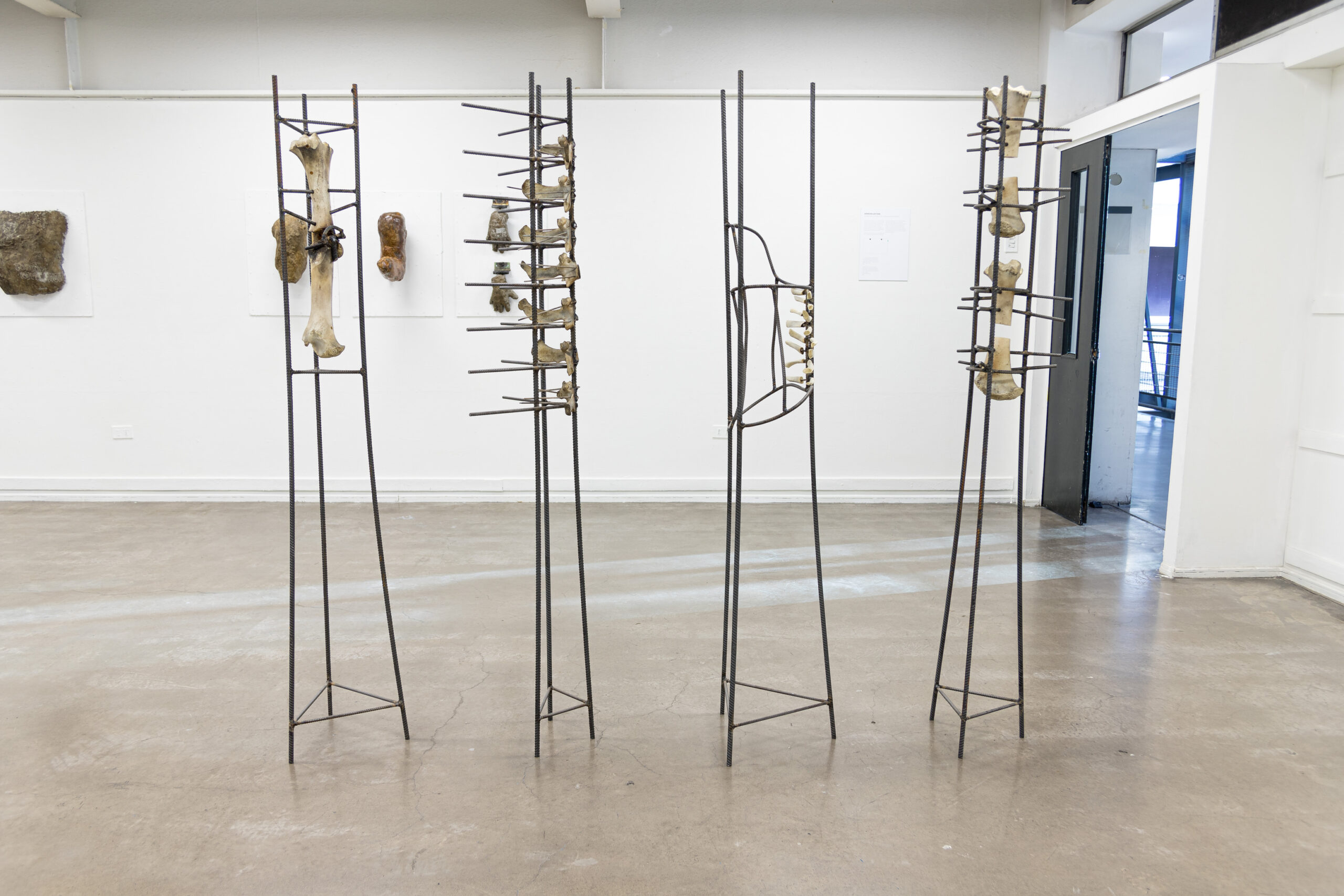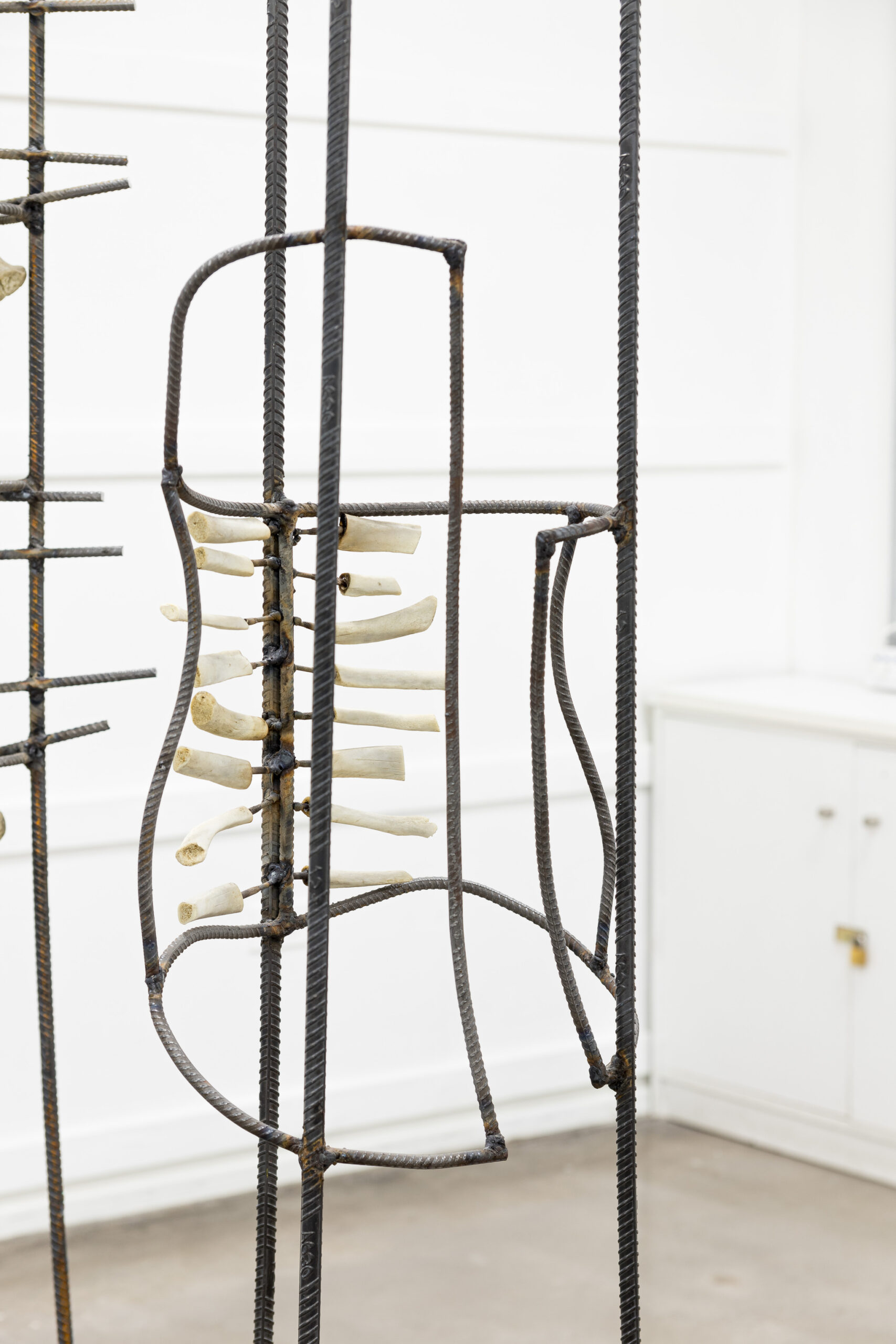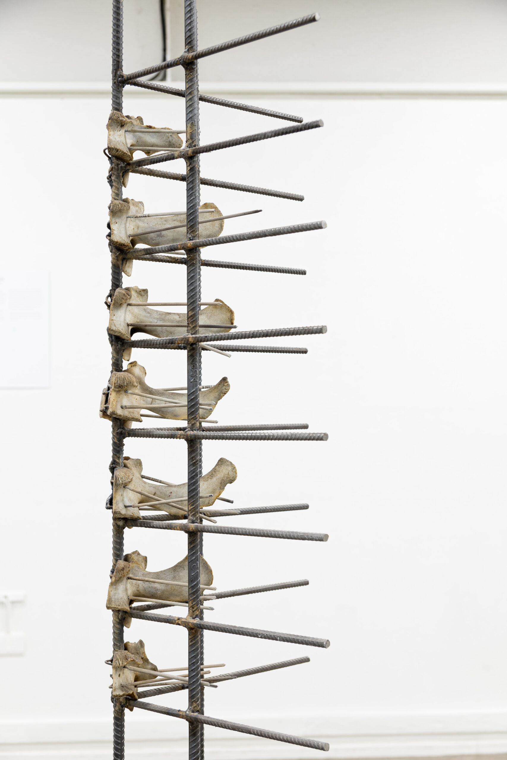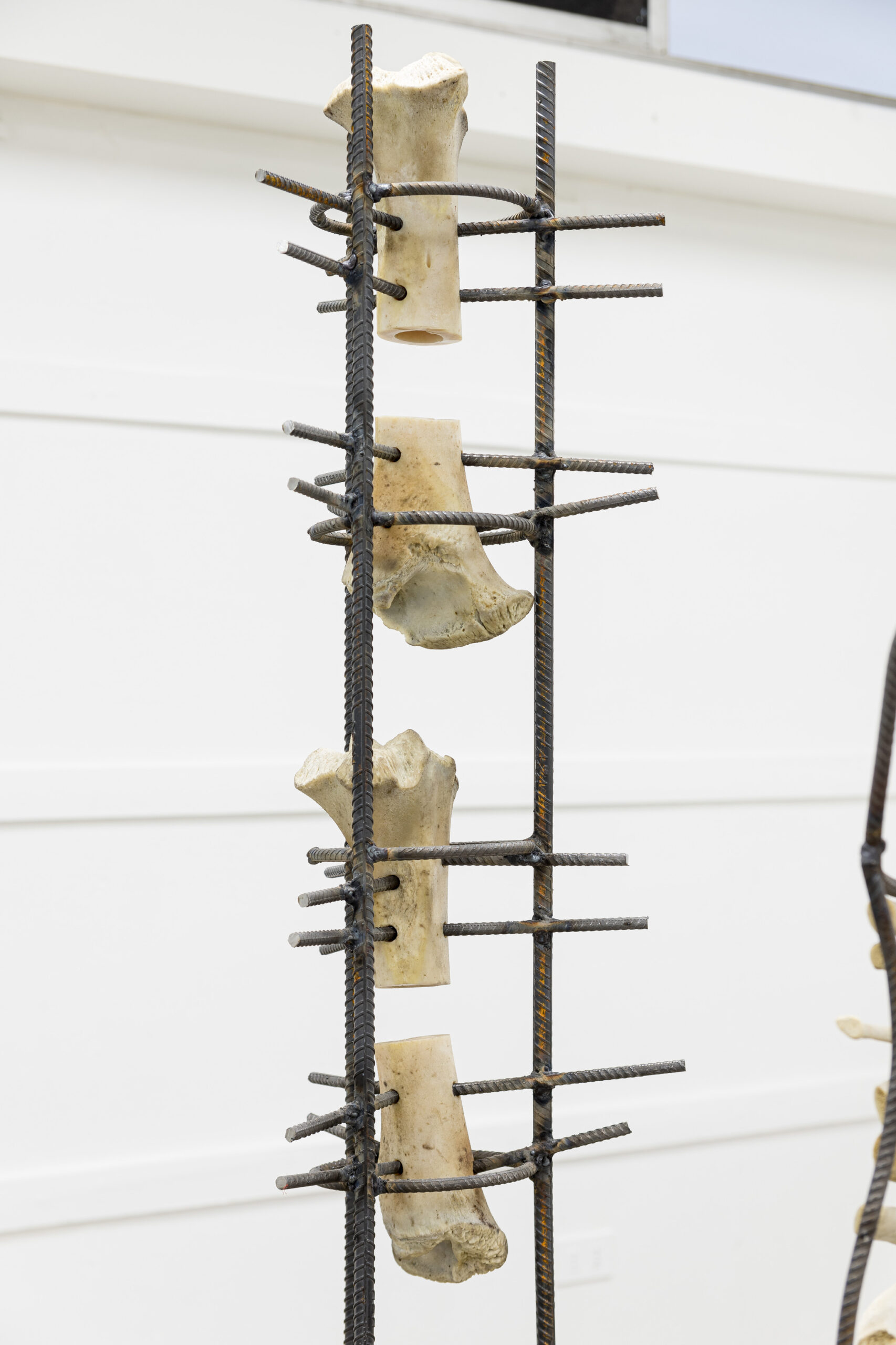 IGNACIO CERDA, Reparación Estructural , serie de cinco esculturas con fierro estriado (Barras de acero) y hueso de animal (Costillas de cerdo y vértebras y fémures de vacuno) junto con tornillos, abrazaderas, tubos de goma transparentes y electrodos, dimensiones variables, 2024.