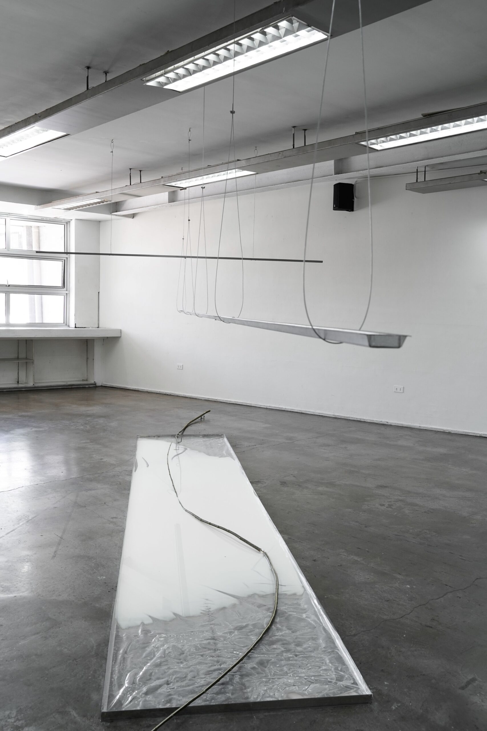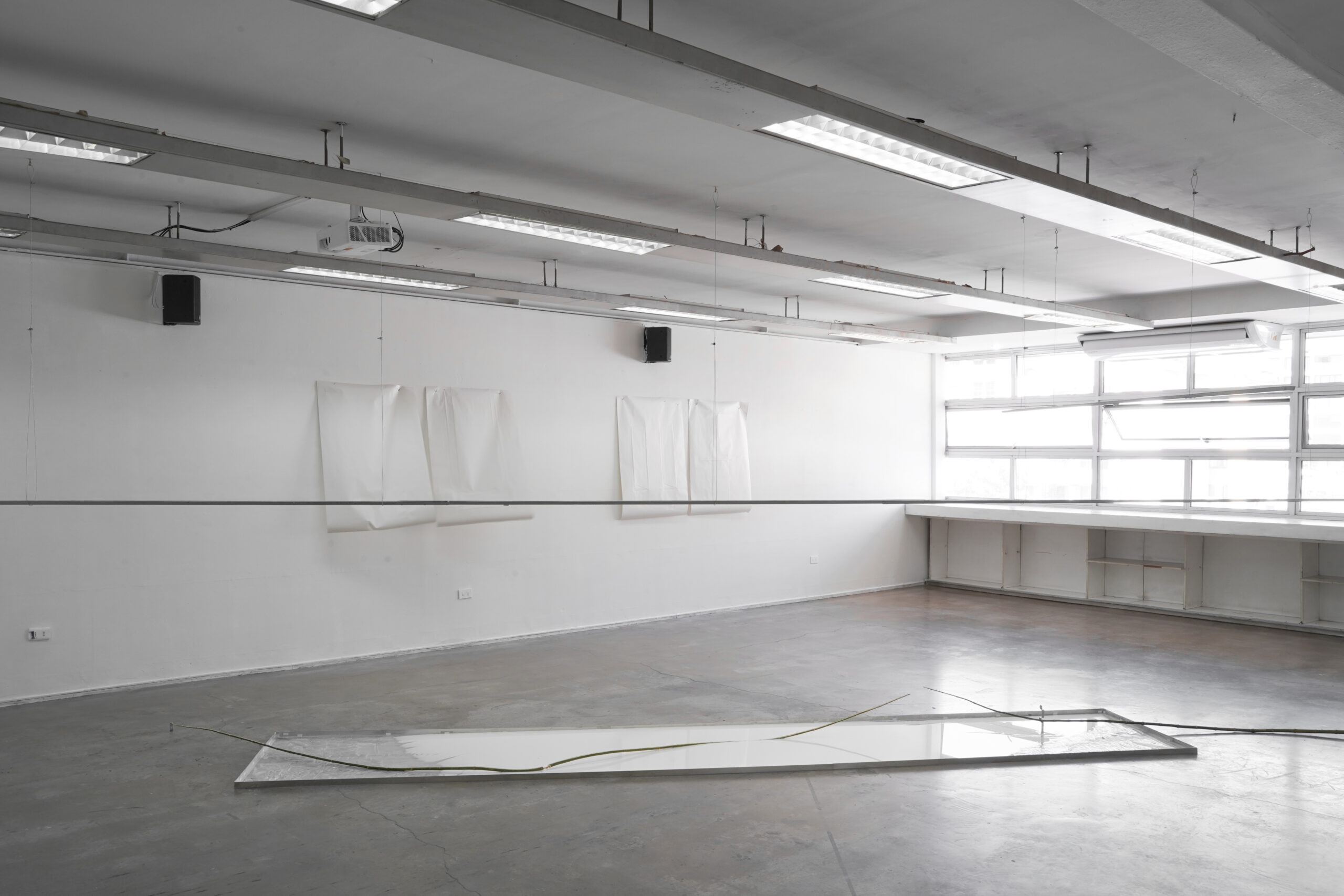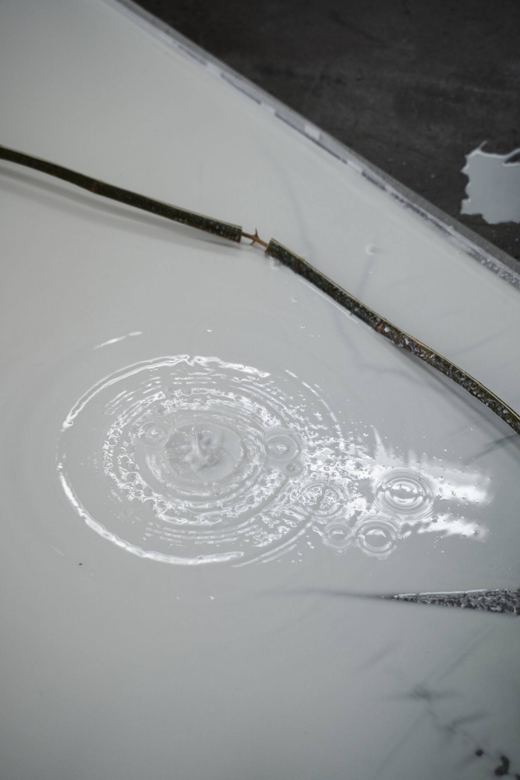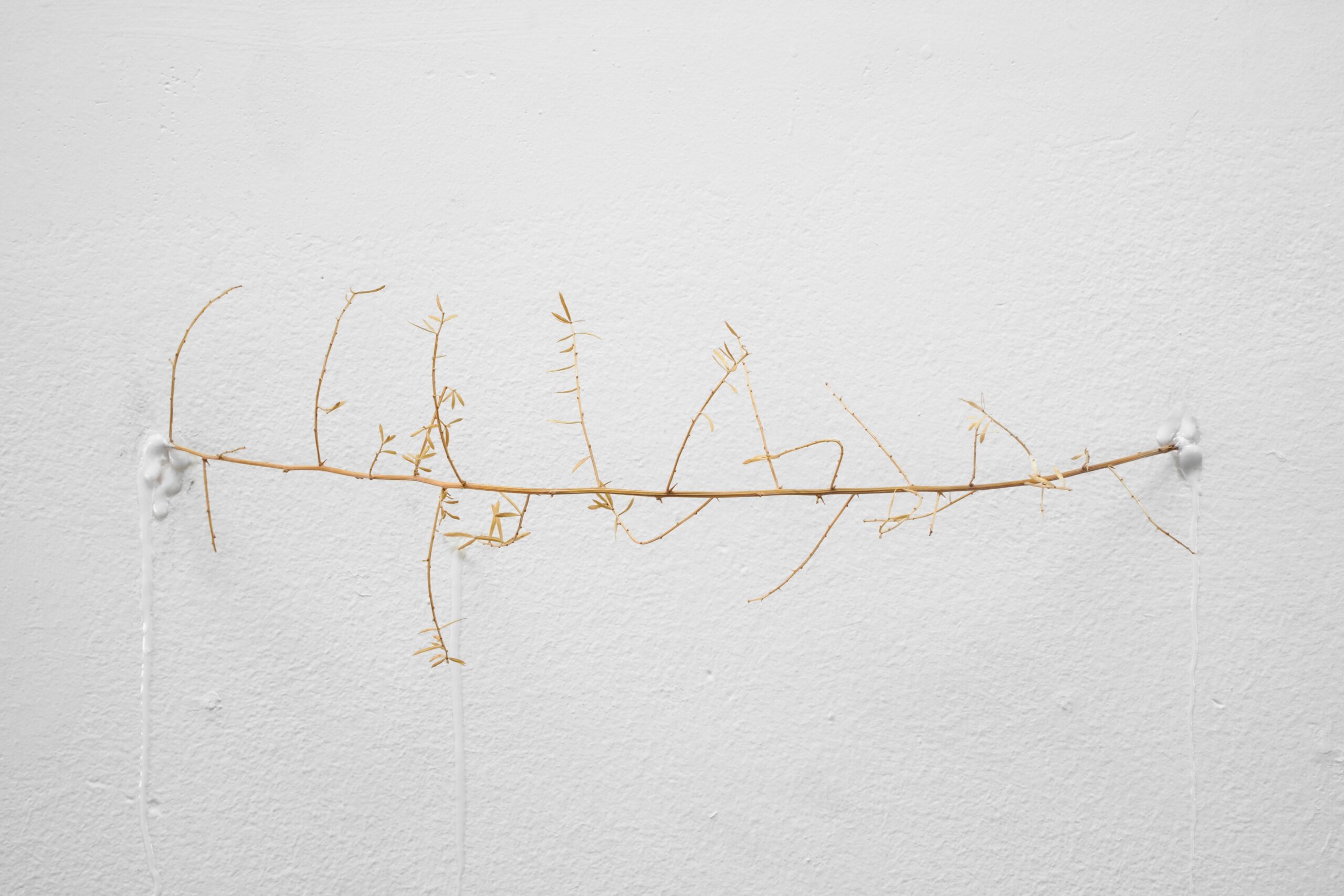 Leche de vaca industrial, rama silvestre encontrada, piezas de metal cromado, canaletas omega metalcom, gotero, perfiles de metal, cables de metal, abrazaderas. Dibujo y pliegues sobre papel de imprenta, grafito, papel de imprenta, espinas. Medidas variables