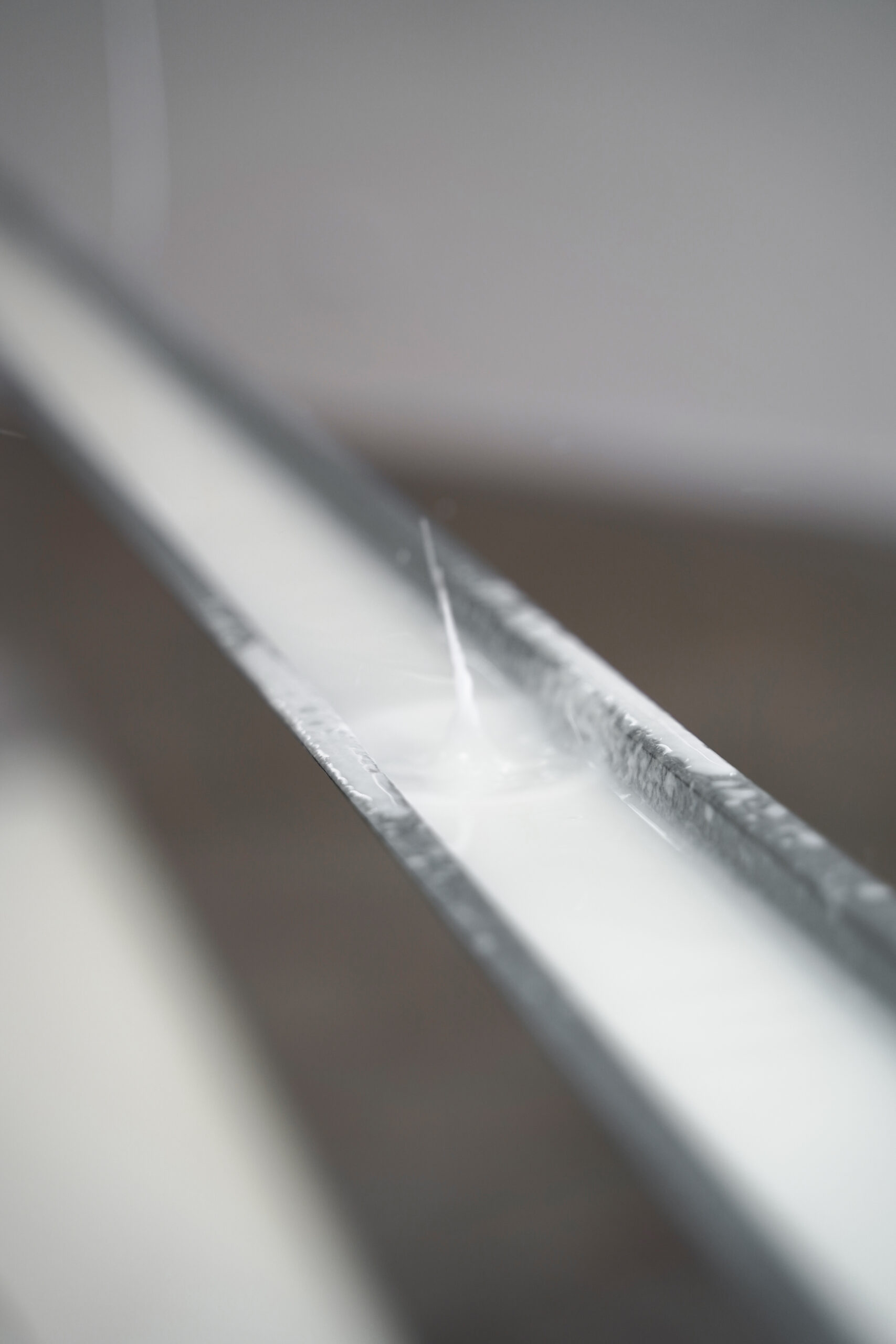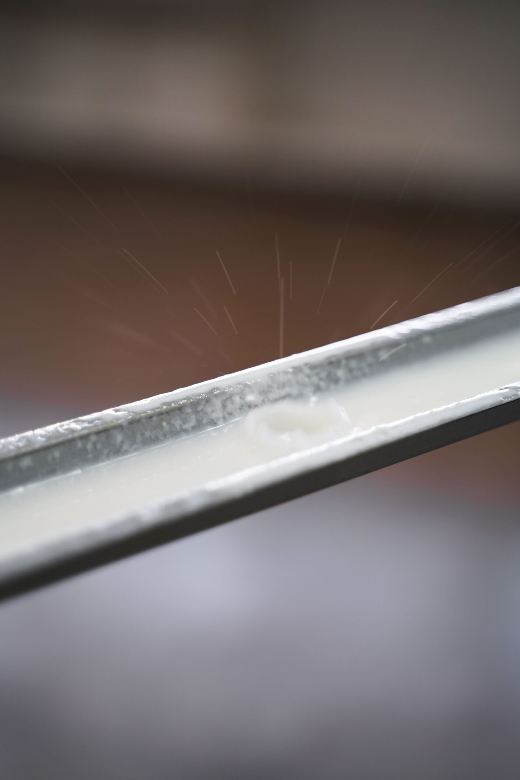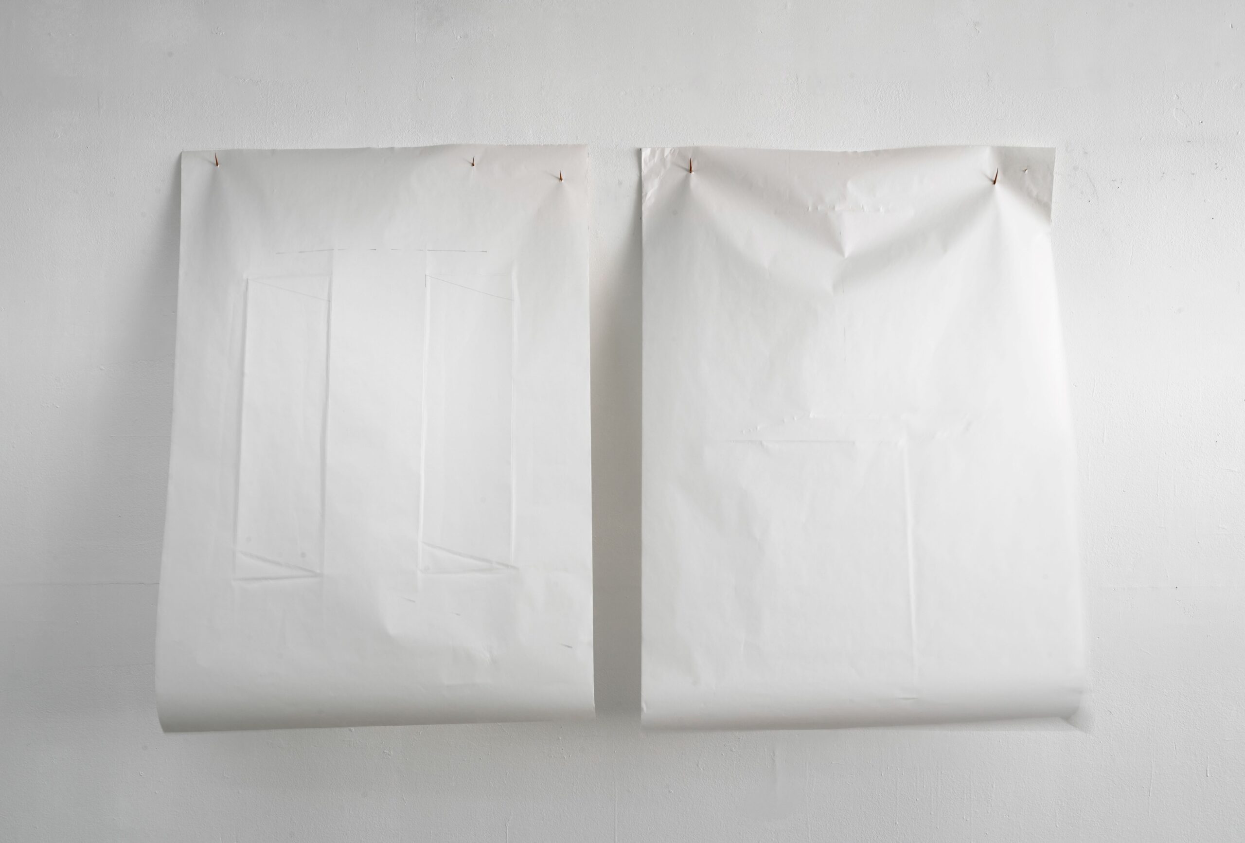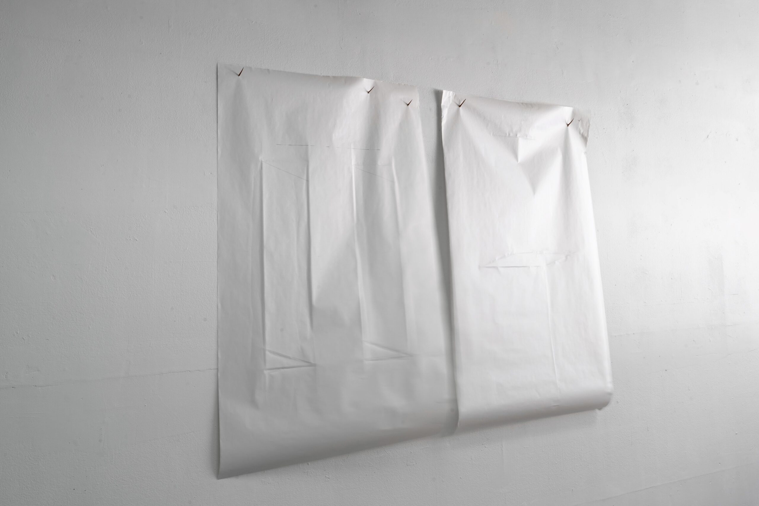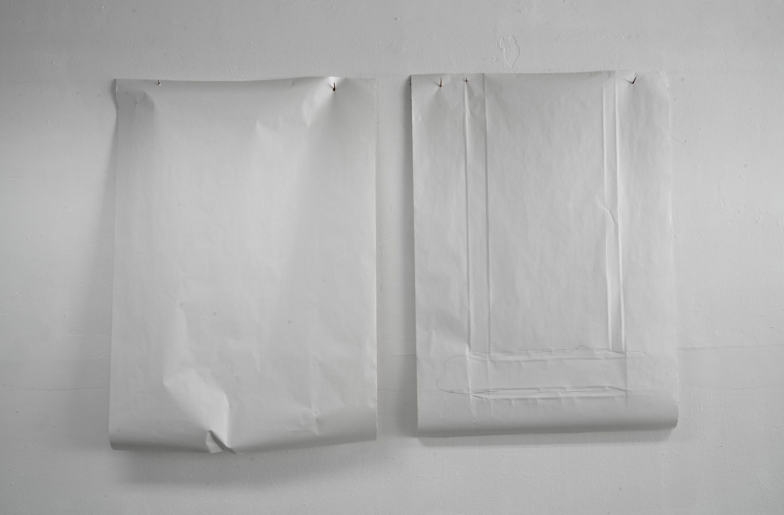 Leche de vaca industrial, rama silvestre encontrada, piezas de metal cromado, canaletas omega metalcom, gotero, perfiles de metal, cables de metal, abrazaderas. Dibujo y pliegues sobre papel de imprenta, grafito, papel de imprenta, espinas. Medidas variables