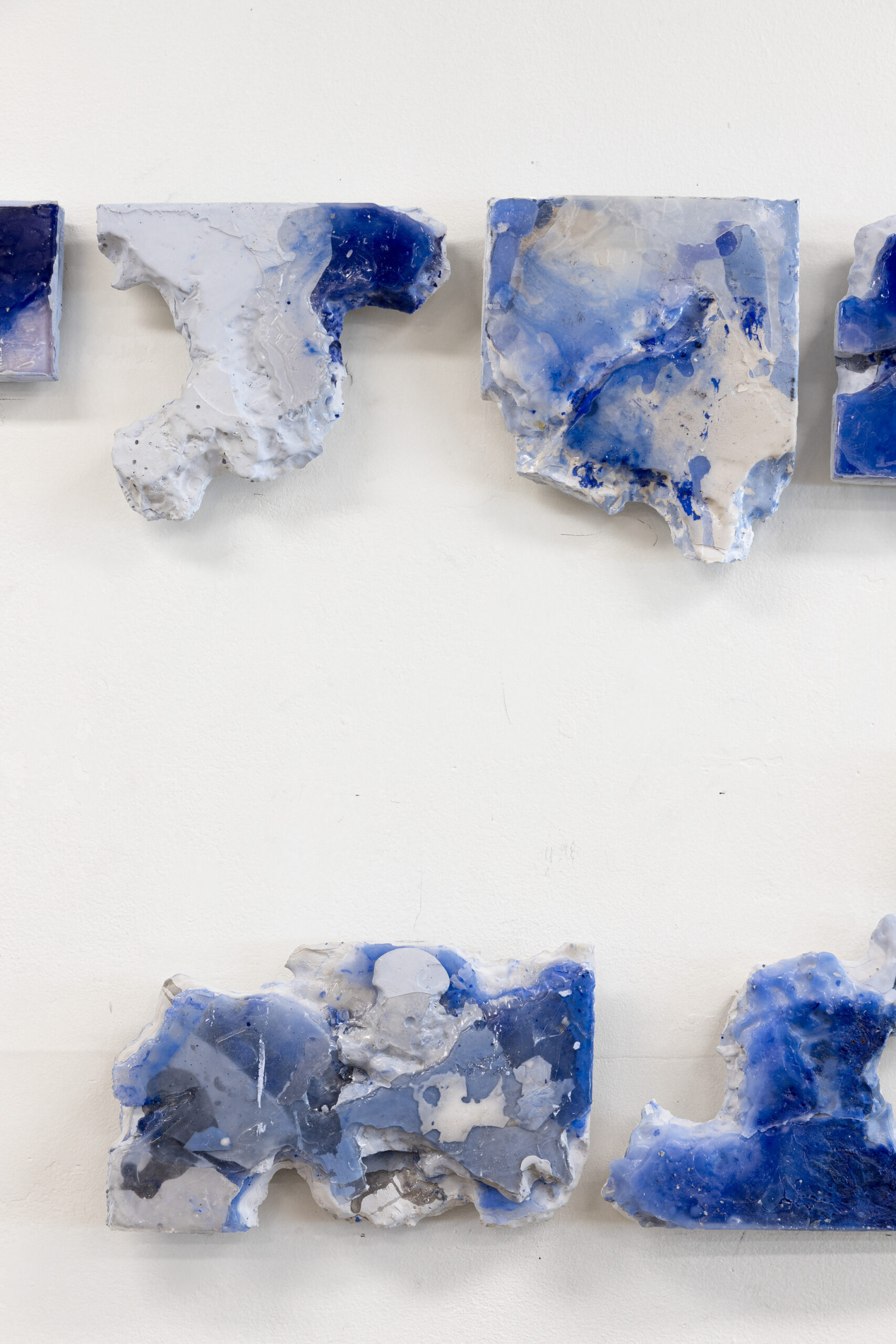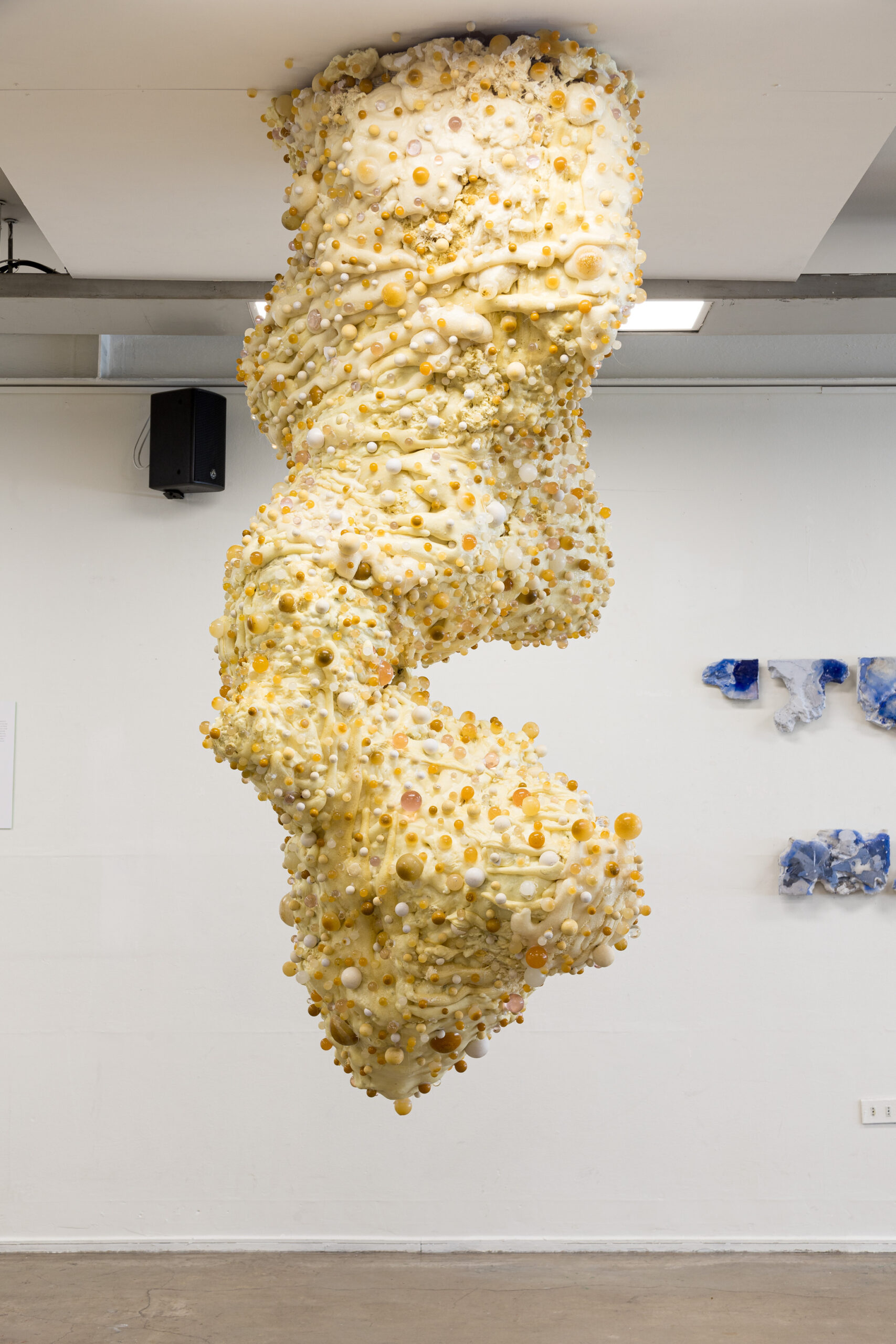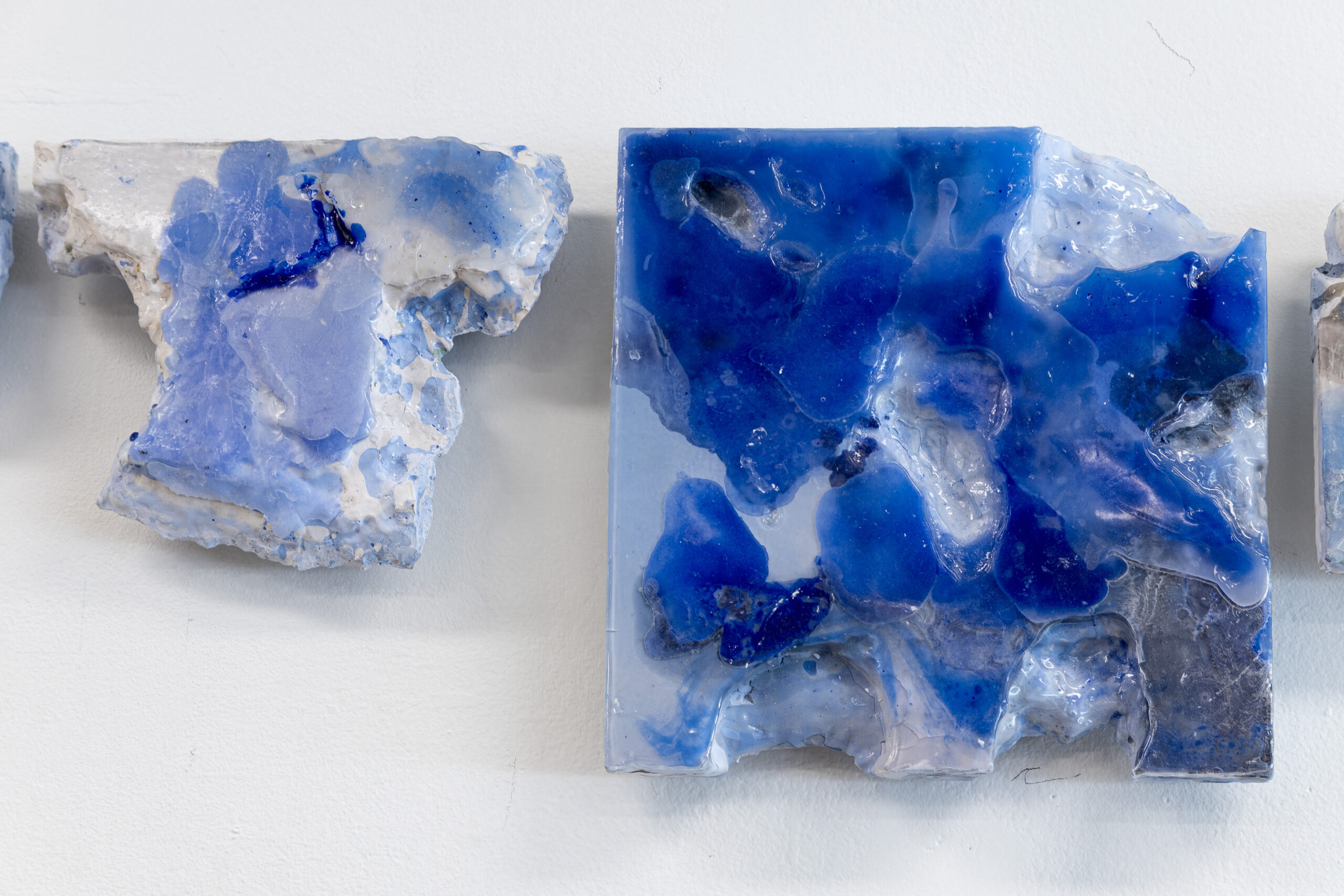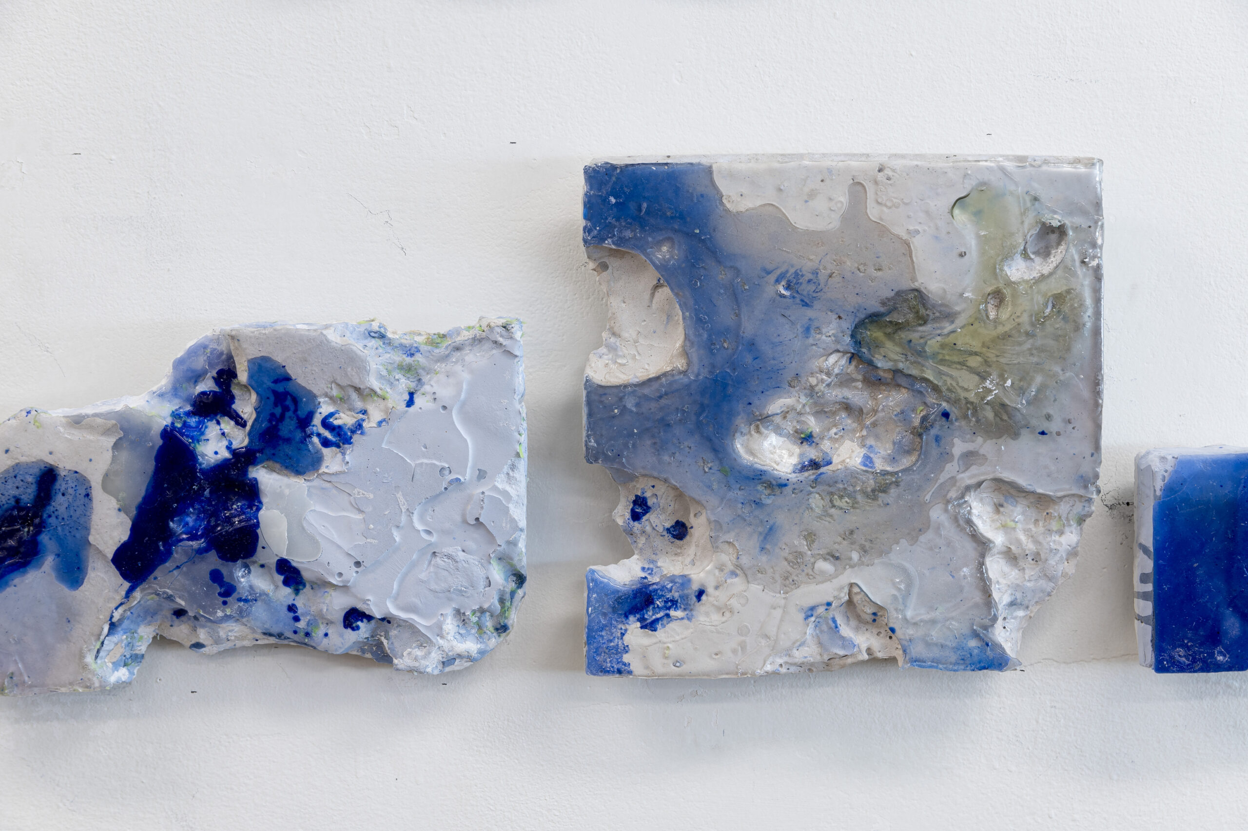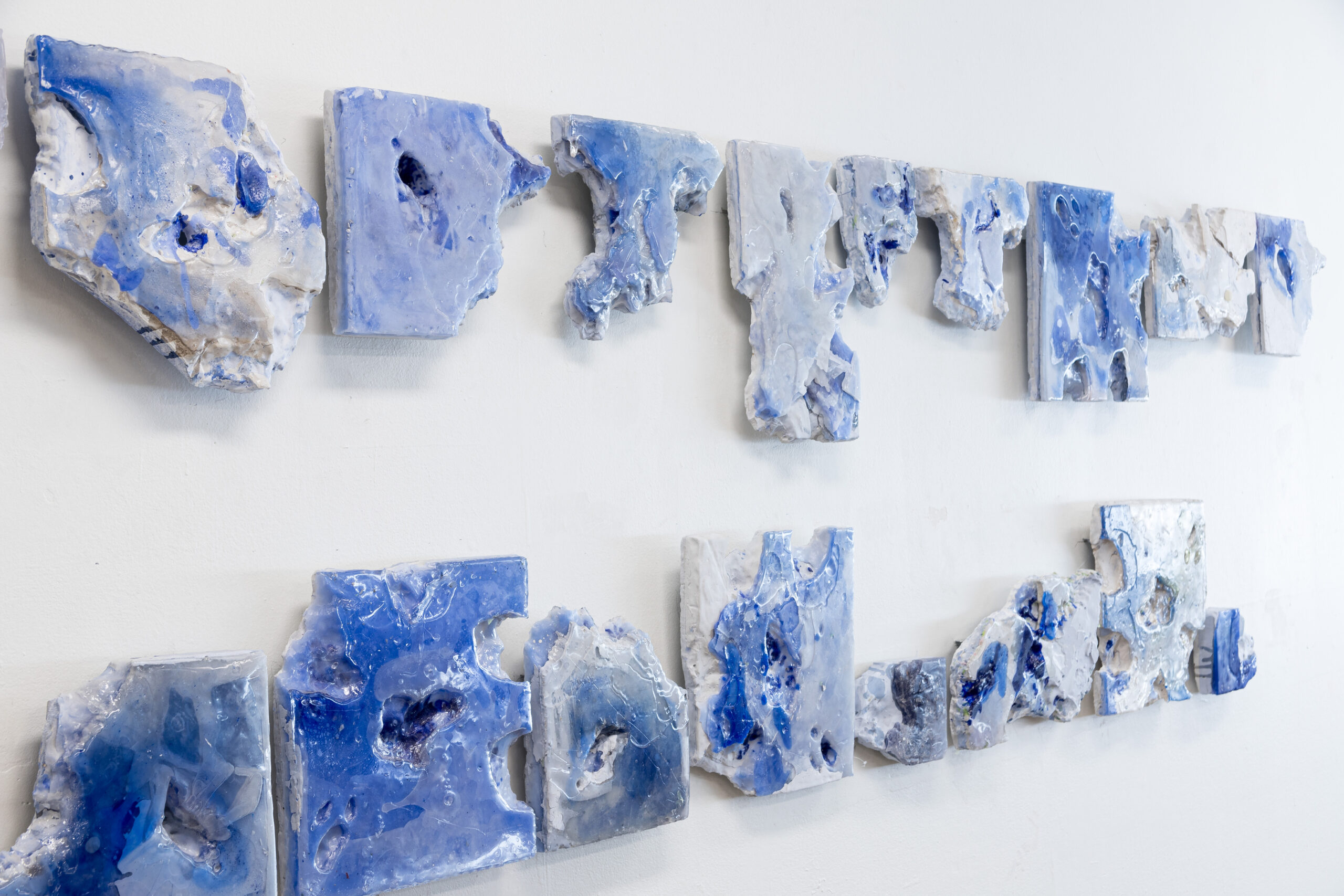JAVIERA ALARCÓN. Geometría fluida , serie de vaciados de yeso, resina y parafina con tierra de color azul, 80 x 400 cm. Escultura de fierro, diario y espuma de poliuretano expansiva, forrada de esferas de resina, yeso y parafina con tierra de color amarilla, 2 metros de altura, 2024.