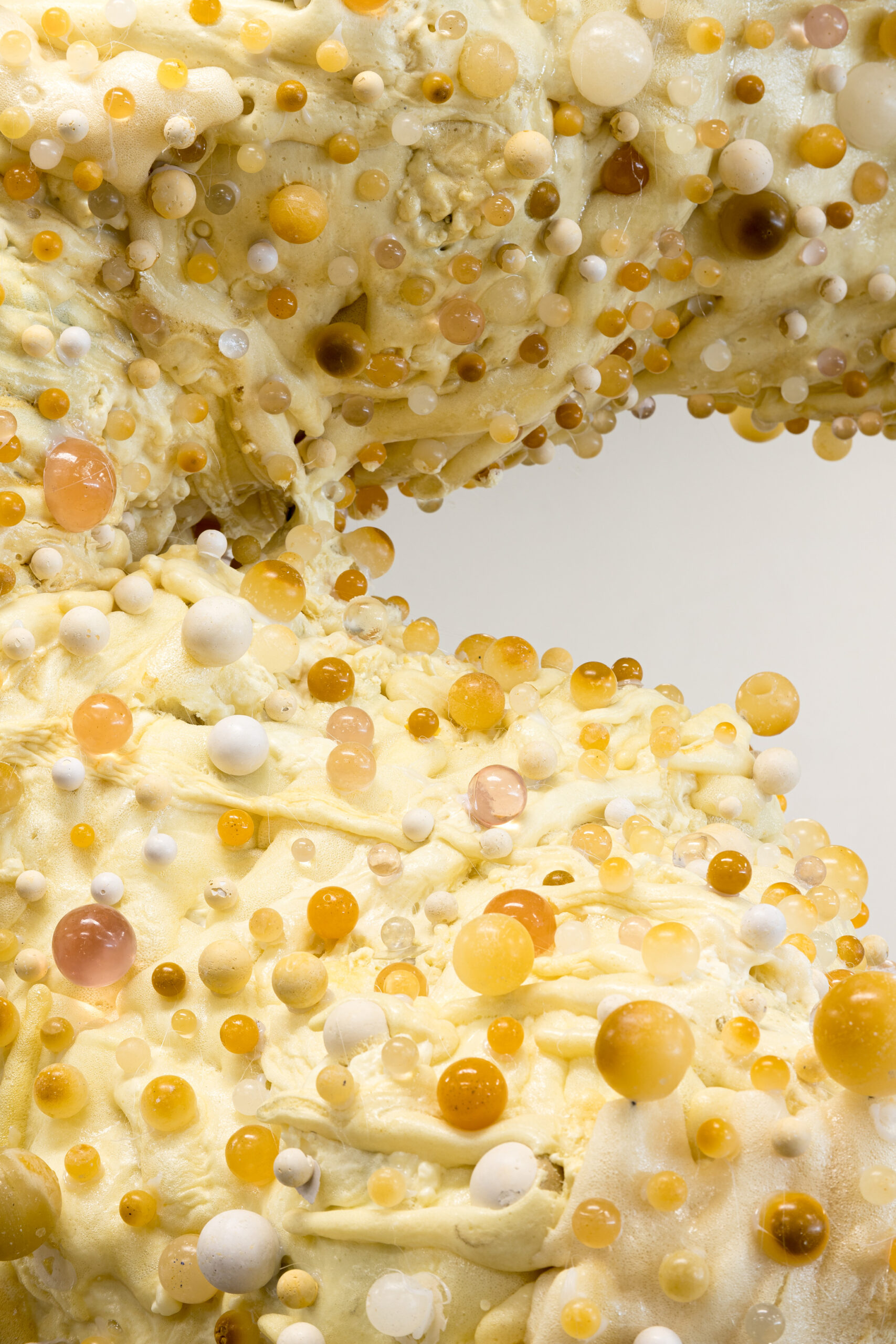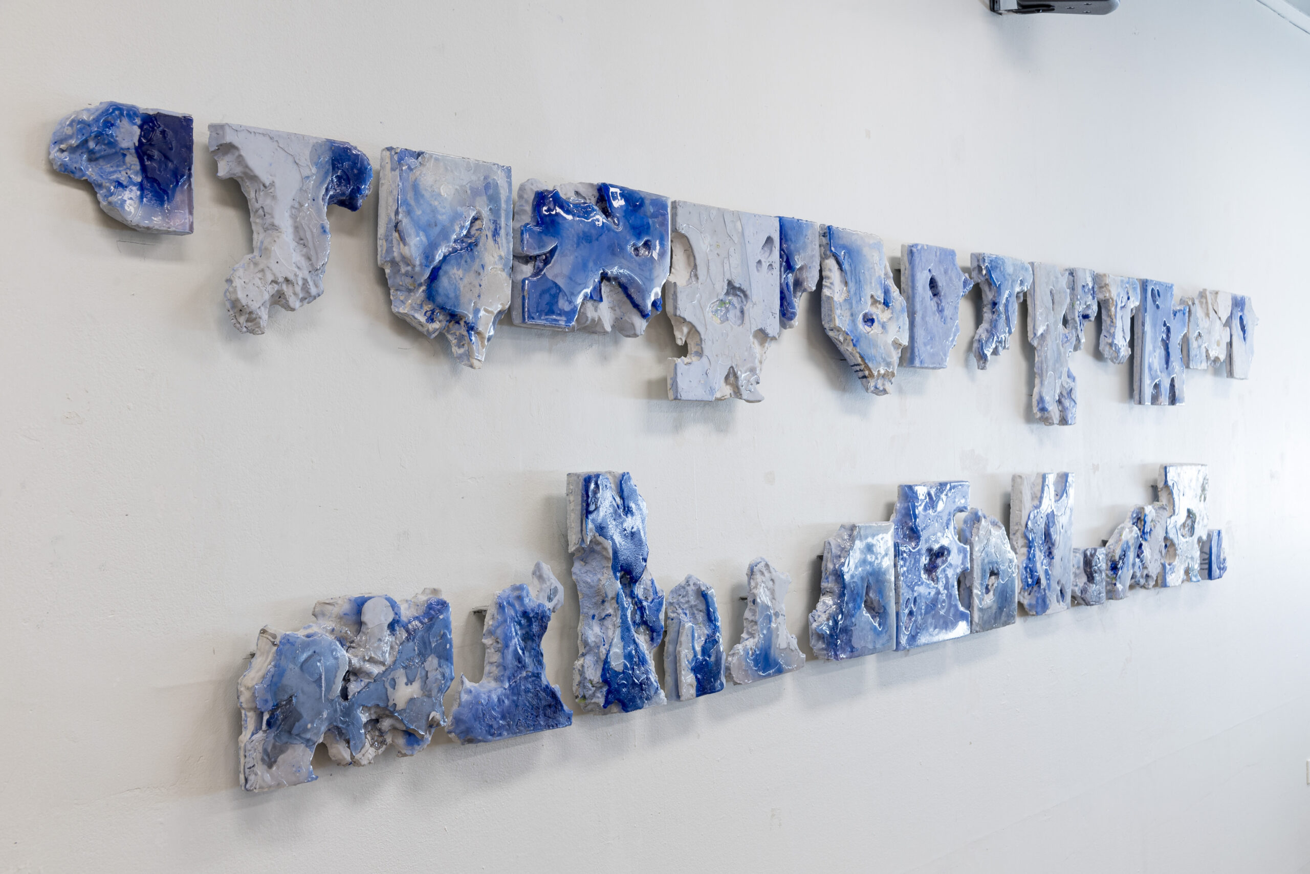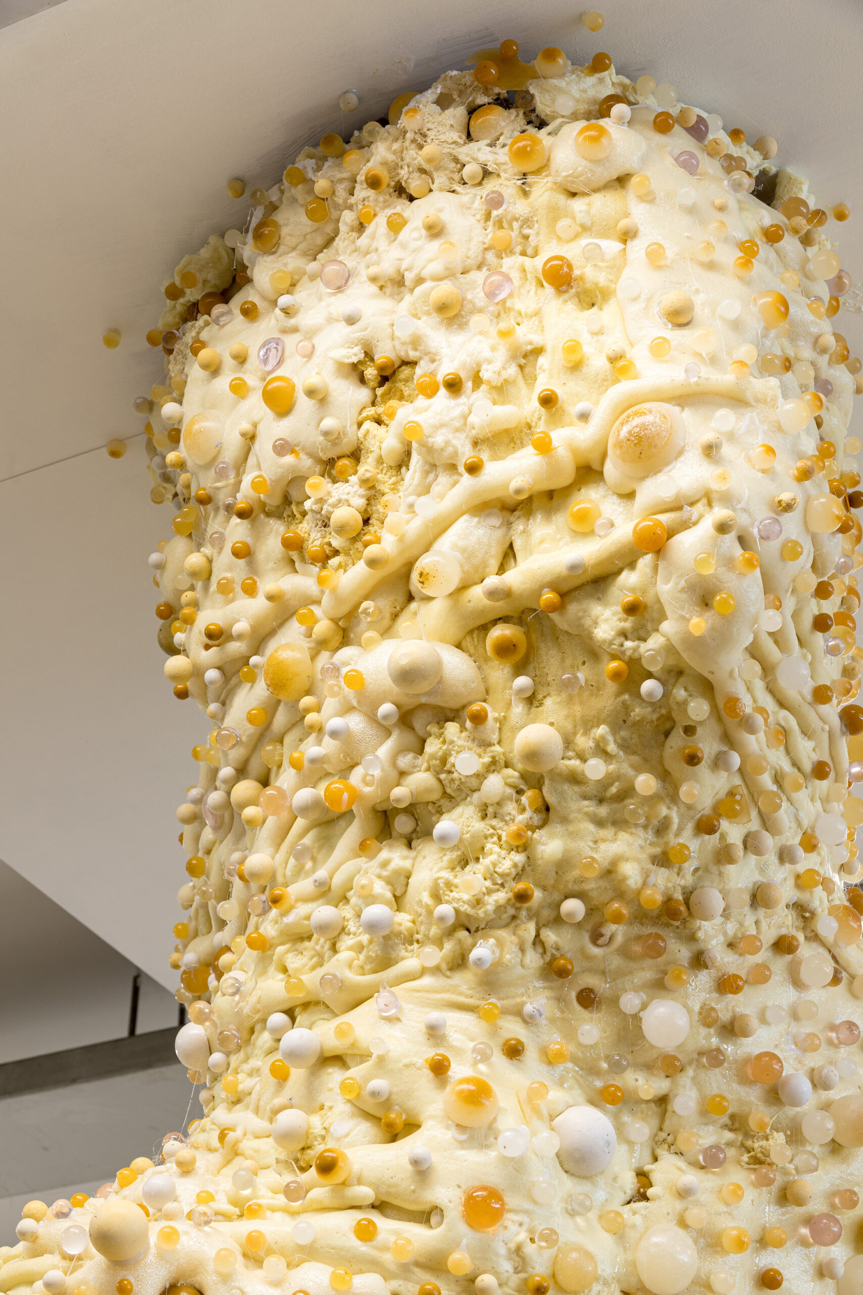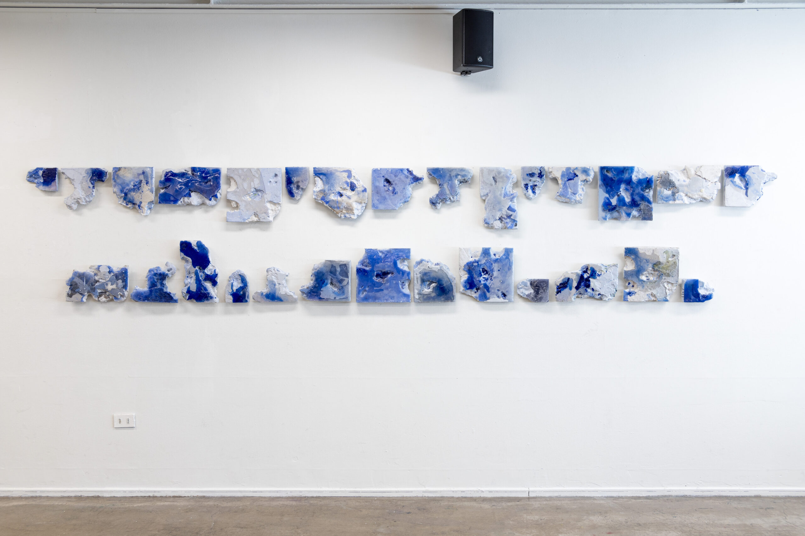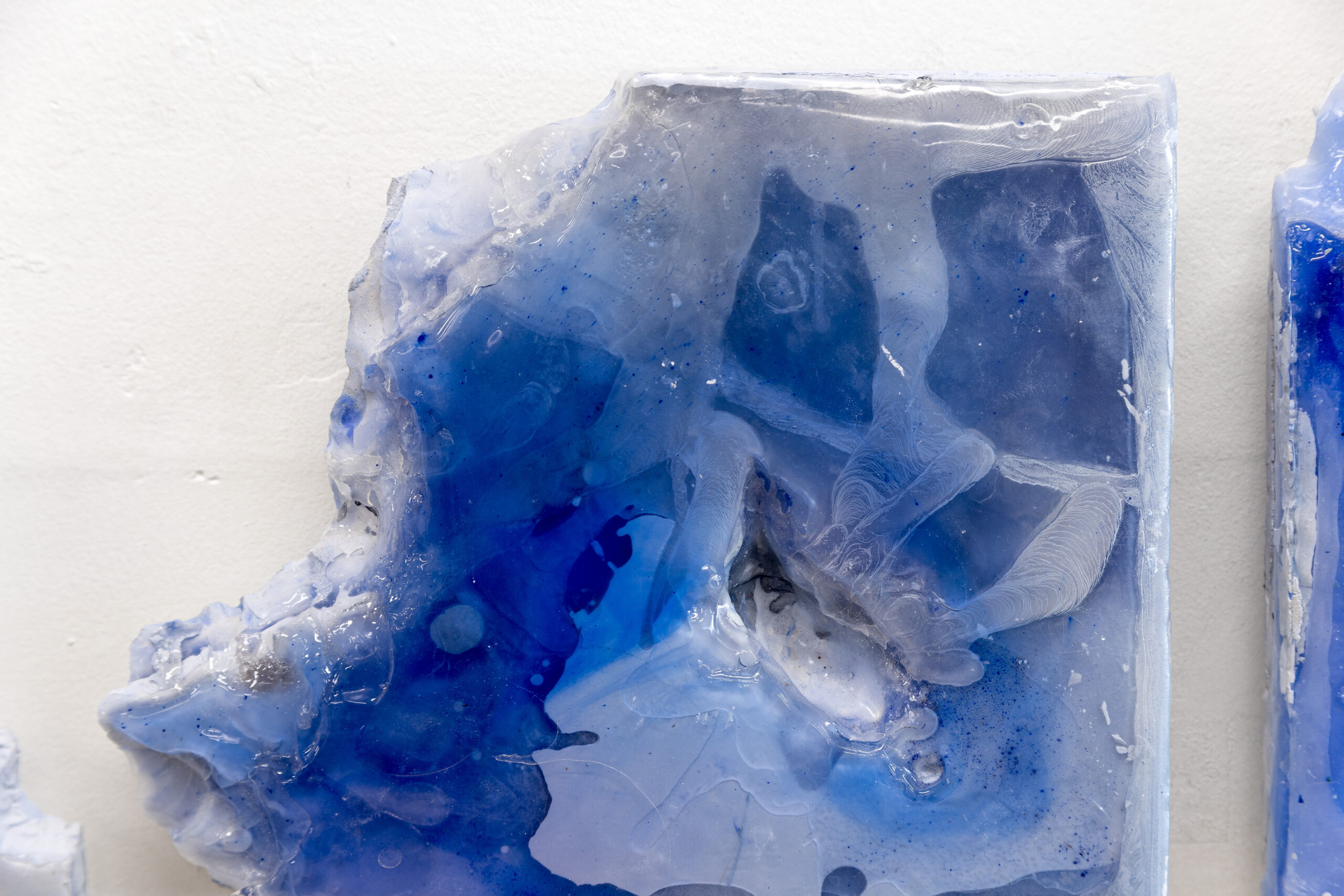JAVIERA ALARCÓN. Geometría fluida , serie de vaciados de yeso, resina y parafina con tierra de color azul, 80 x 400 cm. Escultura de fierro, diario y espuma de poliuretano expansiva, forrada de esferas de resina, yeso y parafina con tierra de color amarilla, 2 metros de altura, 2024.