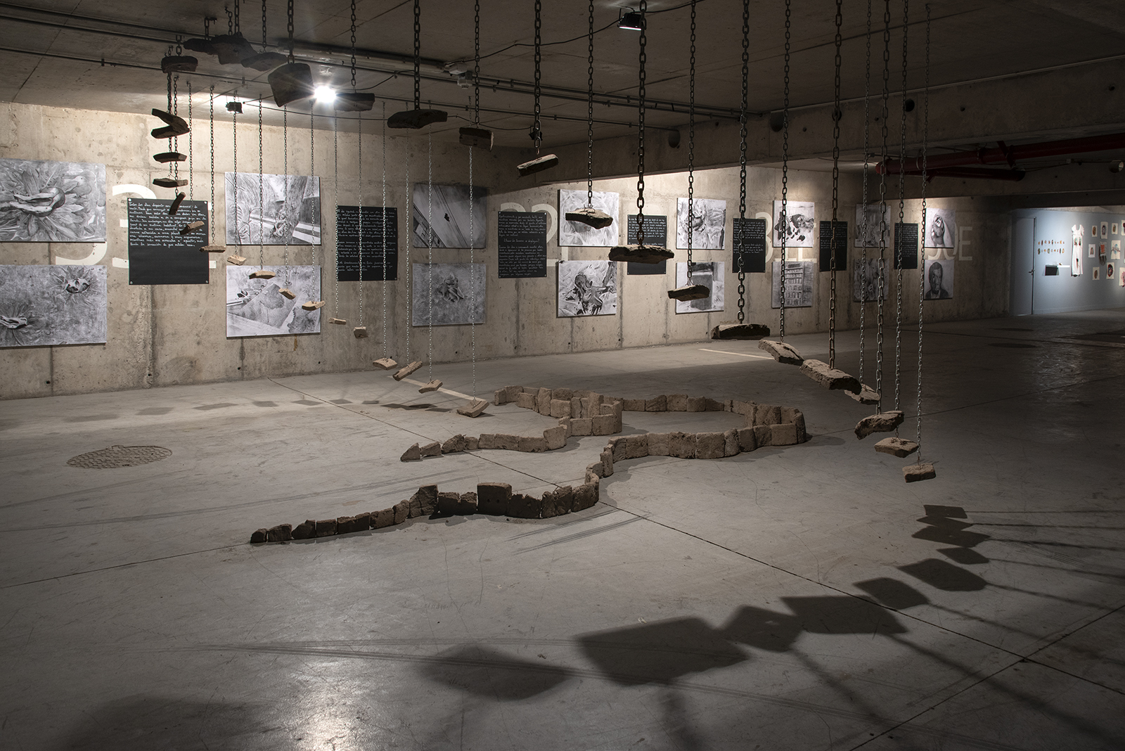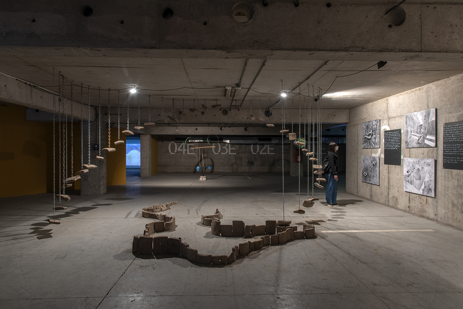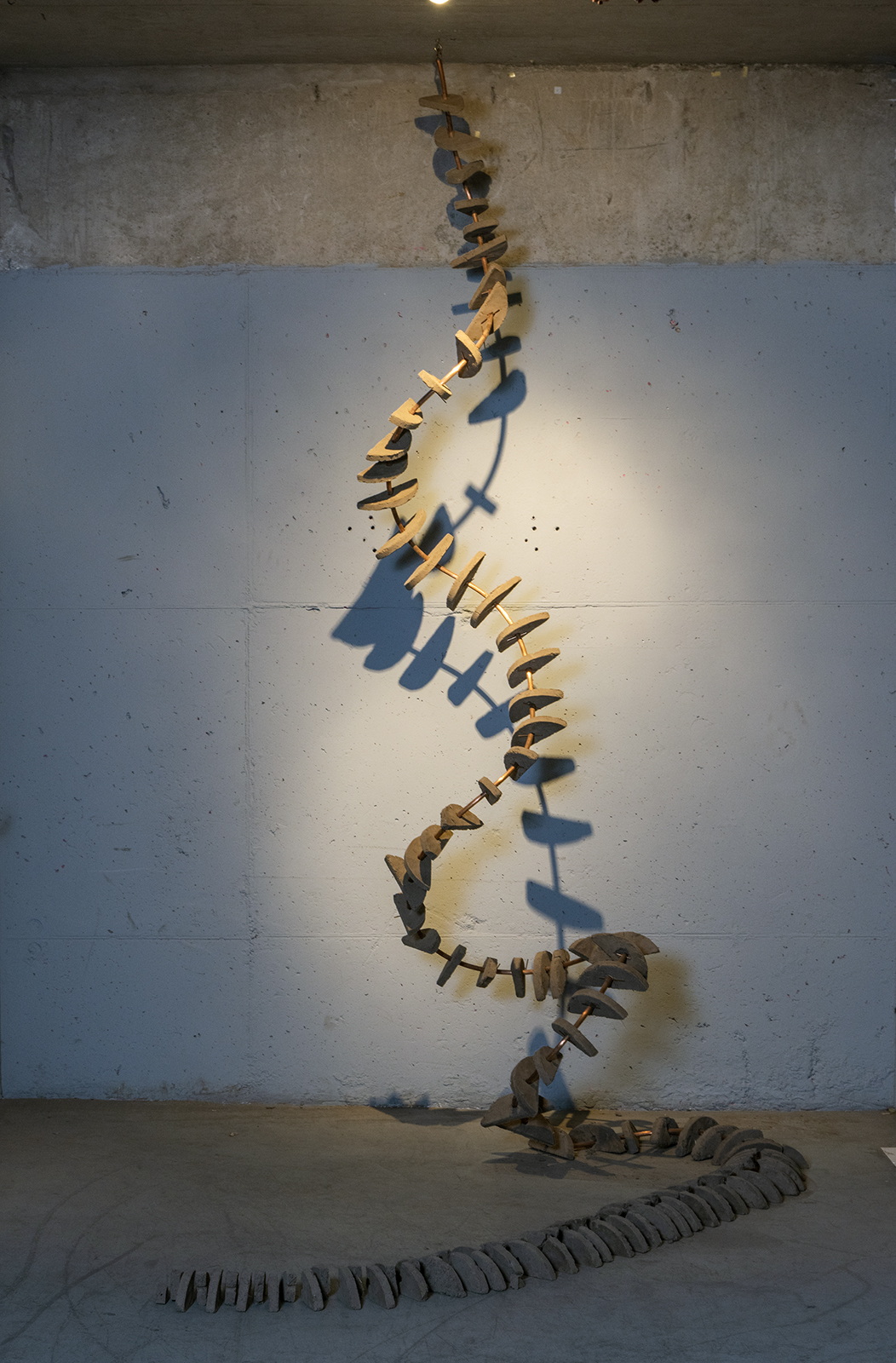 Instalación escultórica, adobe, cobre y cadenas, 750 x 750 cms