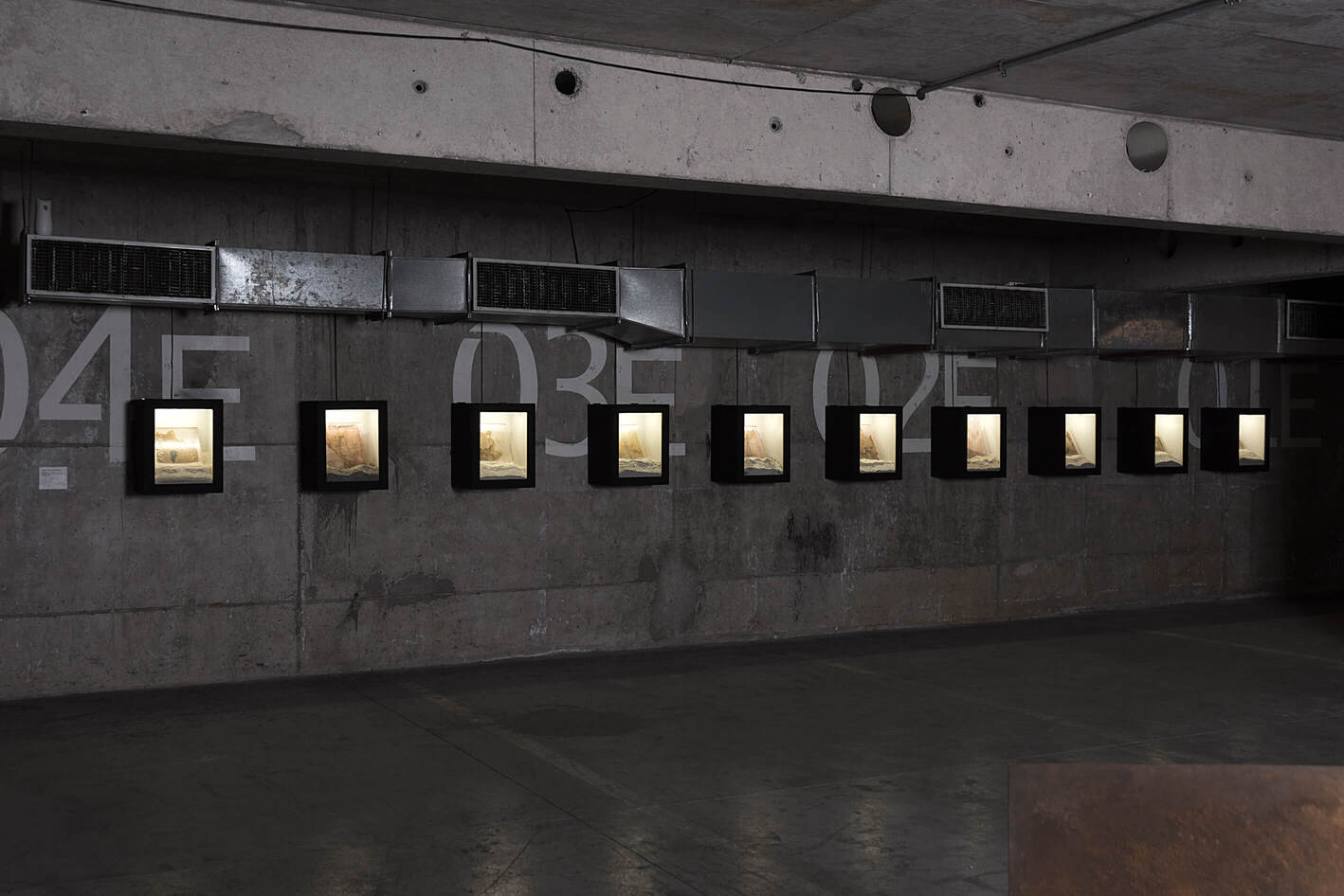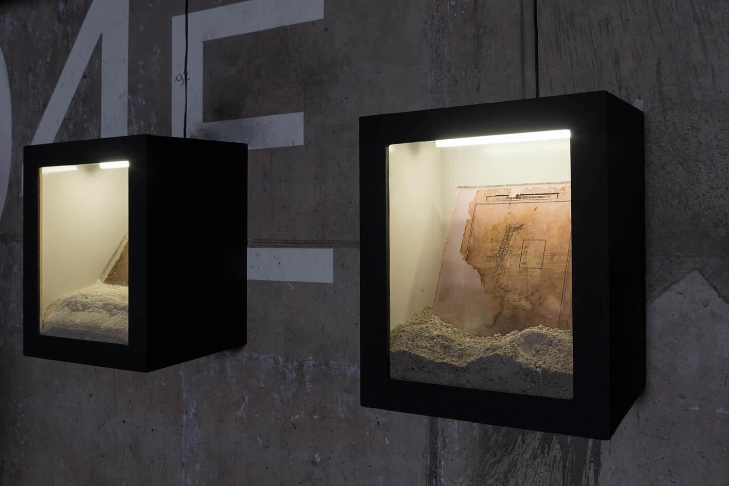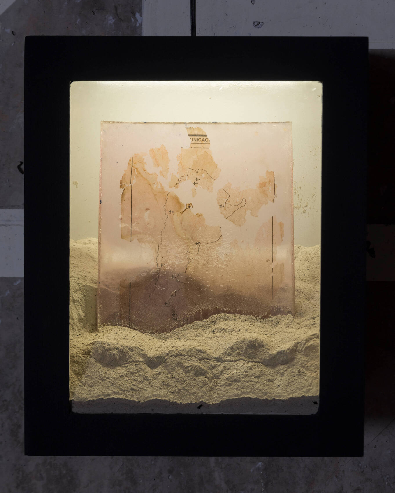 Leonardo Sandoval, Percepción consciente, 2017 Mapas encontrados en resina retroiluminada. Dimensiones variables.