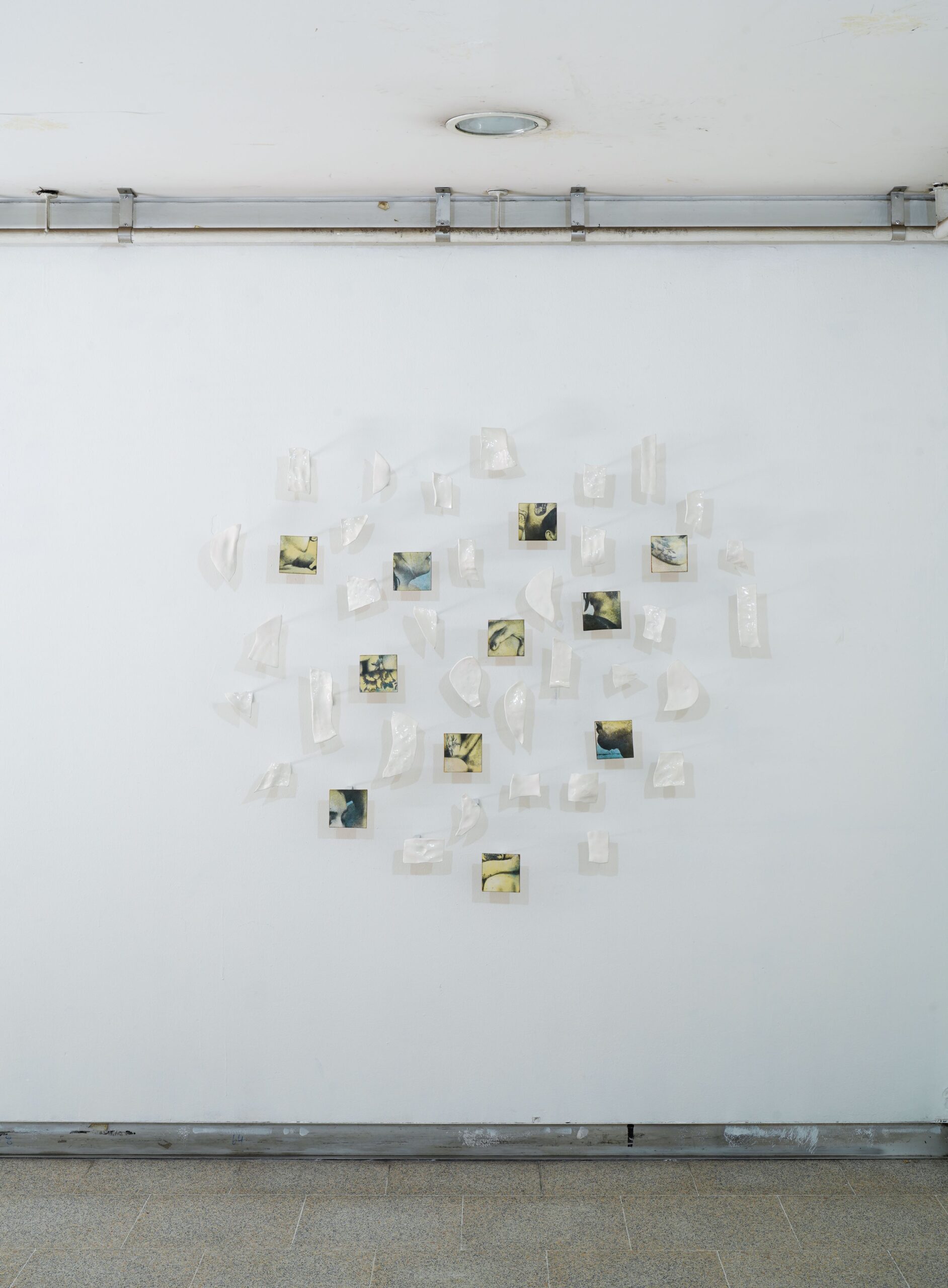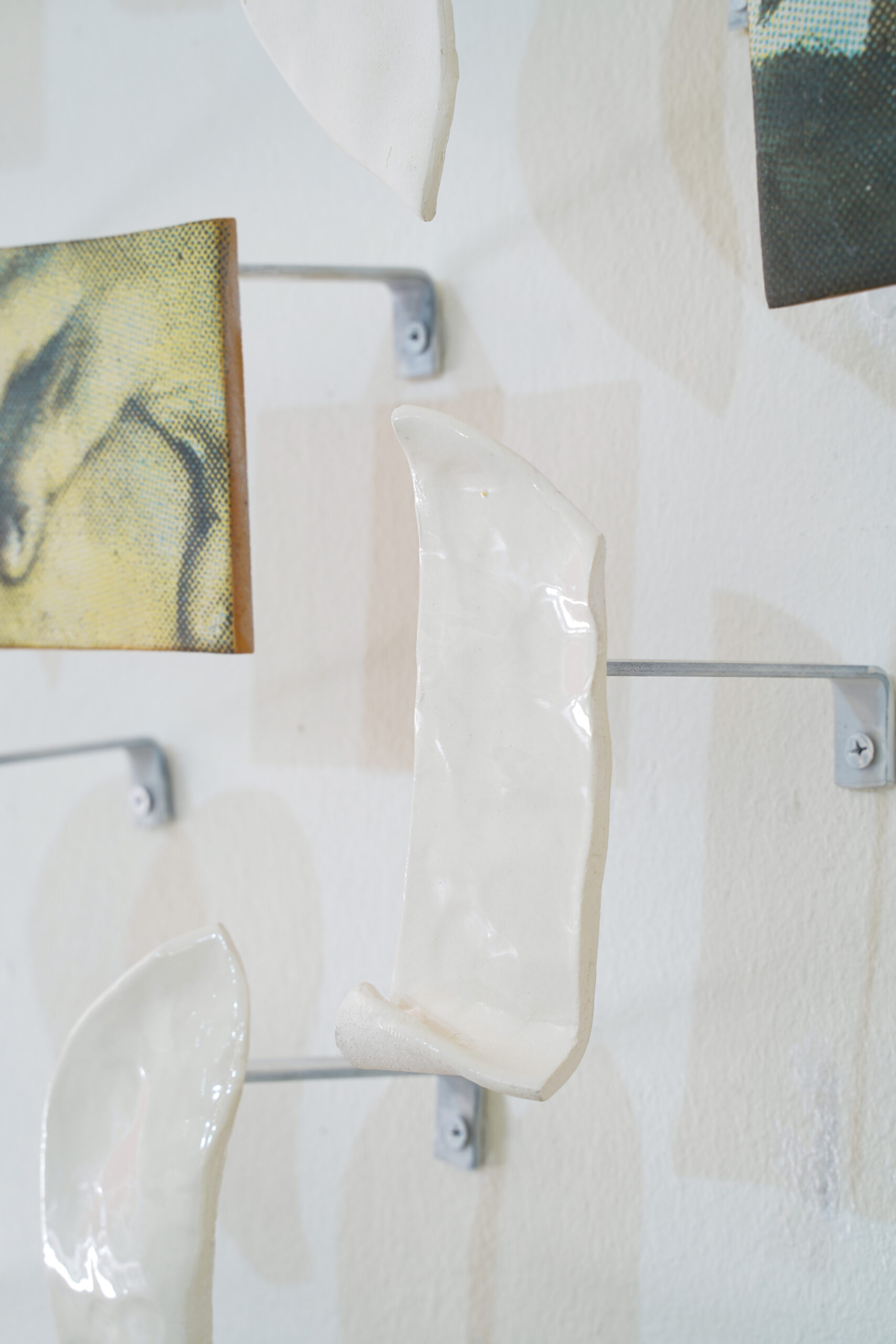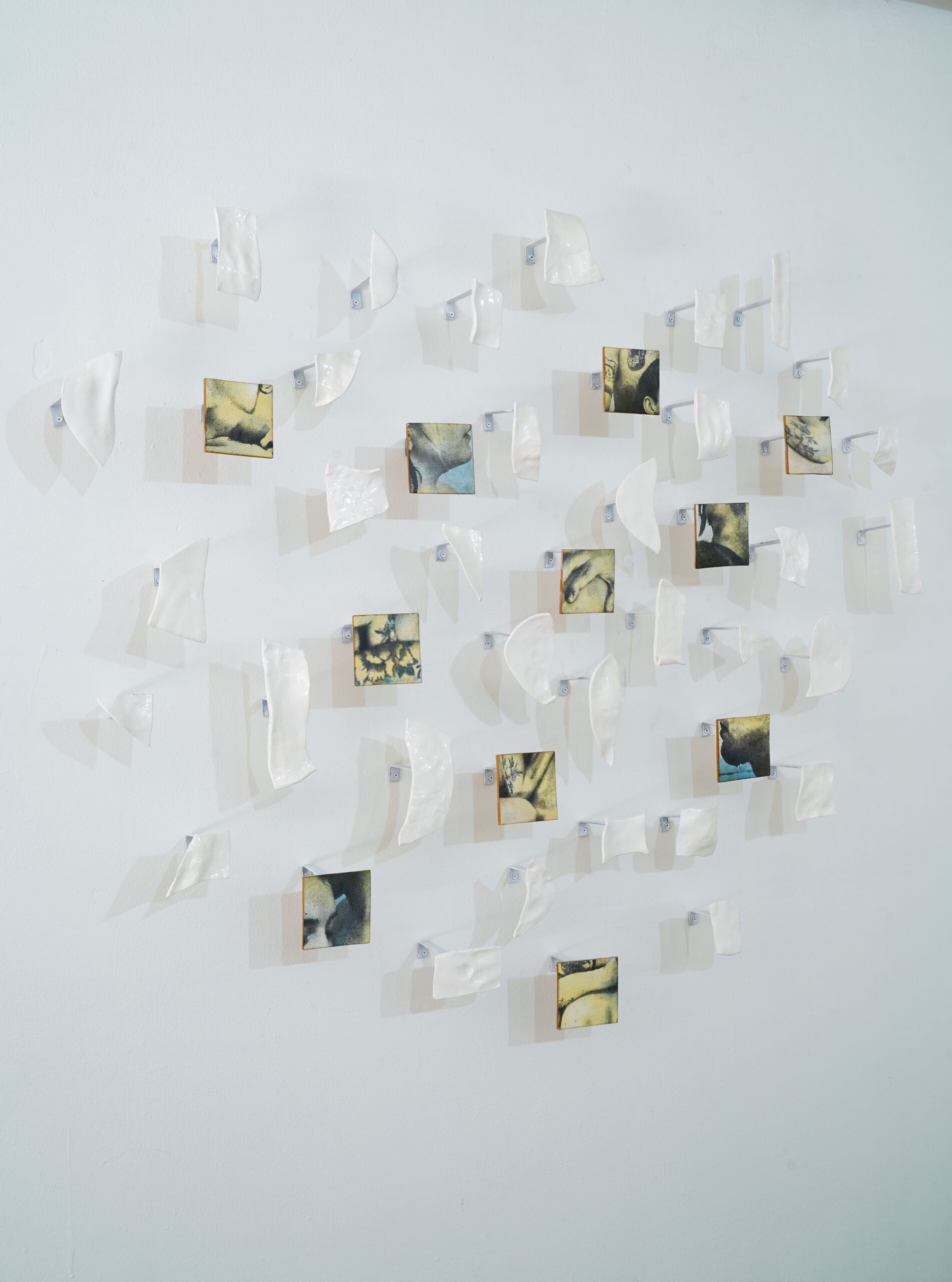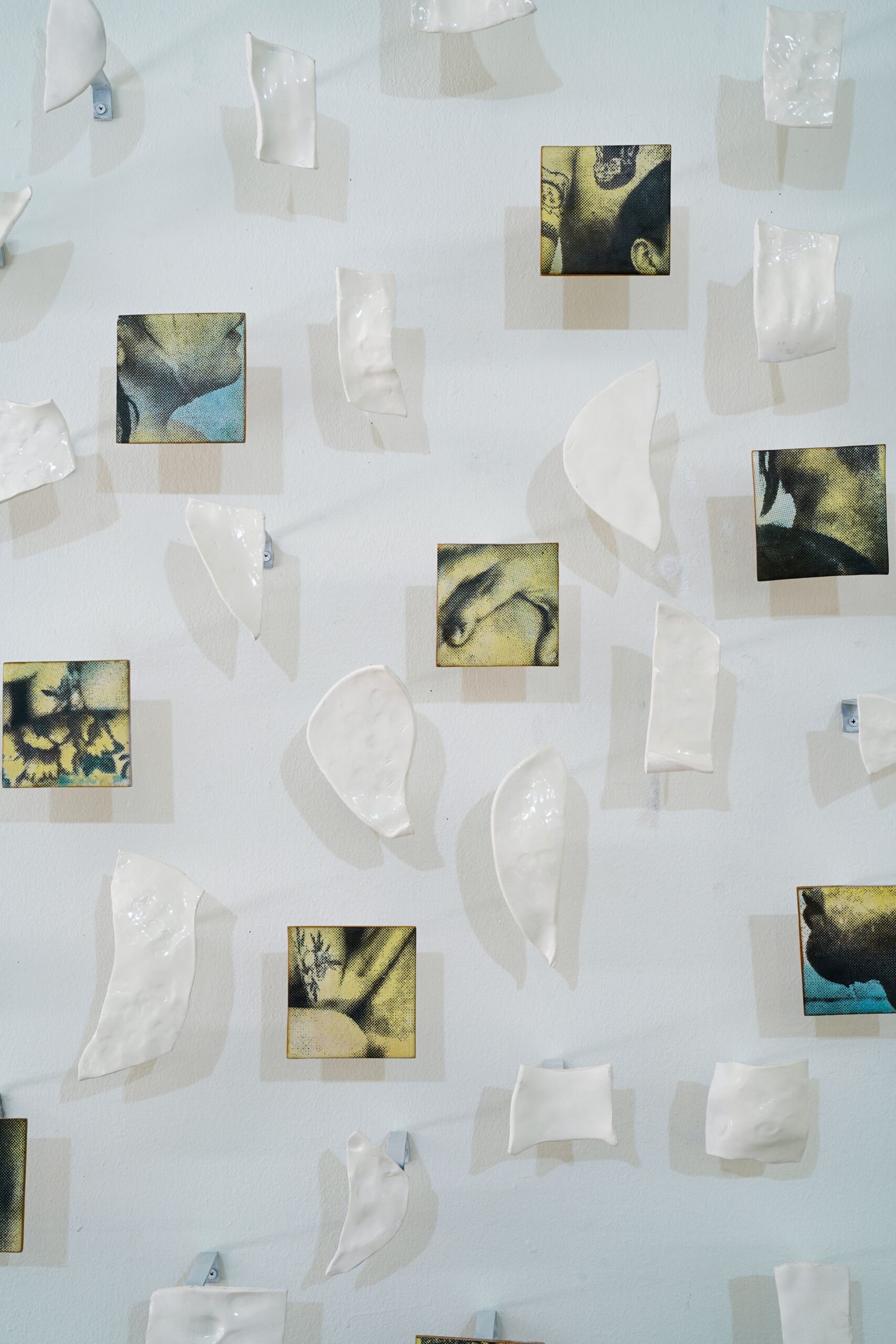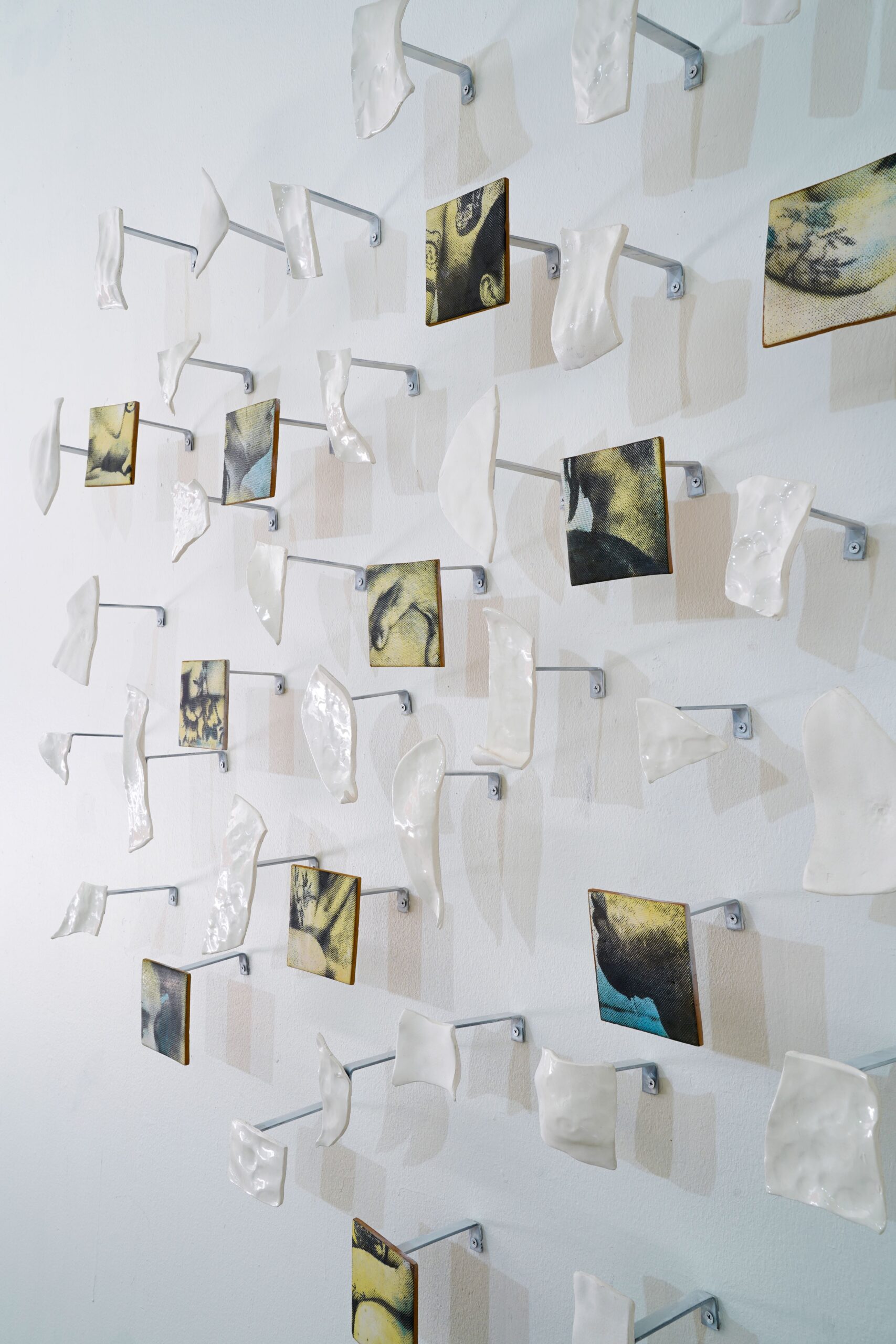 Piezas modeladas a partir de placas de cerámica, esmaltadas con blanco brillante y con aplicación de serigrafía a partir de calcos vitrificables. Medidas variables.