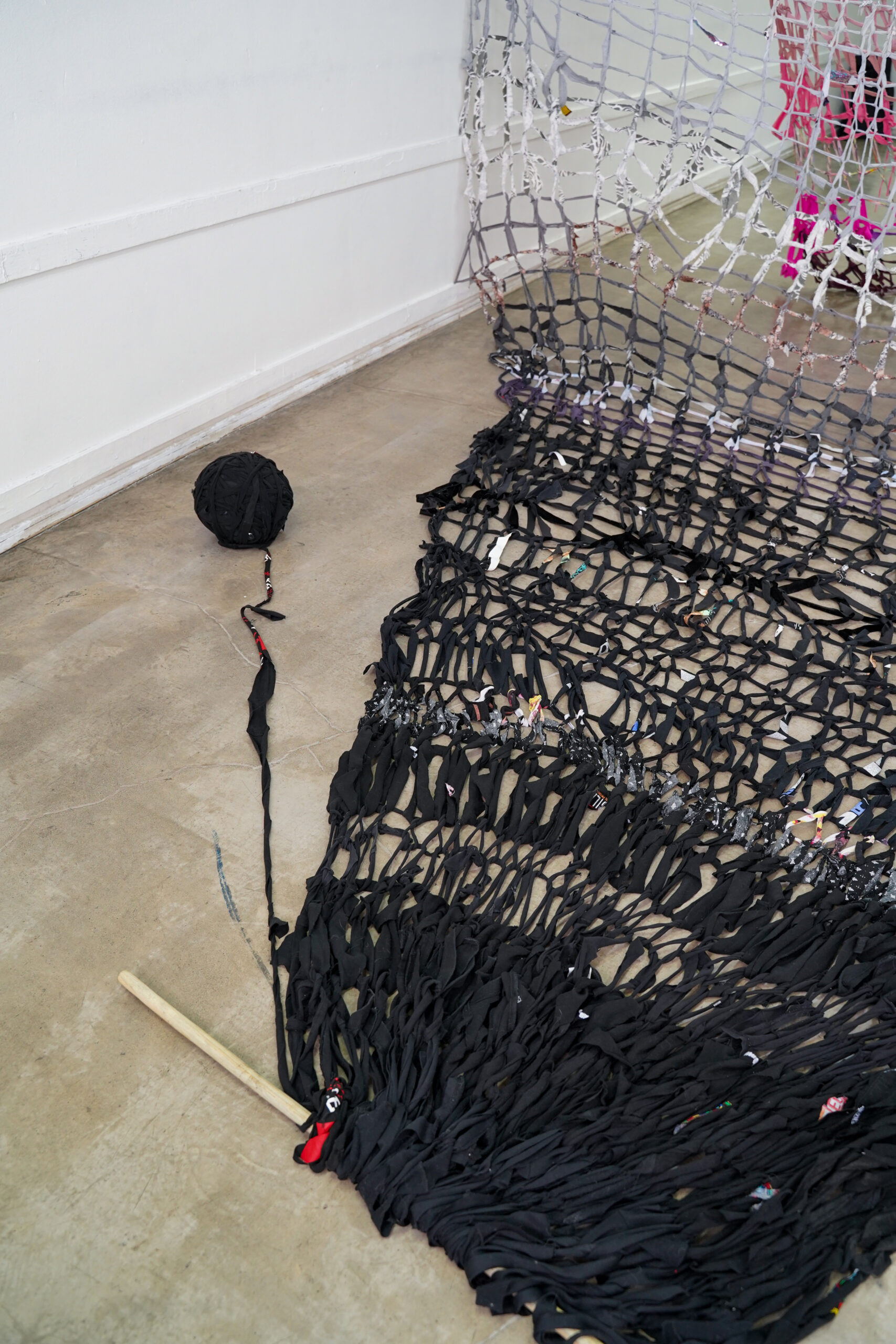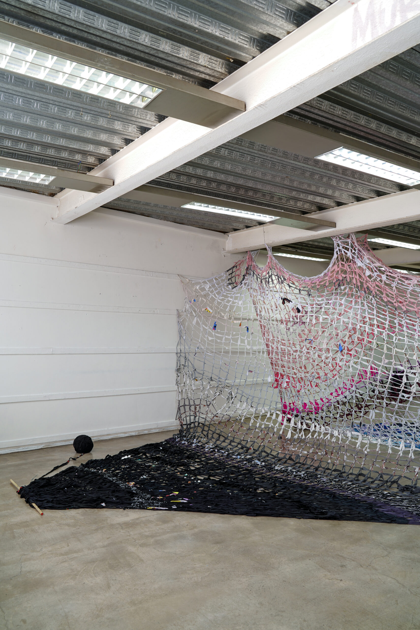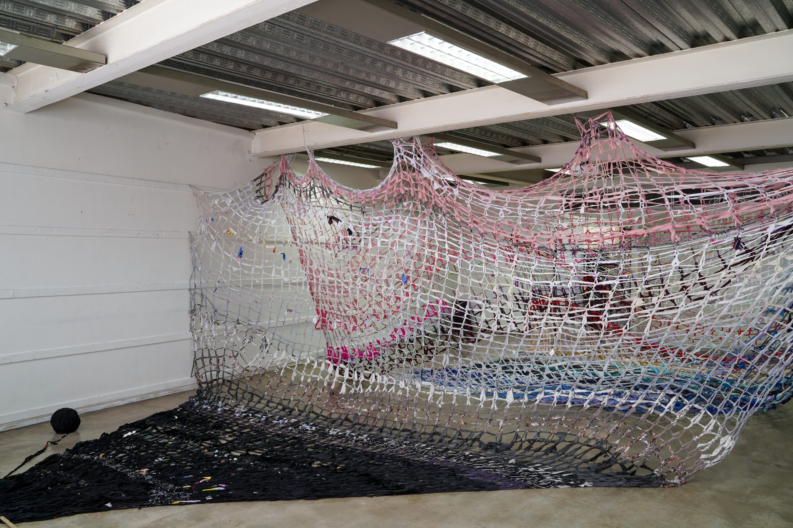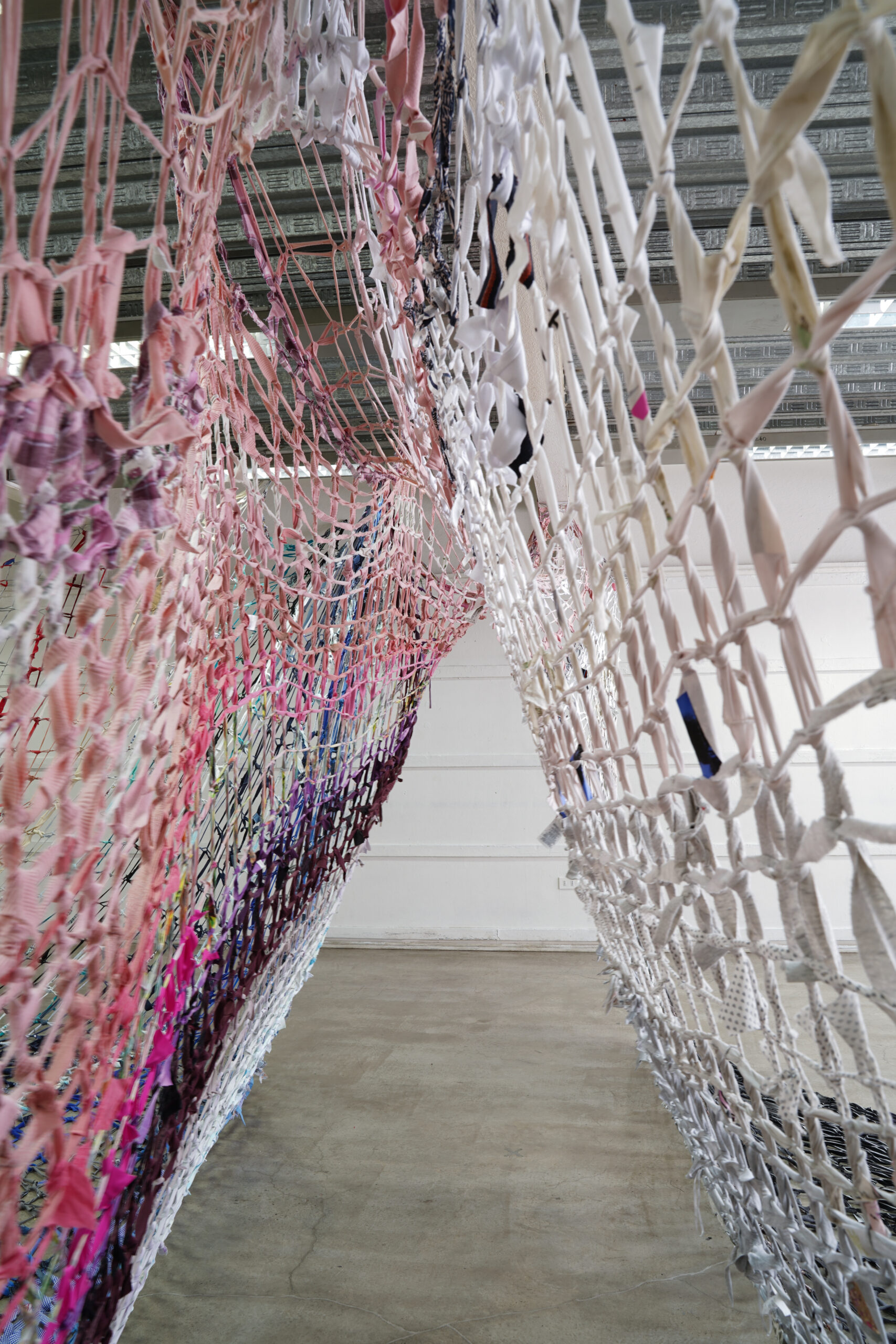 Tejido a mano a base de hebras confeccionados con prendas de ropa recolectada en lugares diversos. Medidas variables