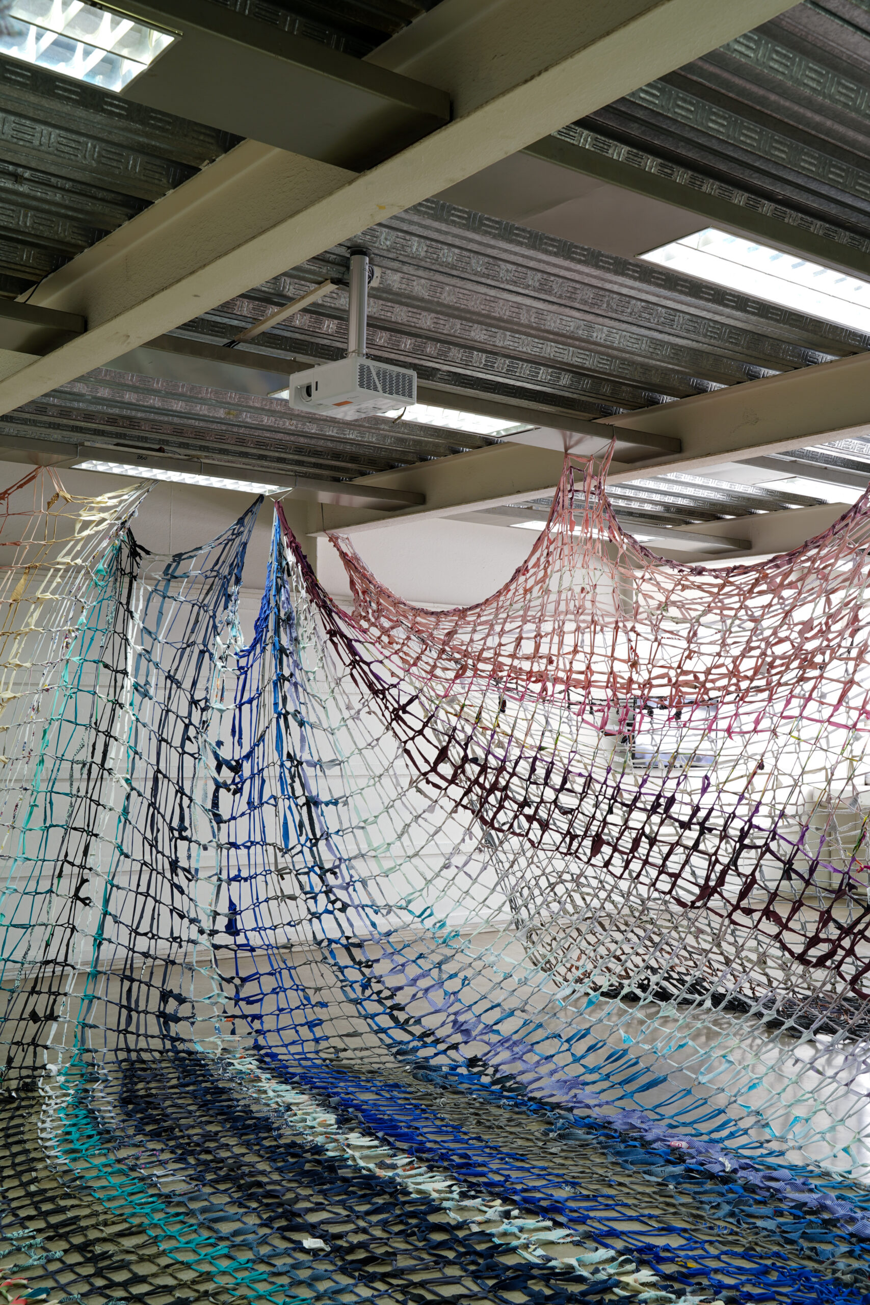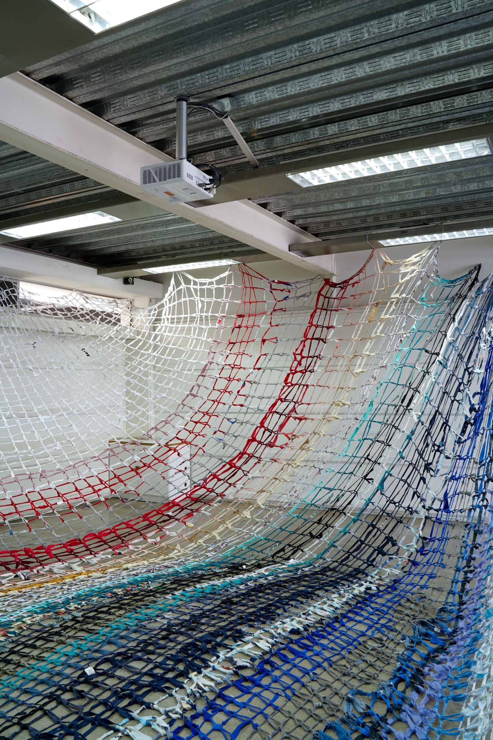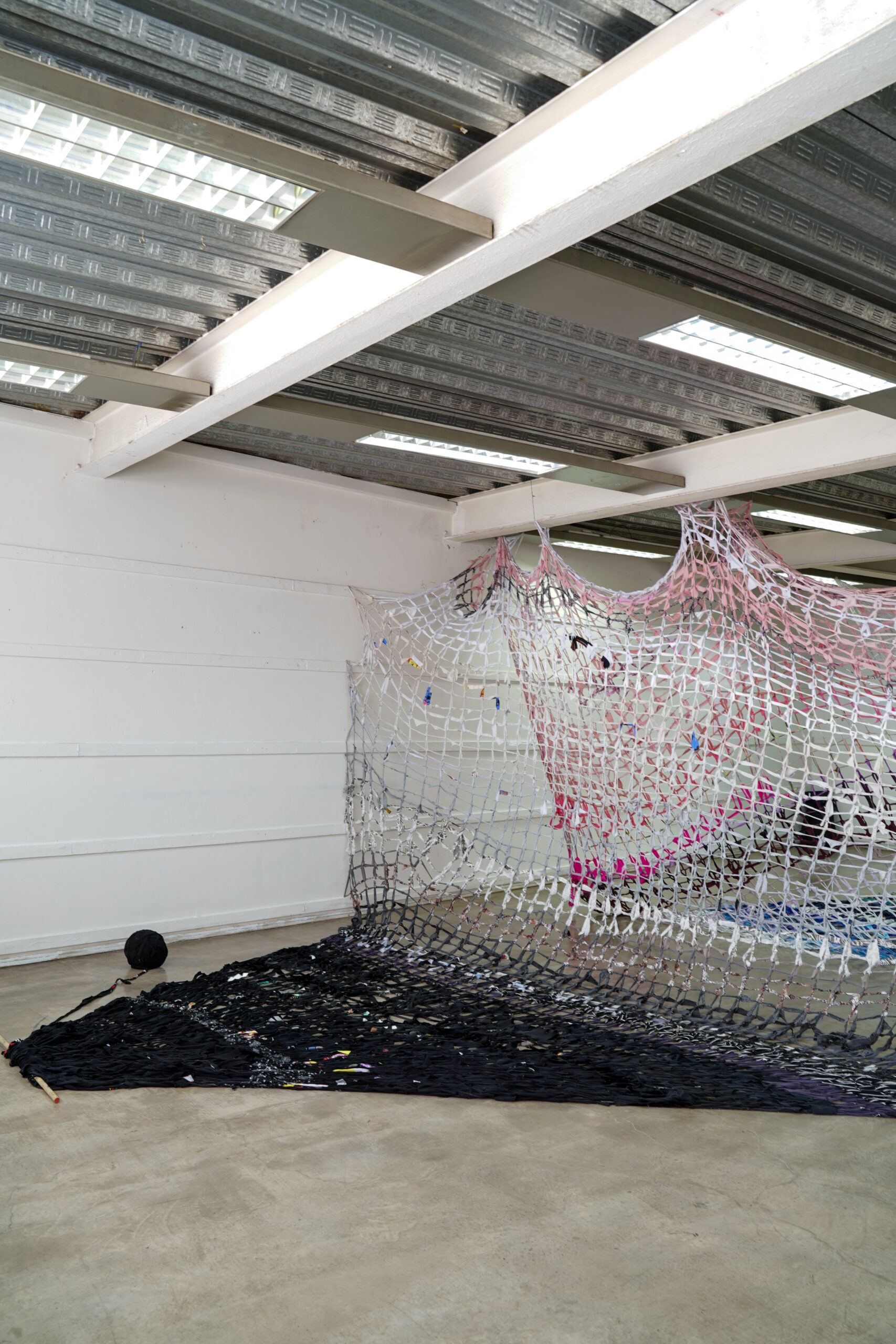 Tejido a mano a base de hebras confeccionados con prendas de ropa recolectada en lugares diversos. Medidas variables