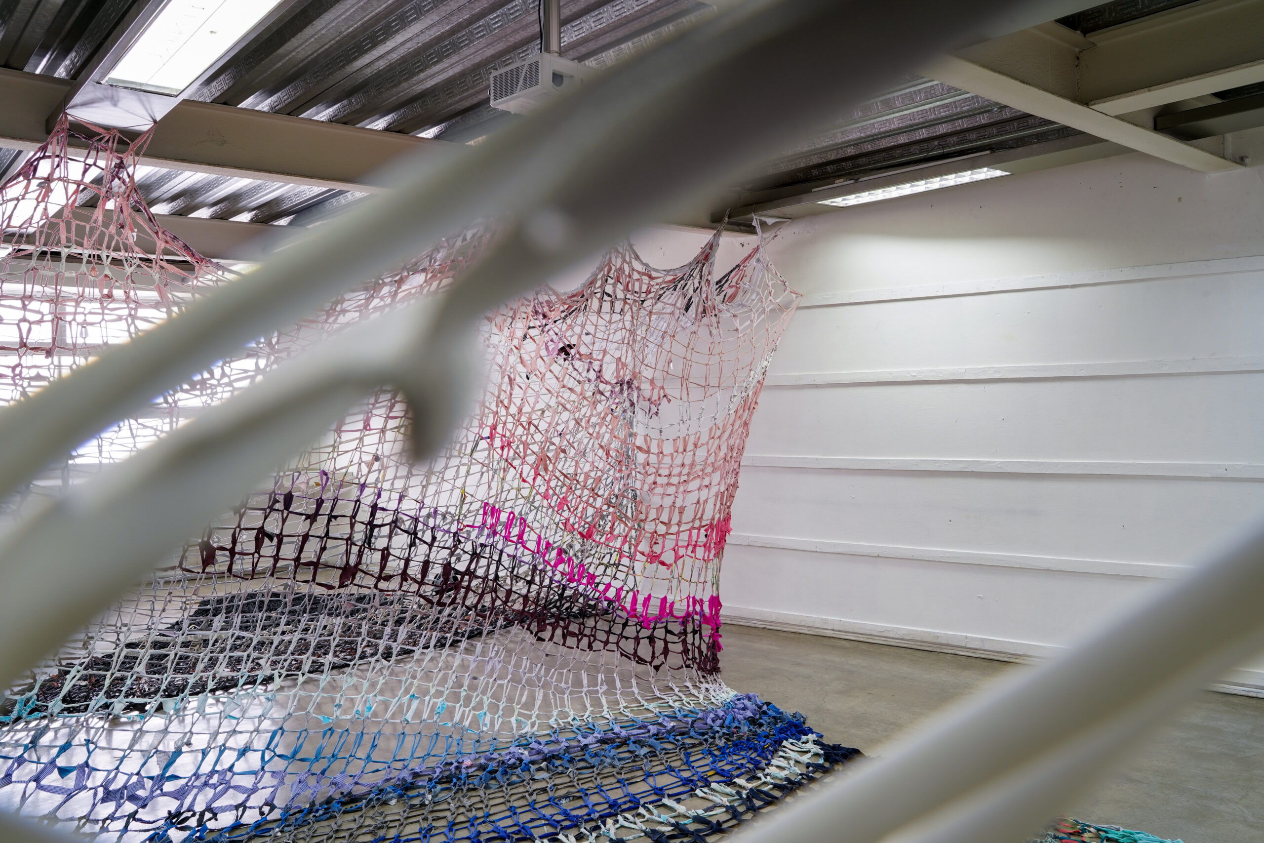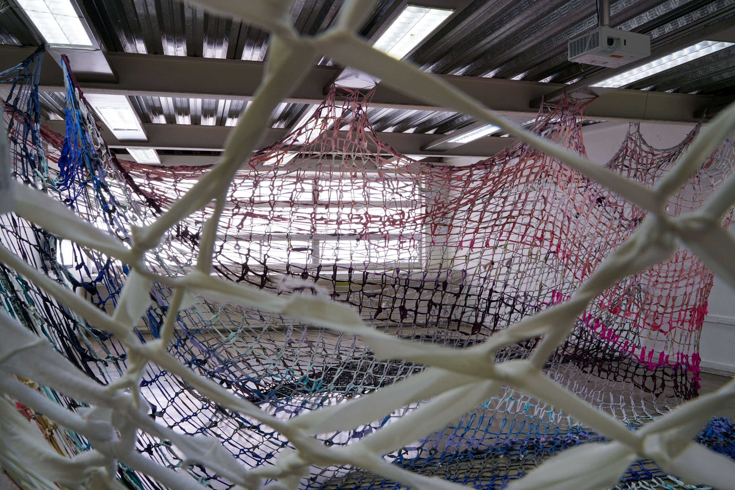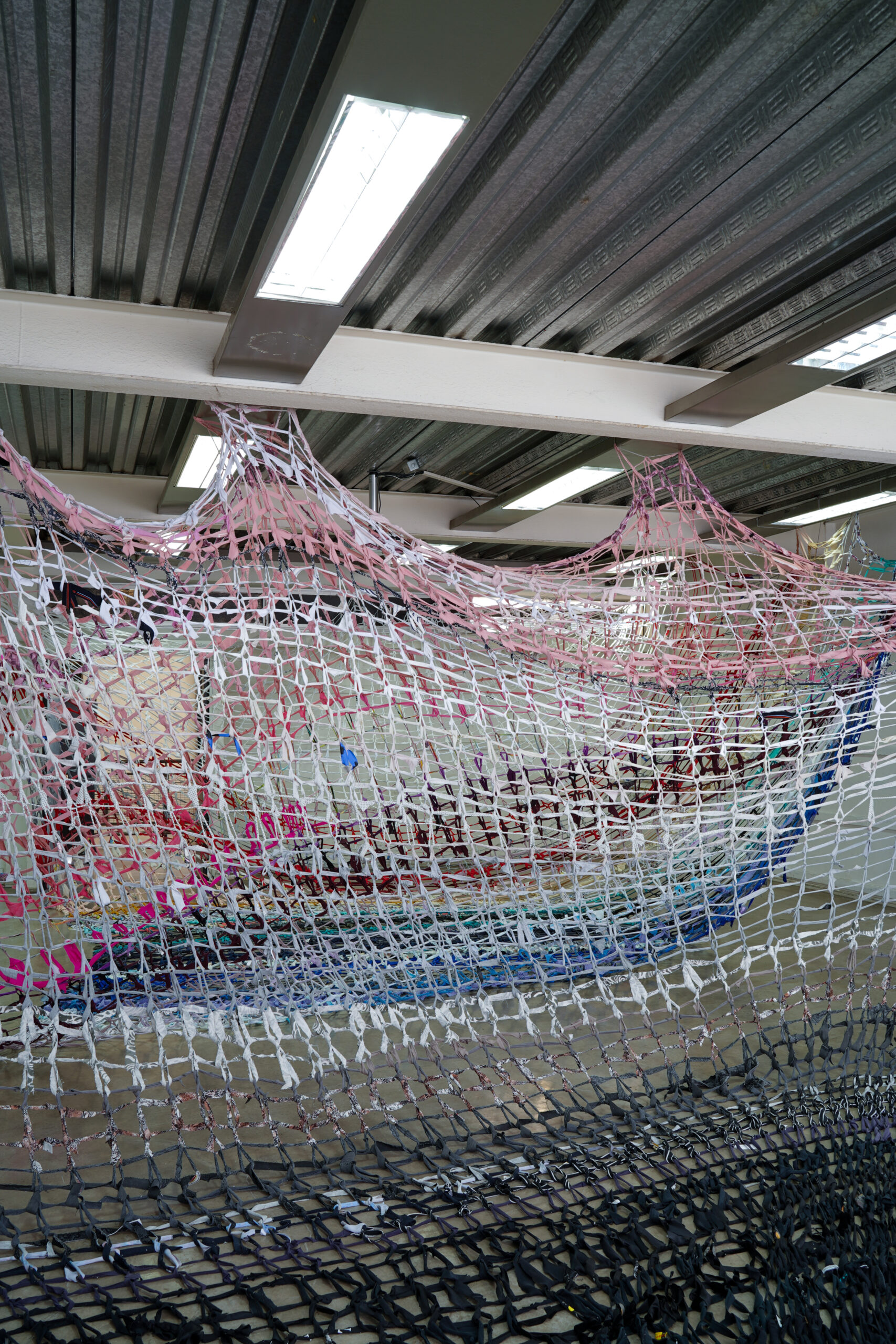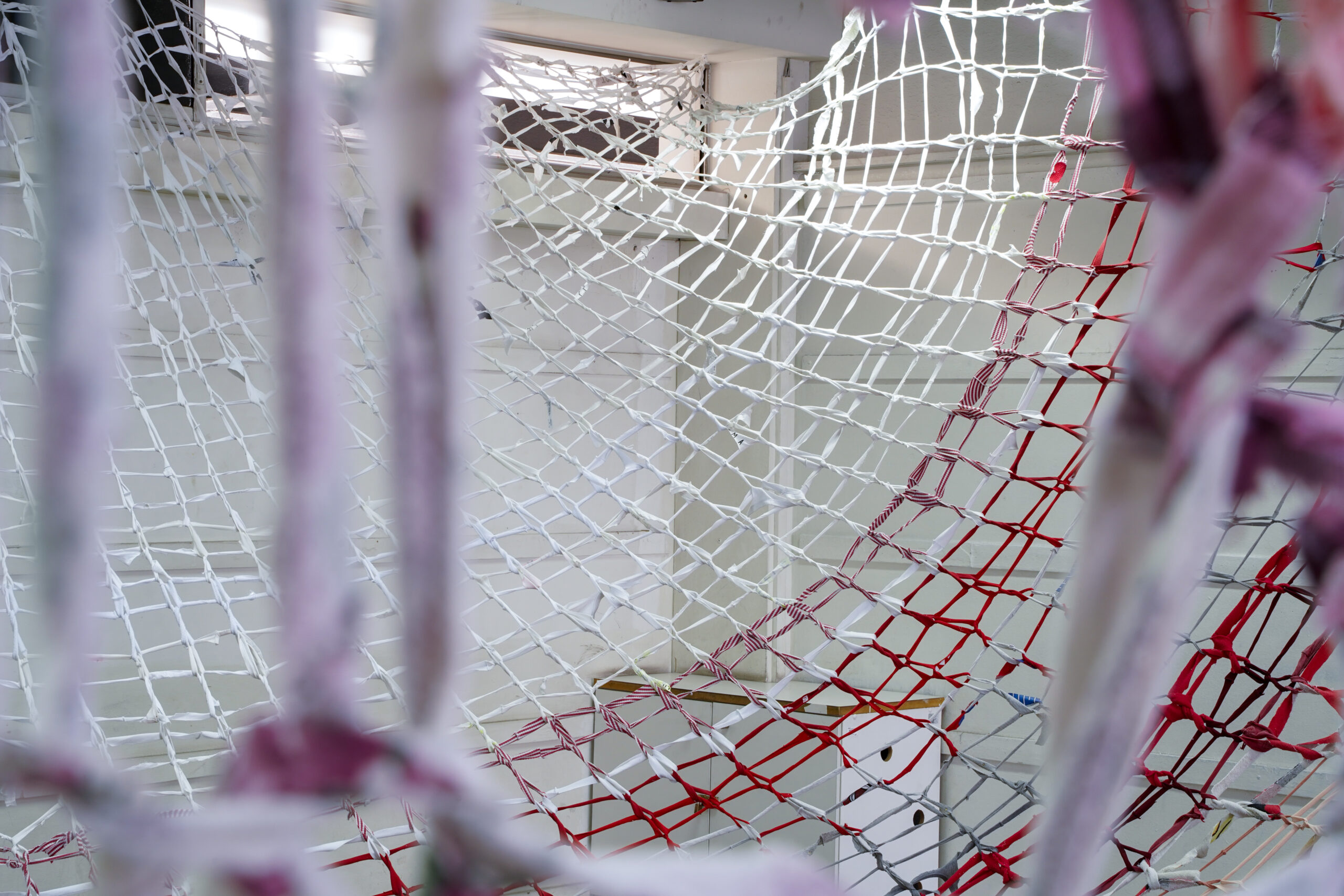 Tejido a mano a base de hebras confeccionados con prendas de ropa recolectada en lugares diversos. Medidas variables