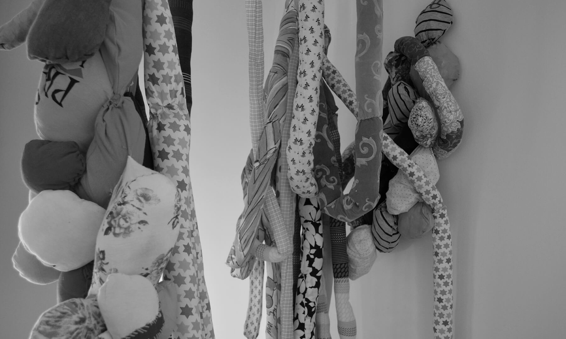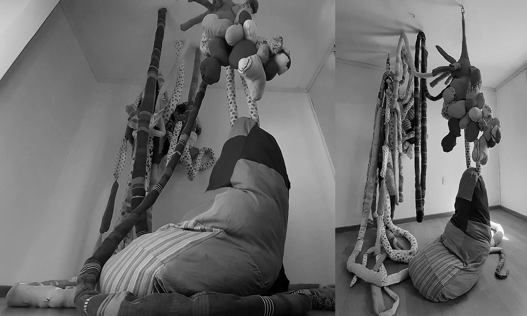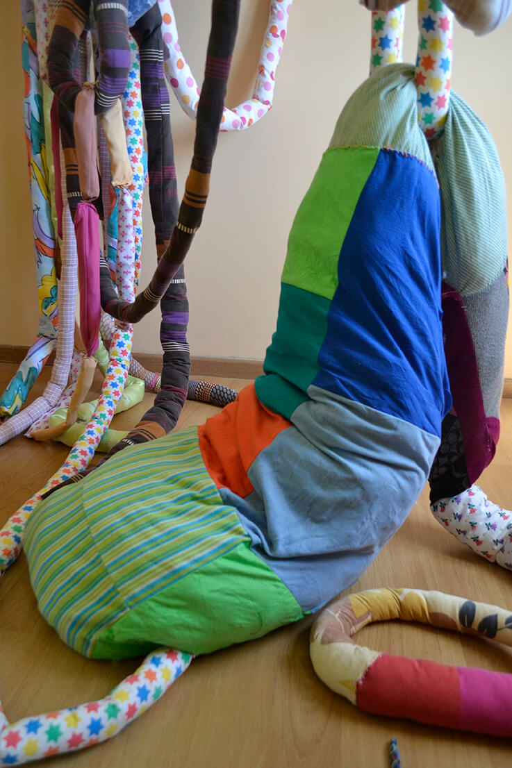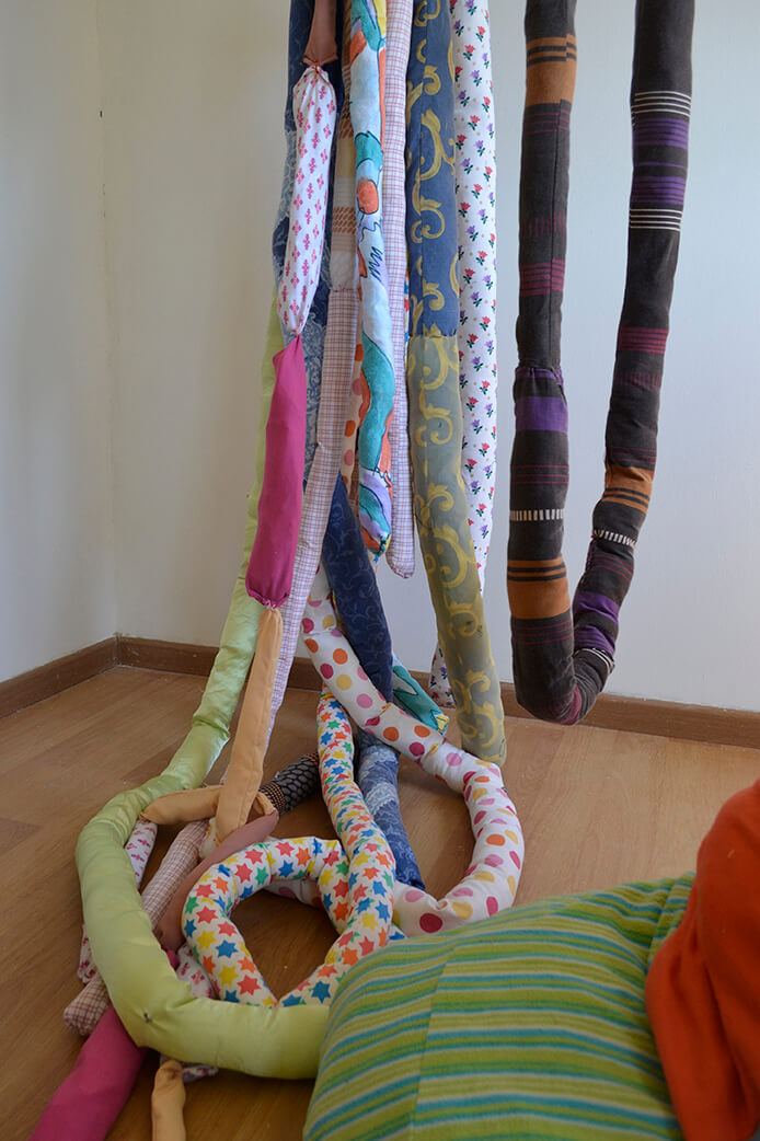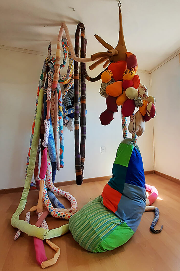 Al ir creciendo, el miedo también lo hizo conmigo, así comenzaron las parálisis y pesadillas que poco apoco quitaron mis ganas de conciliar el sueño. Mi trabajo comienza cuando reconozco este miedo y de manera inconsciente busco la forma de materializar esta emoción. Desde aquí surge la creación de cuerpos por medio del trabajo textil, mediante la unión de piezas, pretendo simular cuerpos deformes, llenos de colores, estampados, tamaños diversos, formas orgánicas, equilibradas y desequilibradas, invasión y obsesión. Las transparencias, los colores, la tensión de las telas e hilos, incluso son elementos imprescindibles en mi escultura. Mi pieza se ha convertido en un lugar de albergue de todos estos seres que atormentan mis noches, los cuales me asedian mental y físicamente.