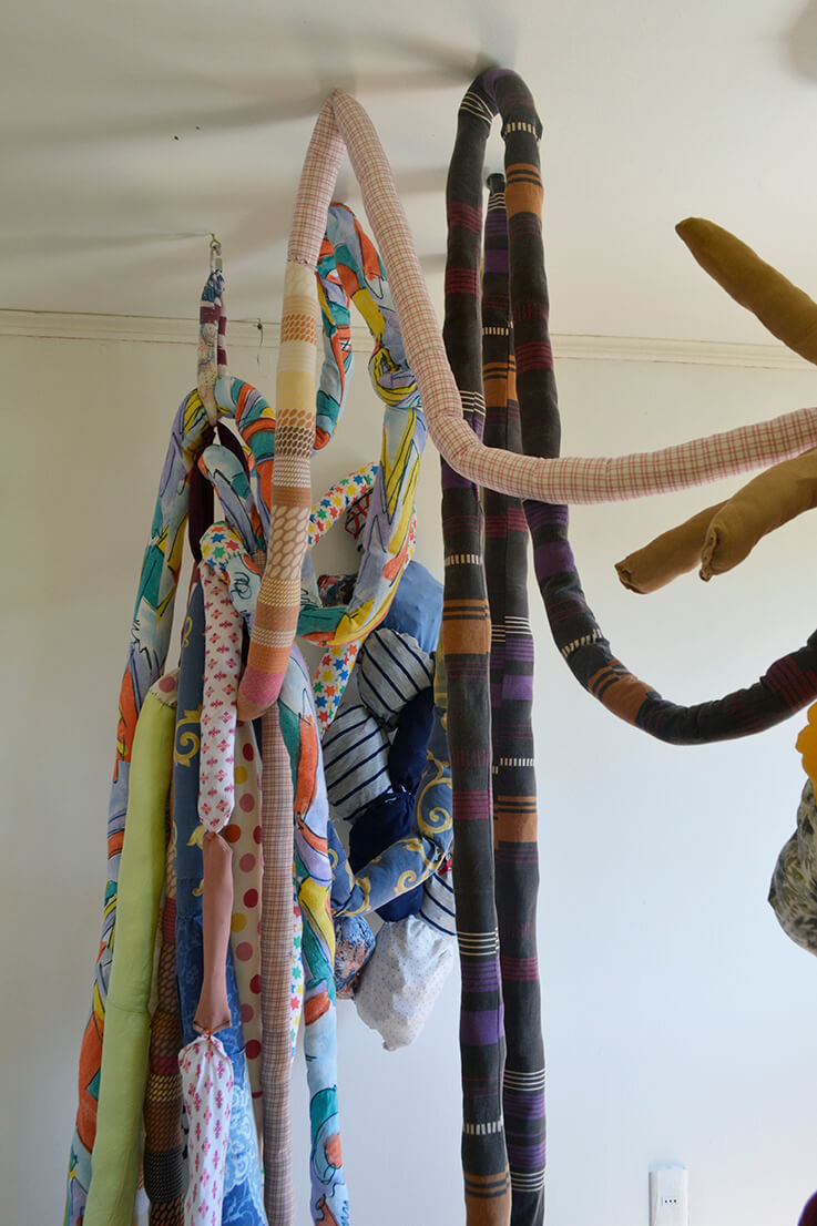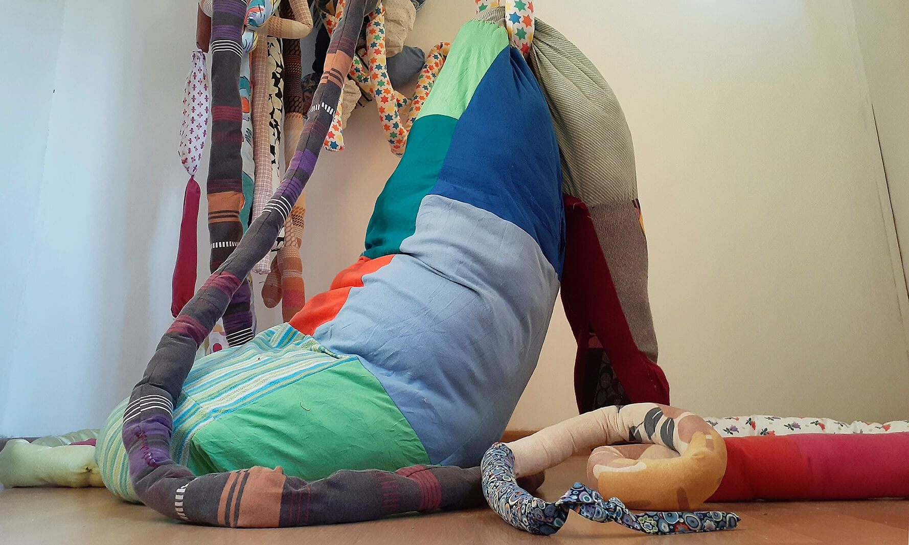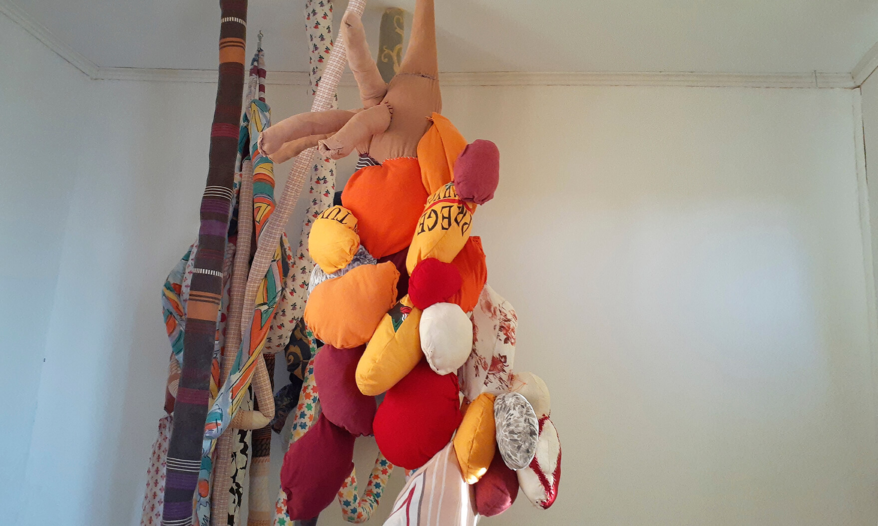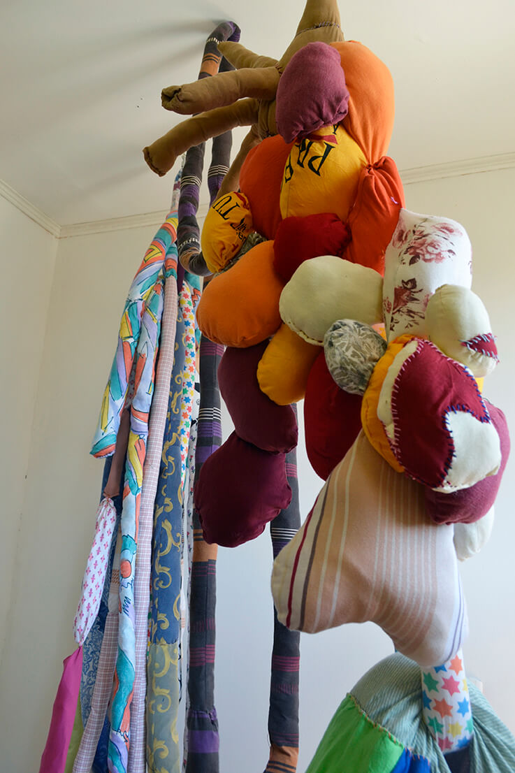Al ir creciendo, el miedo también lo hizo conmigo, así comenzaron las parálisis y pesadillas que poco apoco quitaron mis ganas de conciliar el sueño. Mi trabajo comienza cuando reconozco este miedo y de manera inconsciente busco la forma de materializar esta emoción. Desde aquí surge la creación de cuerpos por medio del trabajo textil, mediante la unión de piezas, pretendo simular cuerpos deformes, llenos de colores, estampados, tamaños diversos, formas orgánicas, equilibradas y desequilibradas, invasión y obsesión. Las transparencias, los colores, la tensión de las telas e hilos, incluso son elementos imprescindibles en mi escultura. Mi pieza se ha convertido en un lugar de albergue de todos estos seres que atormentan mis noches, los cuales me asedian mental y físicamente.