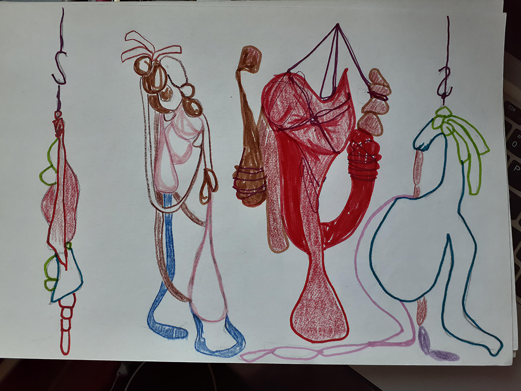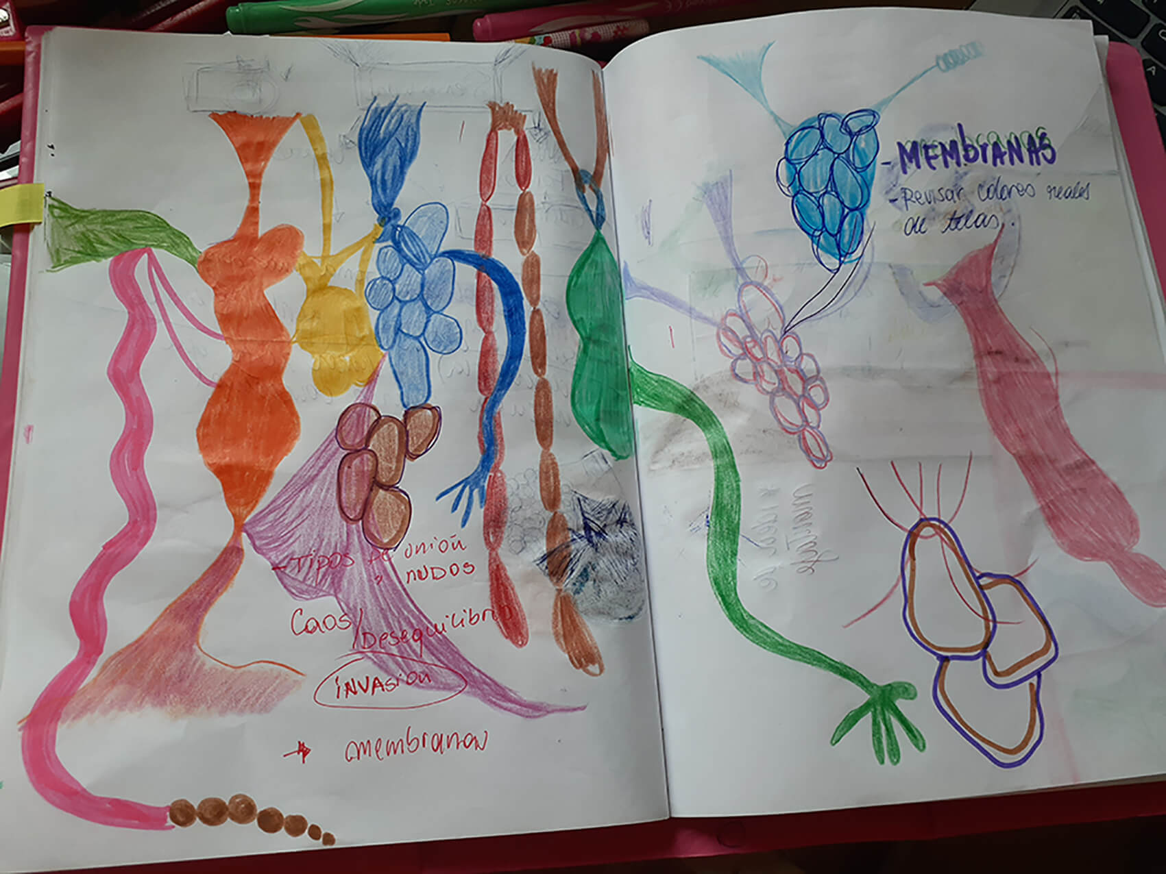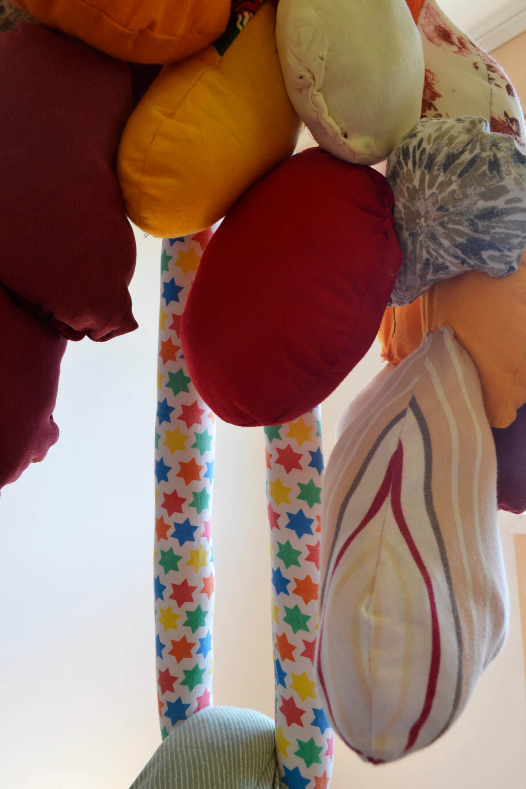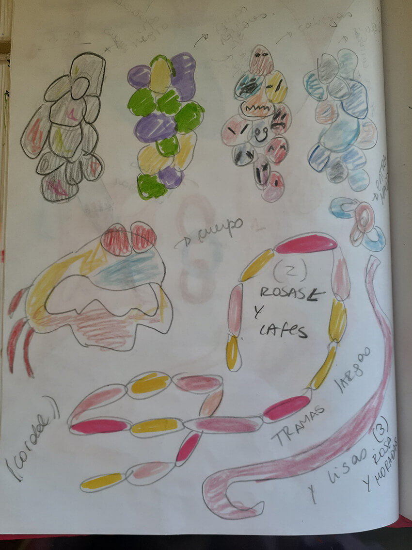 Al ir creciendo, el miedo también lo hizo conmigo, así comenzaron las parálisis y pesadillas que poco apoco quitaron mis ganas de conciliar el sueño. Mi trabajo comienza cuando reconozco este miedo y de manera inconsciente busco la forma de materializar esta emoción. Desde aquí surge la creación de cuerpos por medio del trabajo textil, mediante la unión de piezas, pretendo simular cuerpos deformes, llenos de colores, estampados, tamaños diversos, formas orgánicas, equilibradas y desequilibradas, invasión y obsesión. Las transparencias, los colores, la tensión de las telas e hilos, incluso son elementos imprescindibles en mi escultura. Mi pieza se ha convertido en un lugar de albergue de todos estos seres que atormentan mis noches, los cuales me asedian mental y físicamente.