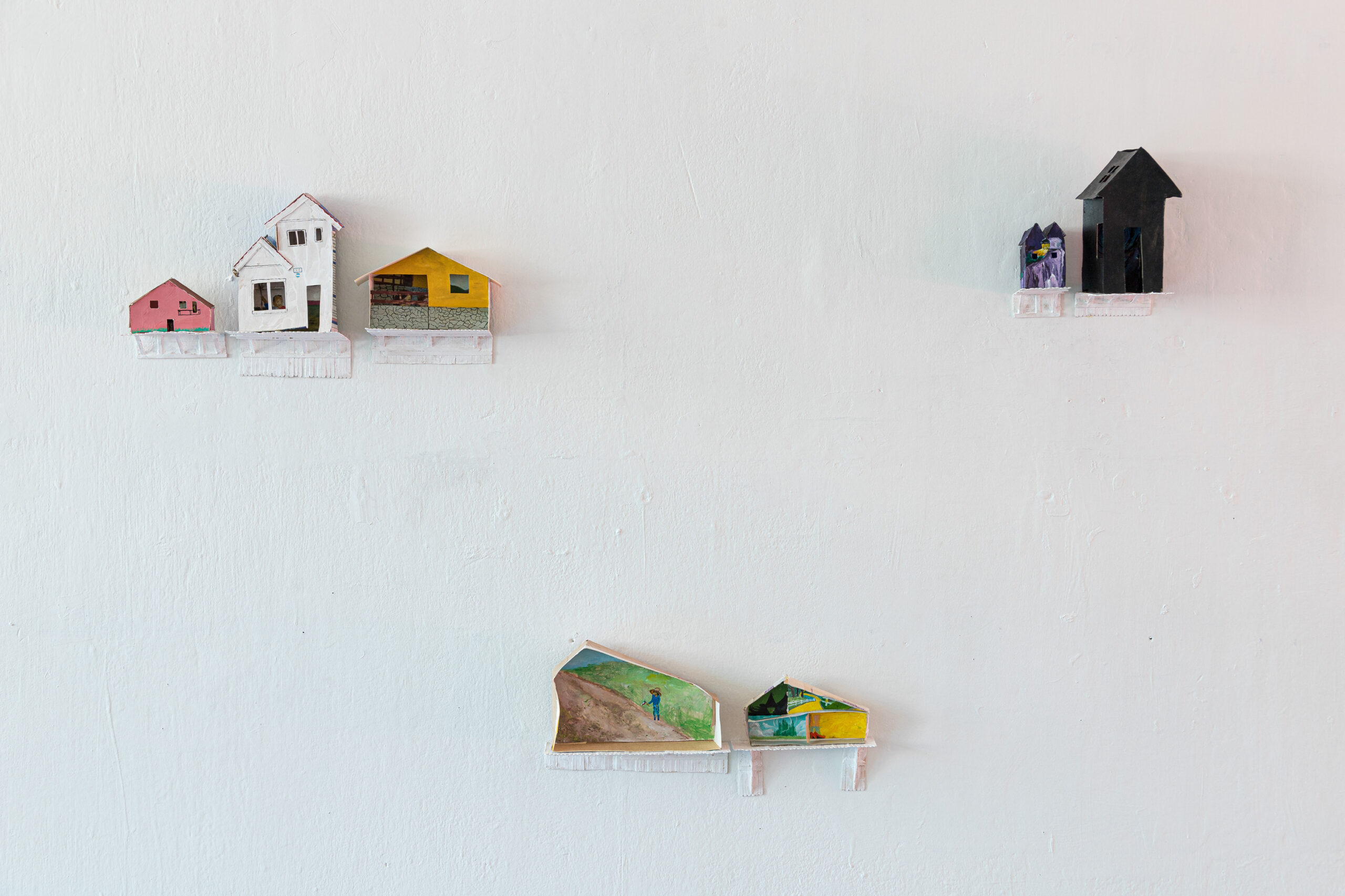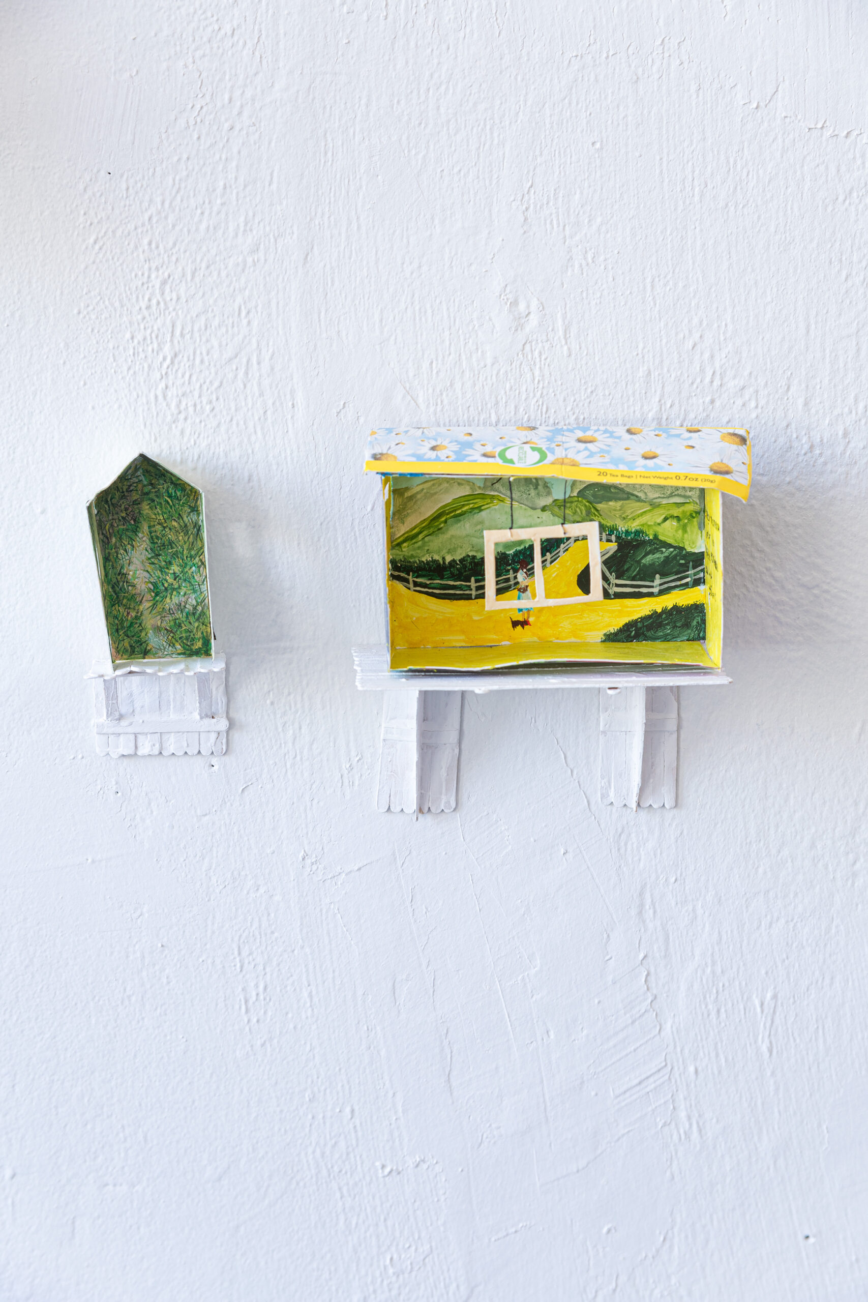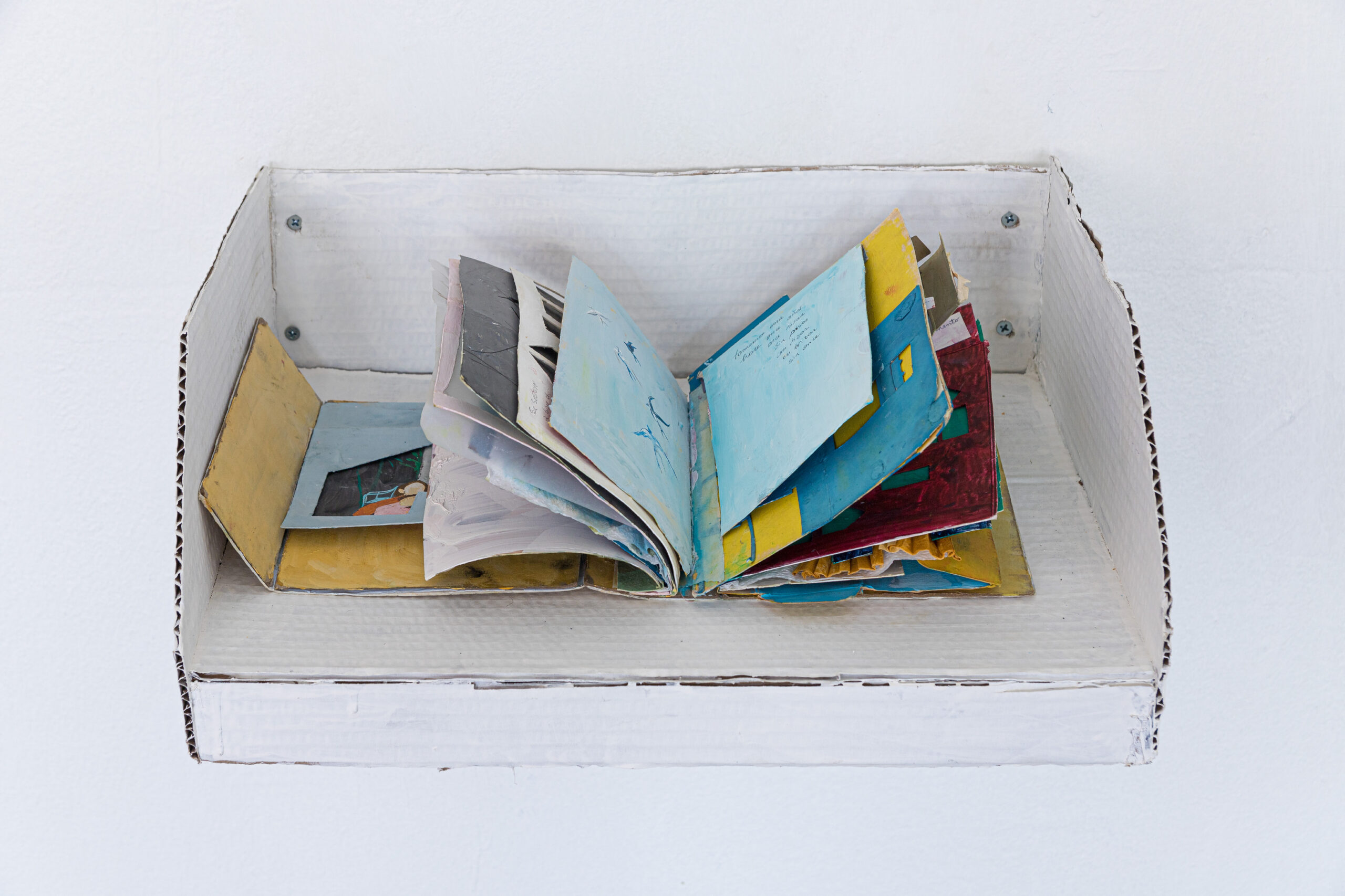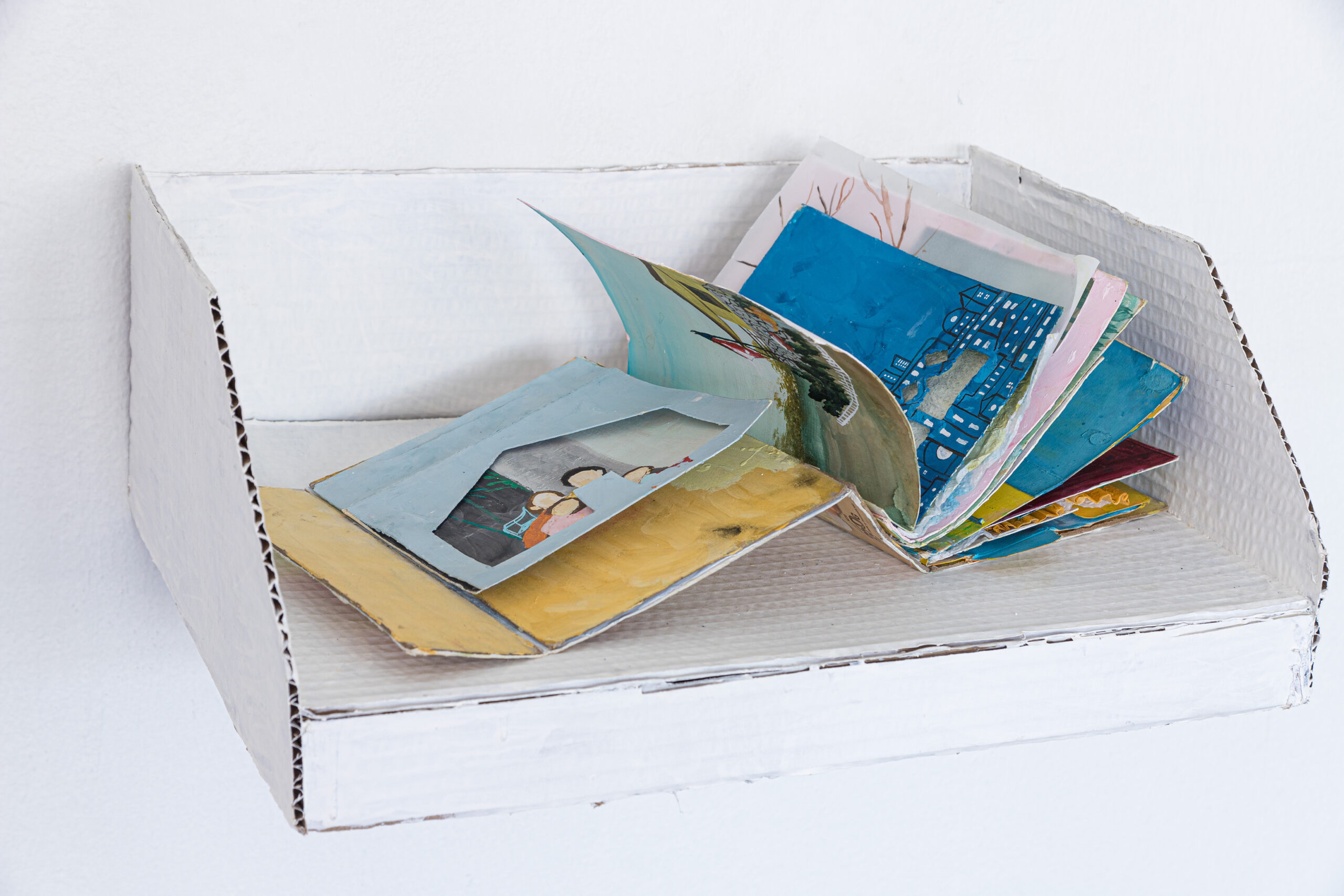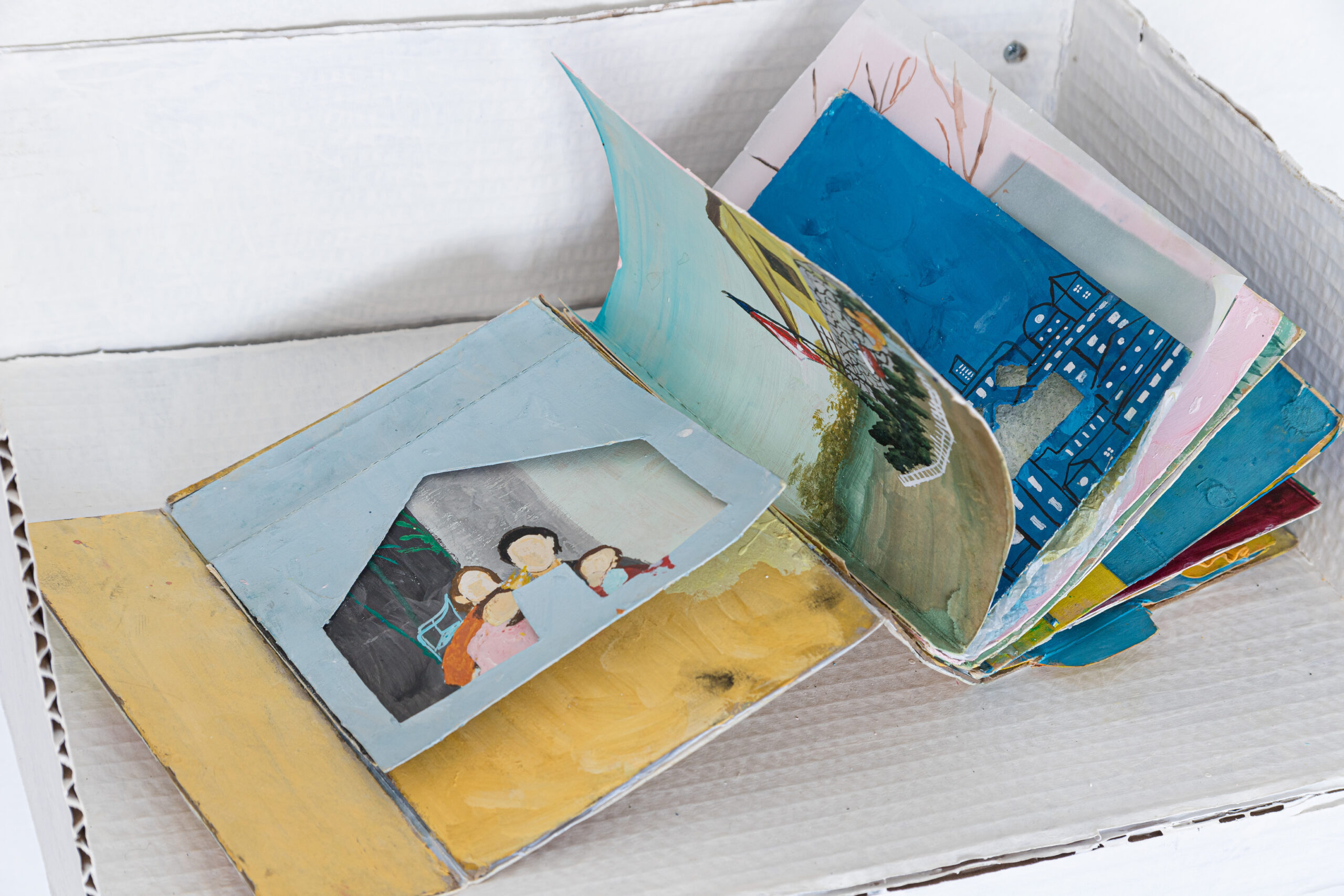 SOFÍA LÓPEZ. Villa López , figuras, técnica mixta, acrílico sobre cartón, dimensiones variables. Libro, acrílico sobre cartón recolectado, 19 x 14 x 6 cm, 2024.
