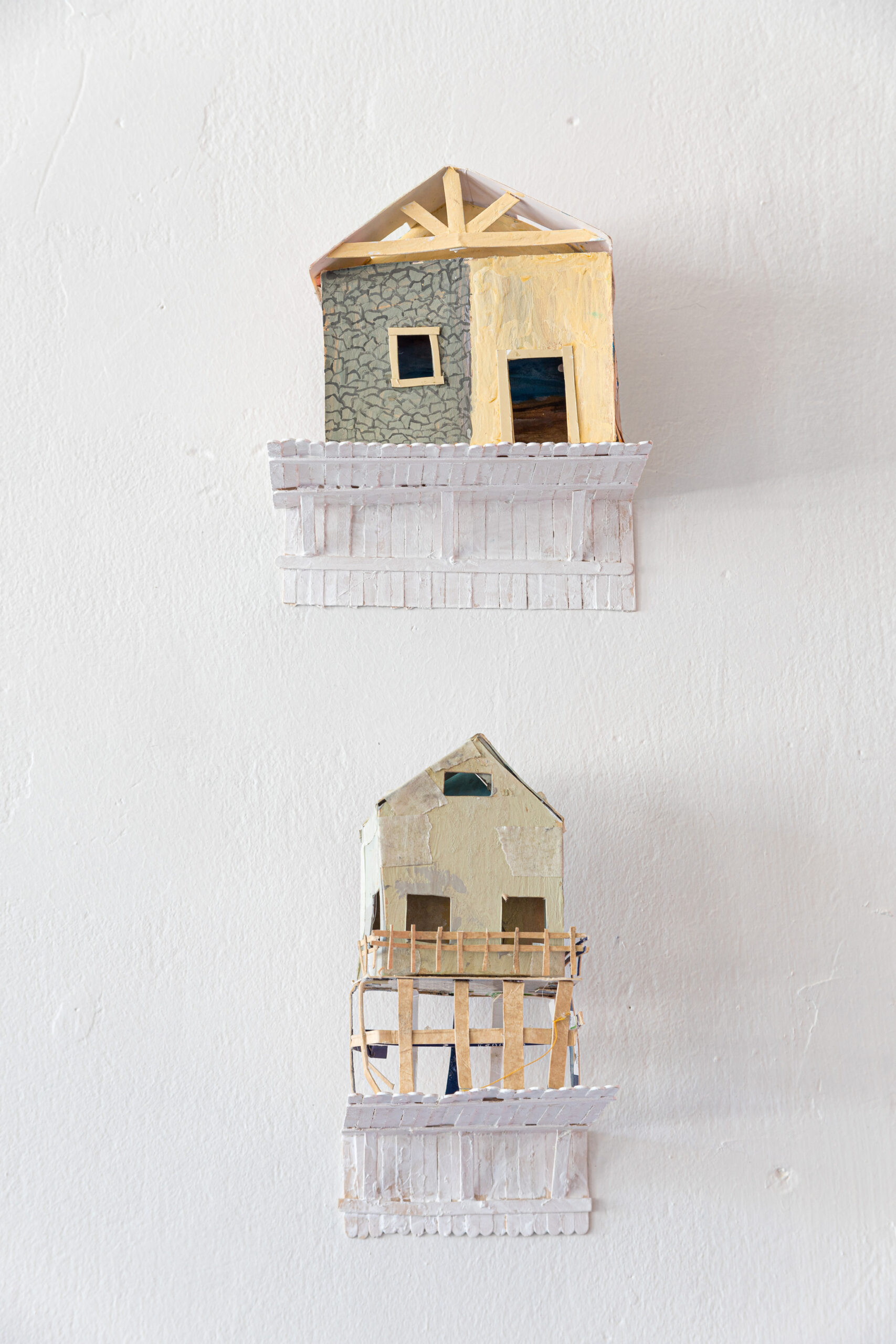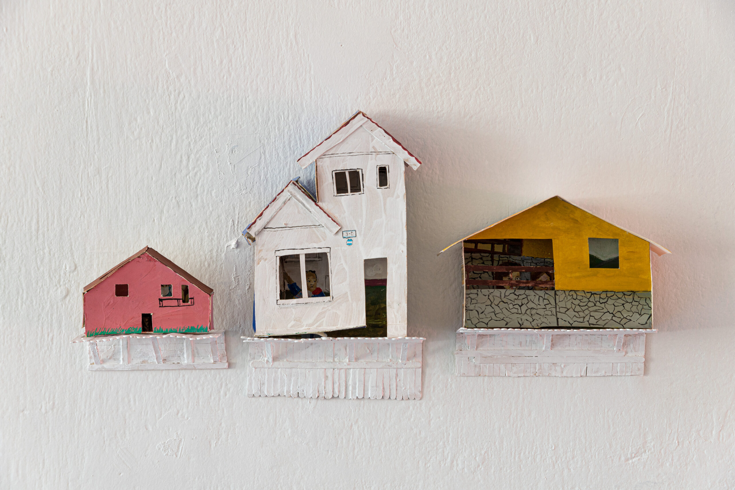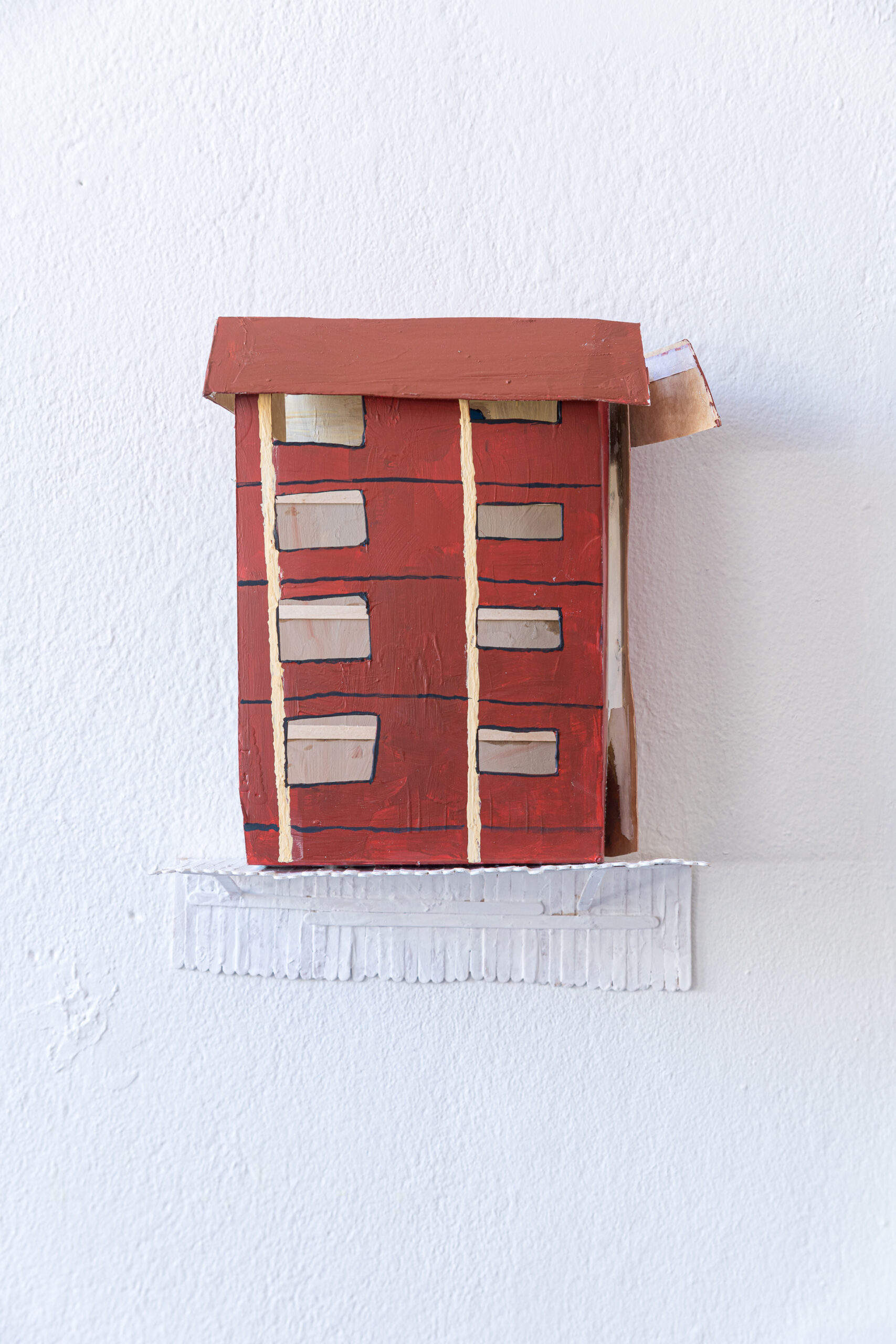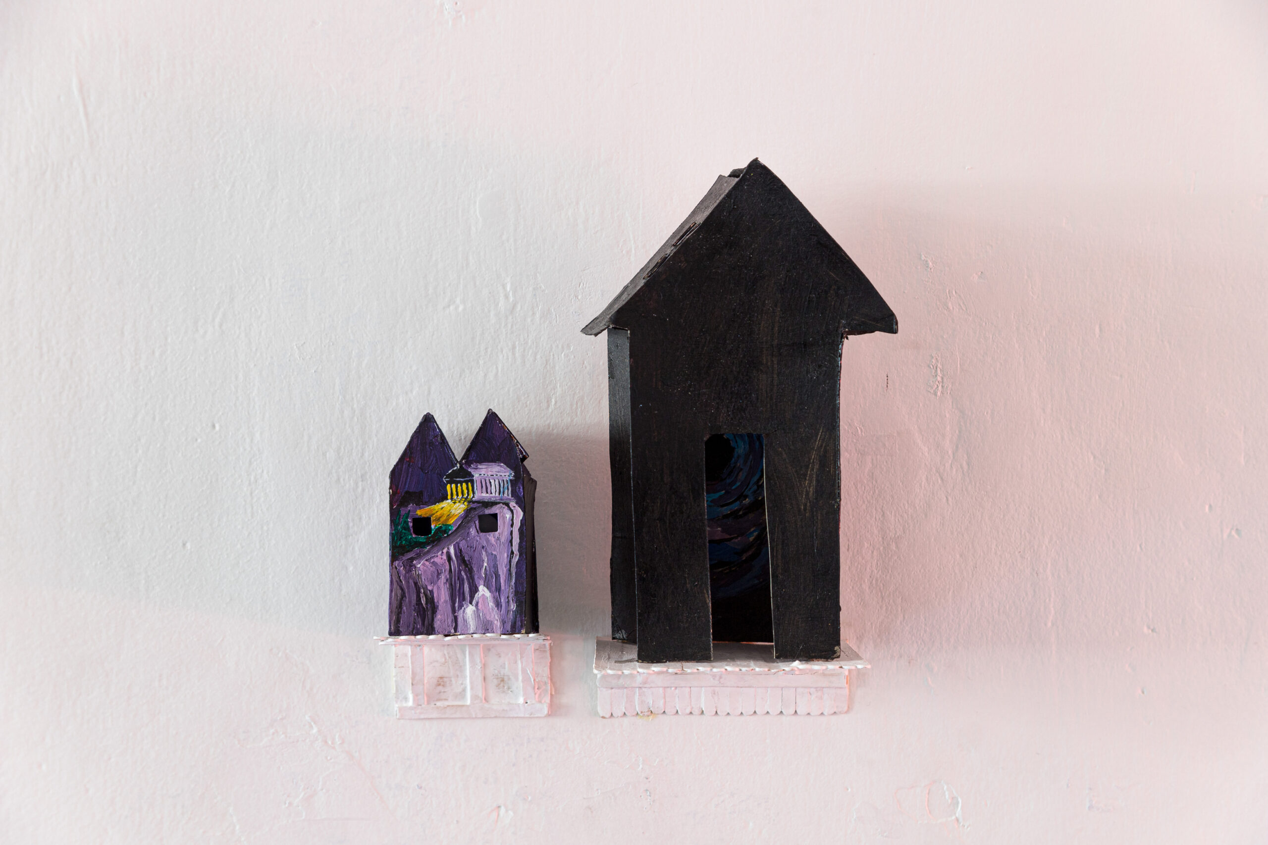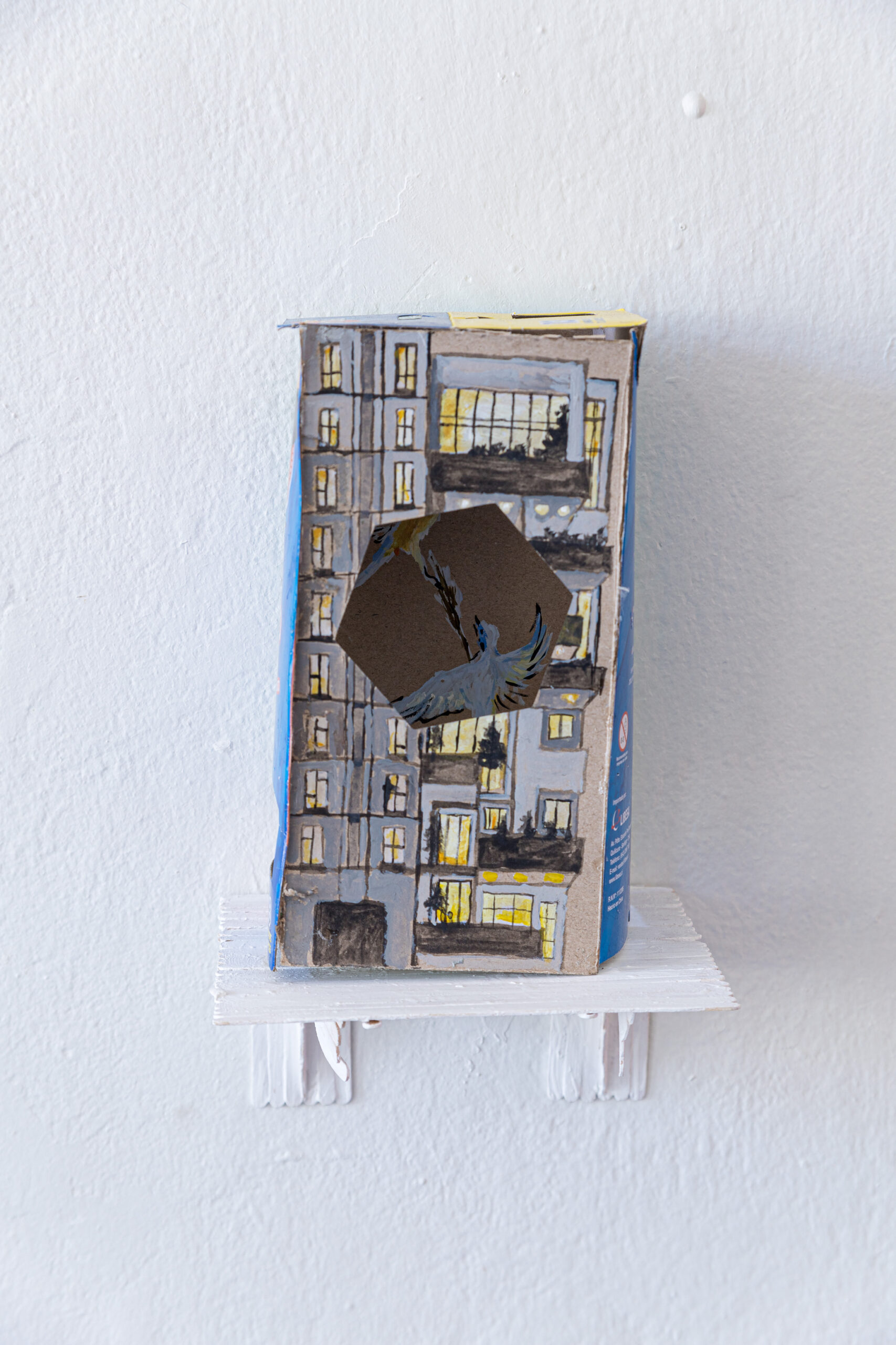 SOFÍA LÓPEZ. Villa López , figuras, técnica mixta, acrílico sobre cartón, dimensiones variables. Libro, acrílico sobre cartón recolectado, 19 x 14 x 6 cm, 2024.