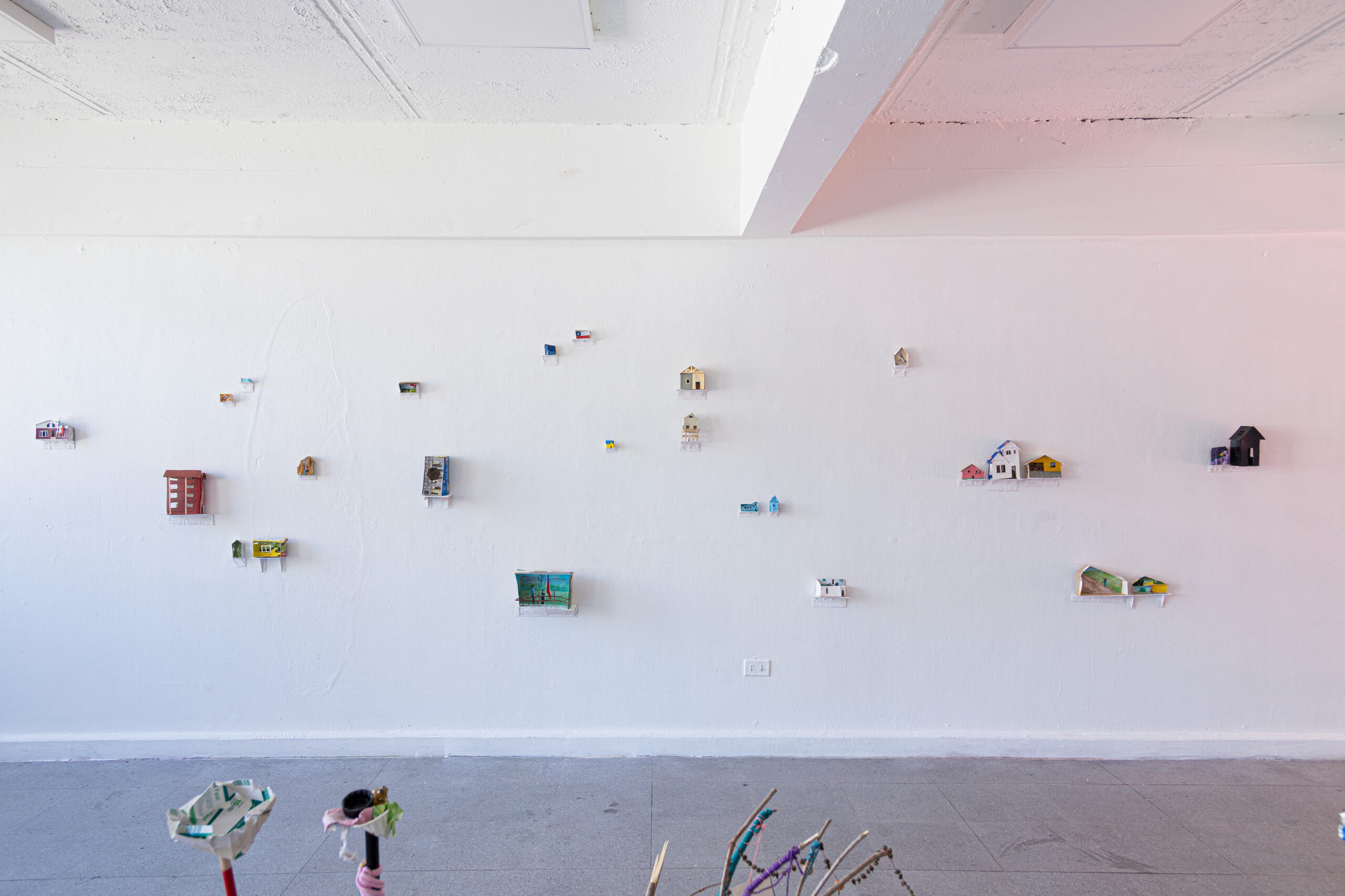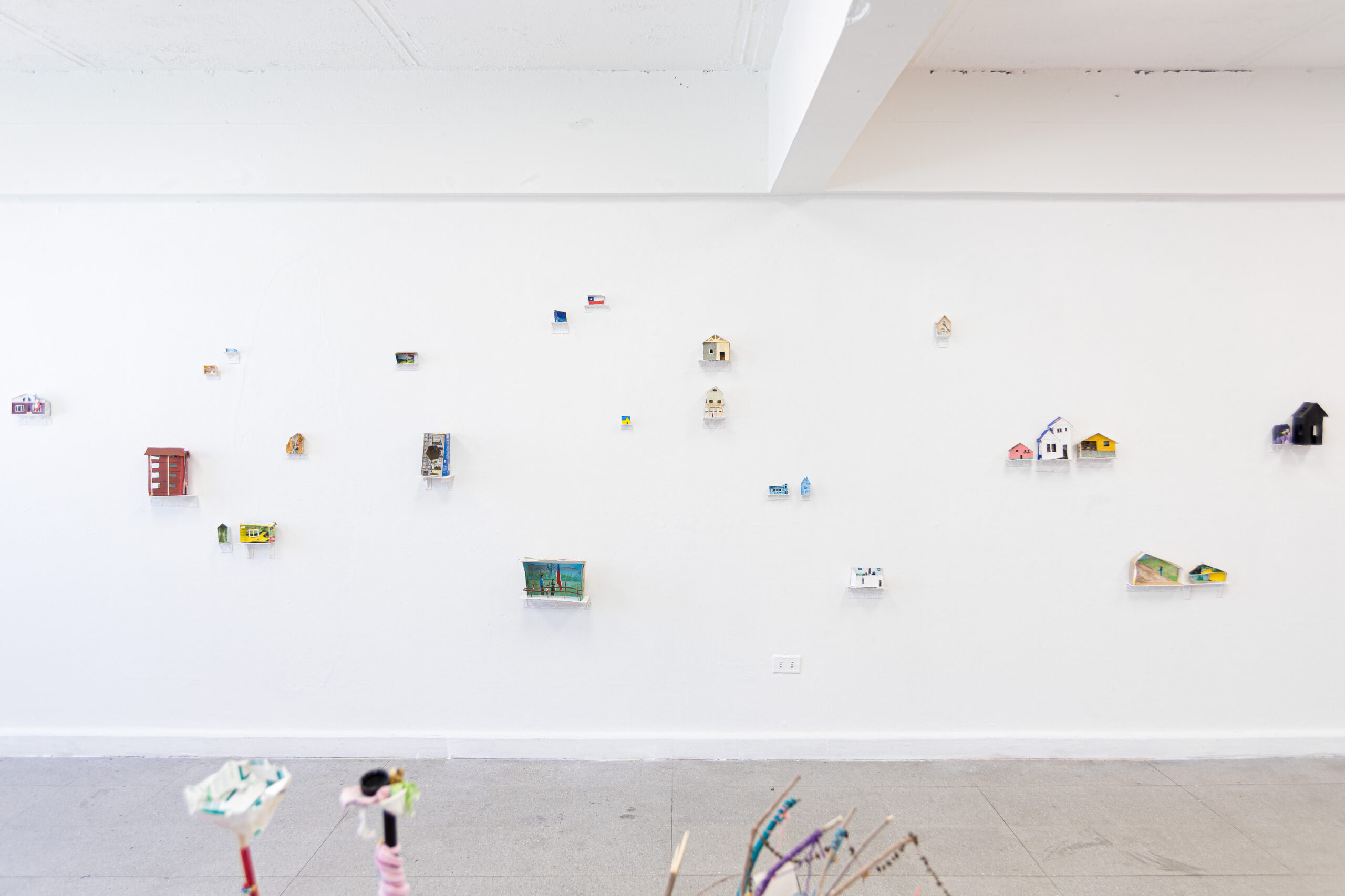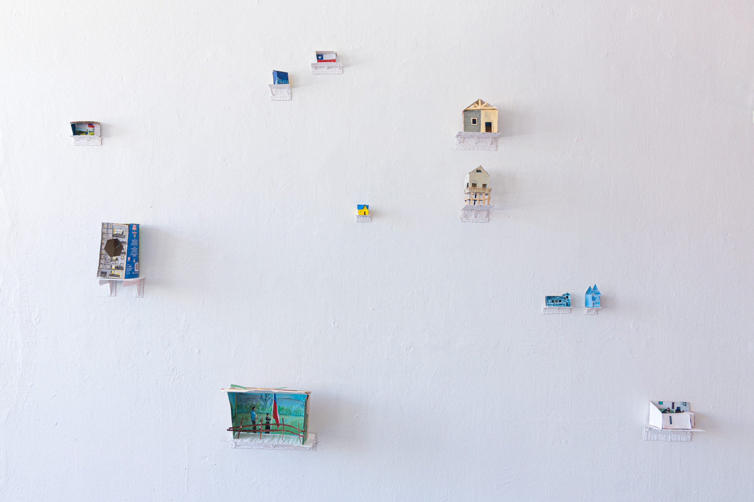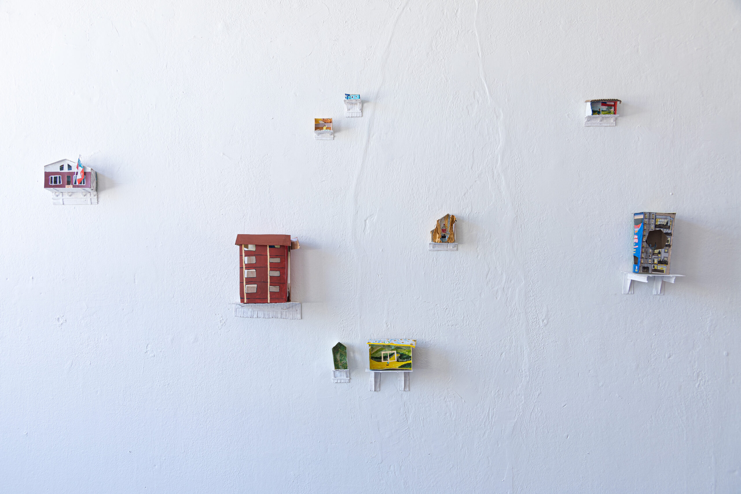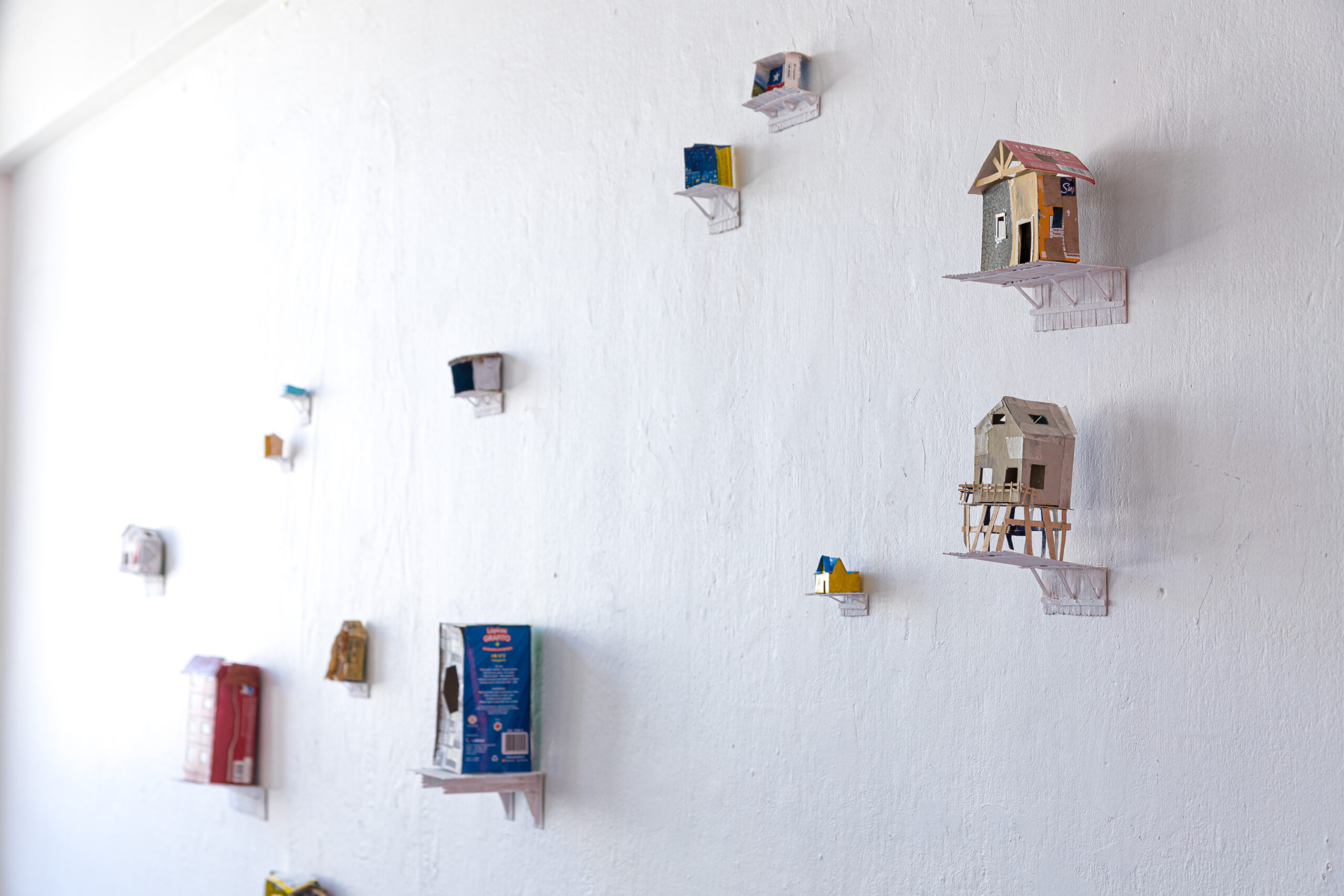 SOFÍA LÓPEZ. Villa López , figuras, técnica mixta, acrílico sobre cartón, dimensiones variables. Libro, acrílico sobre cartón recolectado, 19 x 14 x 6 cm, 2024.