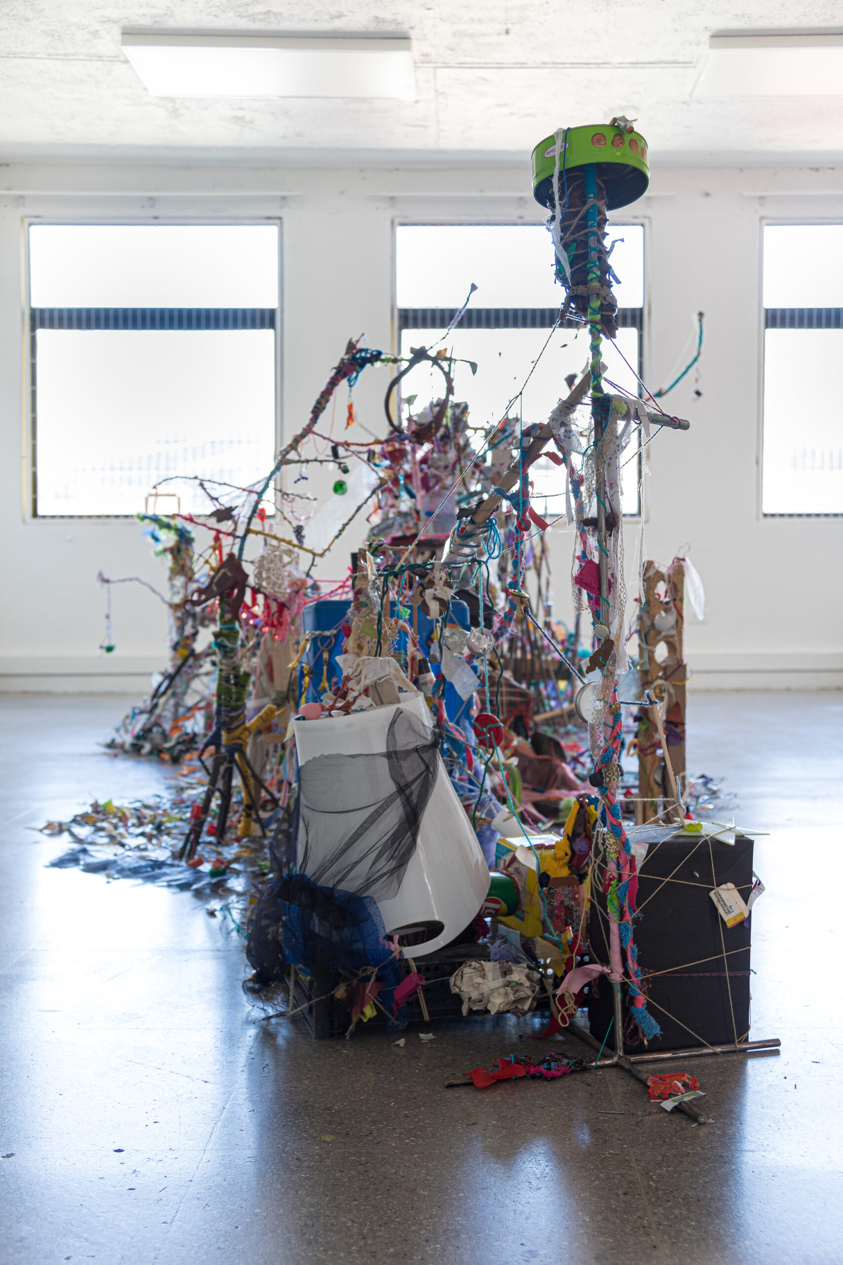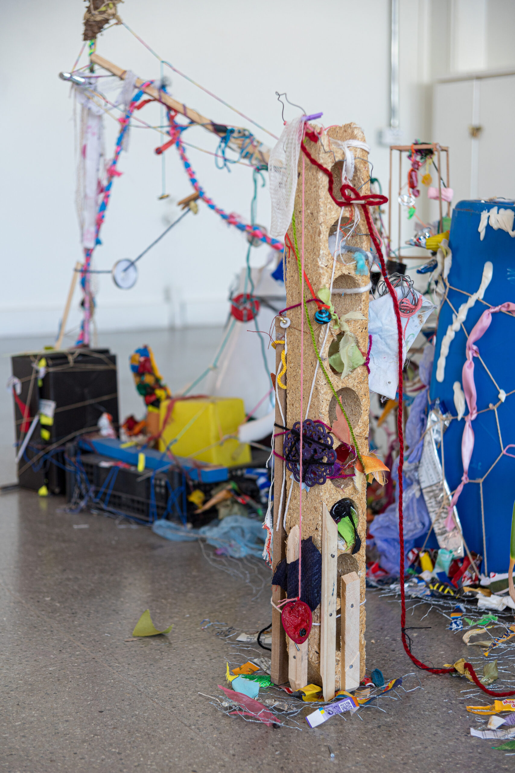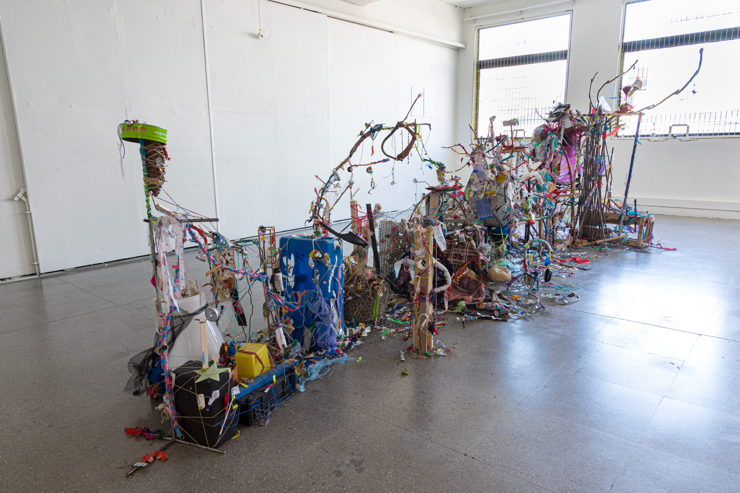 TRINIDAD VEAS. Casita de tela, corazón de urraca , cuerpo escultórico orgánico de elementos encontrados y descartados como tapas, envoltorios, lana y boletas, intervenidos, conectados y re-articulados, 175 x 534 x 152 cm, 2024.