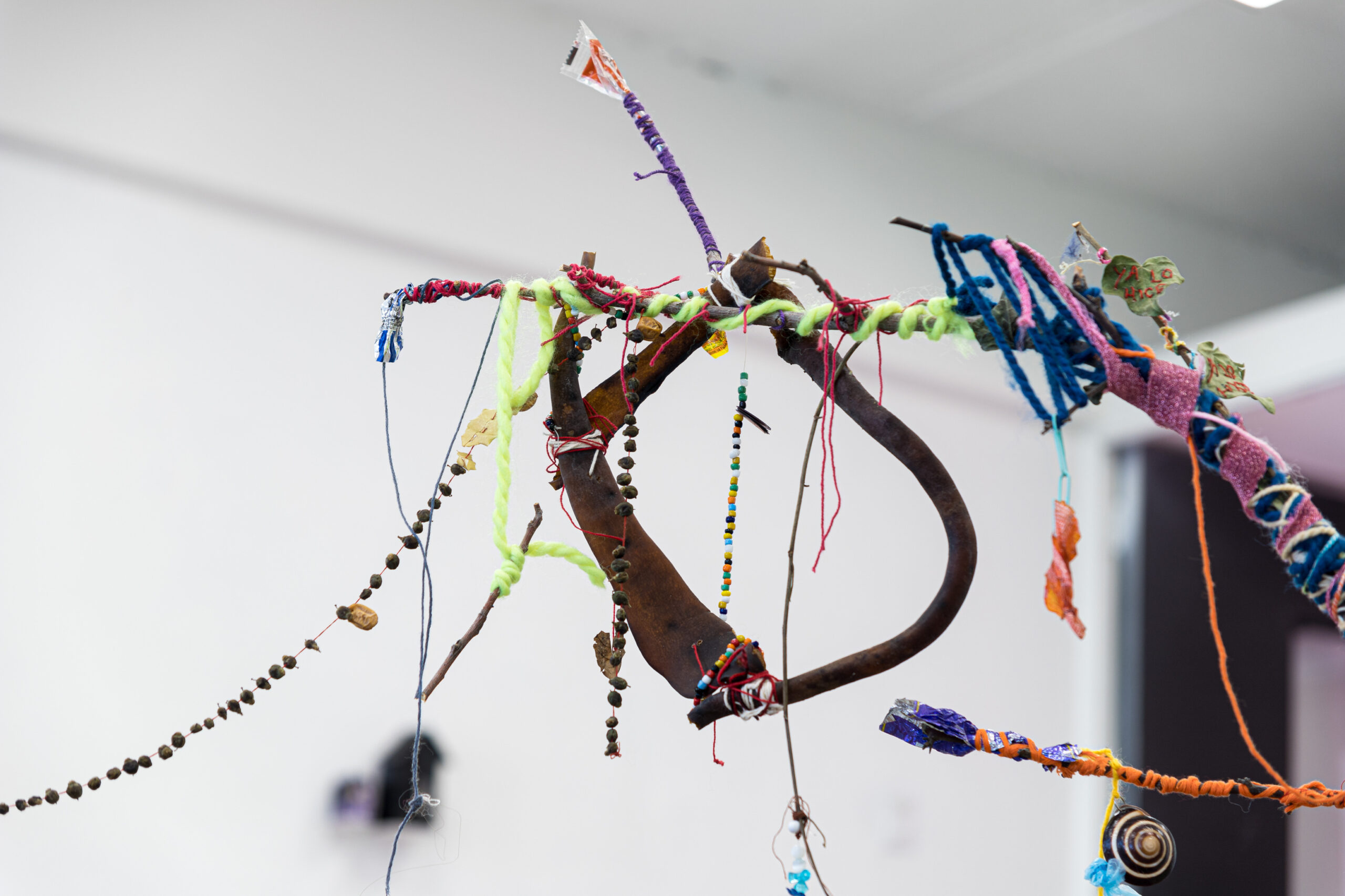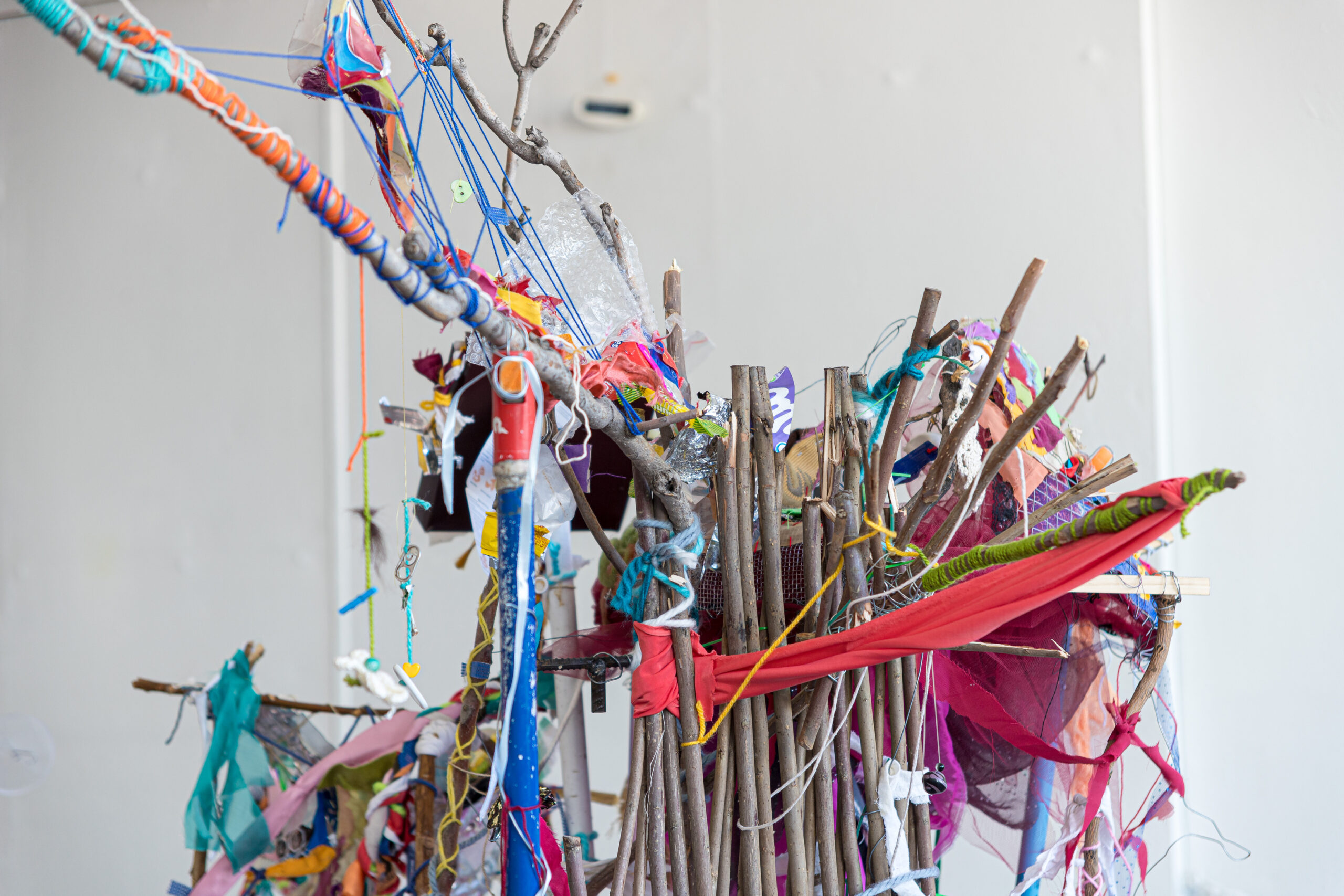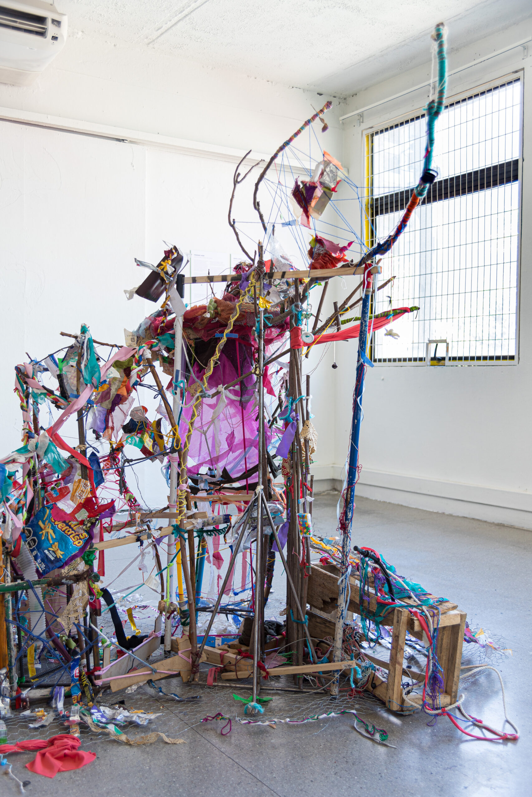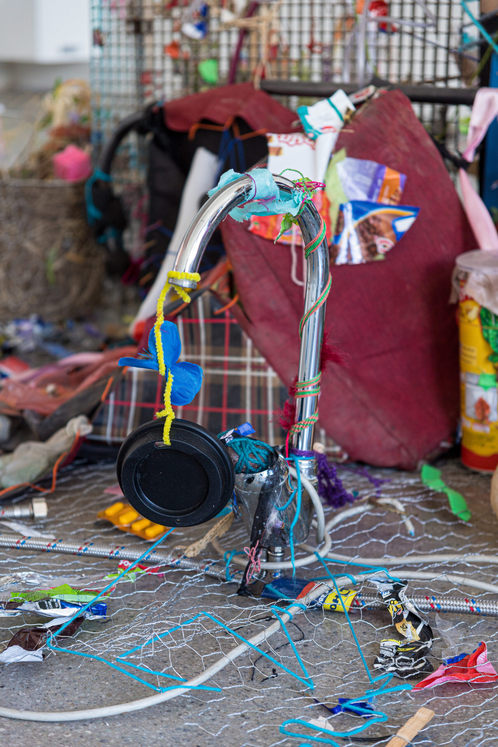 TRINIDAD VEAS. Casita de tela, corazón de urraca , cuerpo escultórico orgánico de elementos encontrados y descartados como tapas, envoltorios, lana y boletas, intervenidos, conectados y re-articulados, 175 x 534 x 152 cm, 2024.