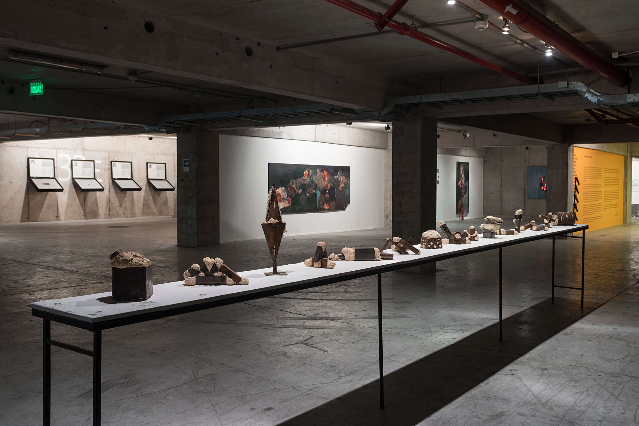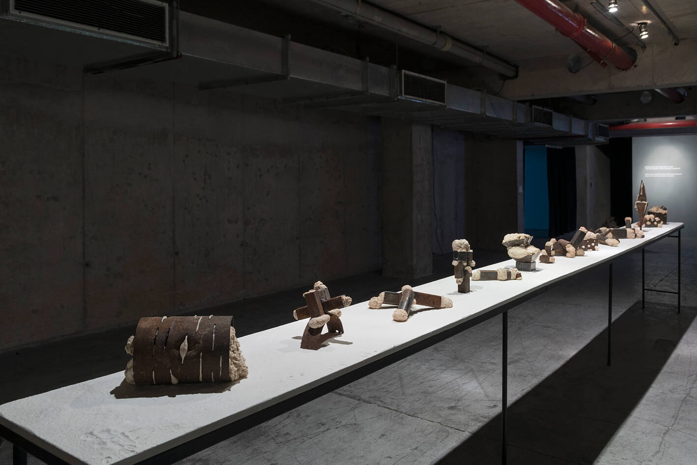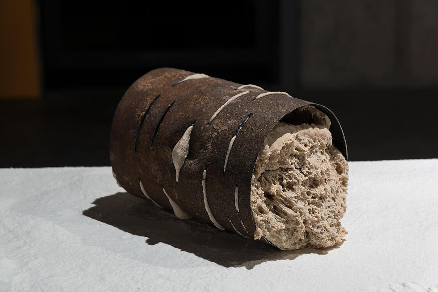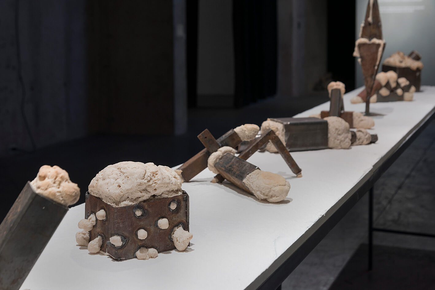 Valentina Morales, Tensión equilibrada, 2017. Masa horneada, fierro oxidado y harina. Dimensiones variables.