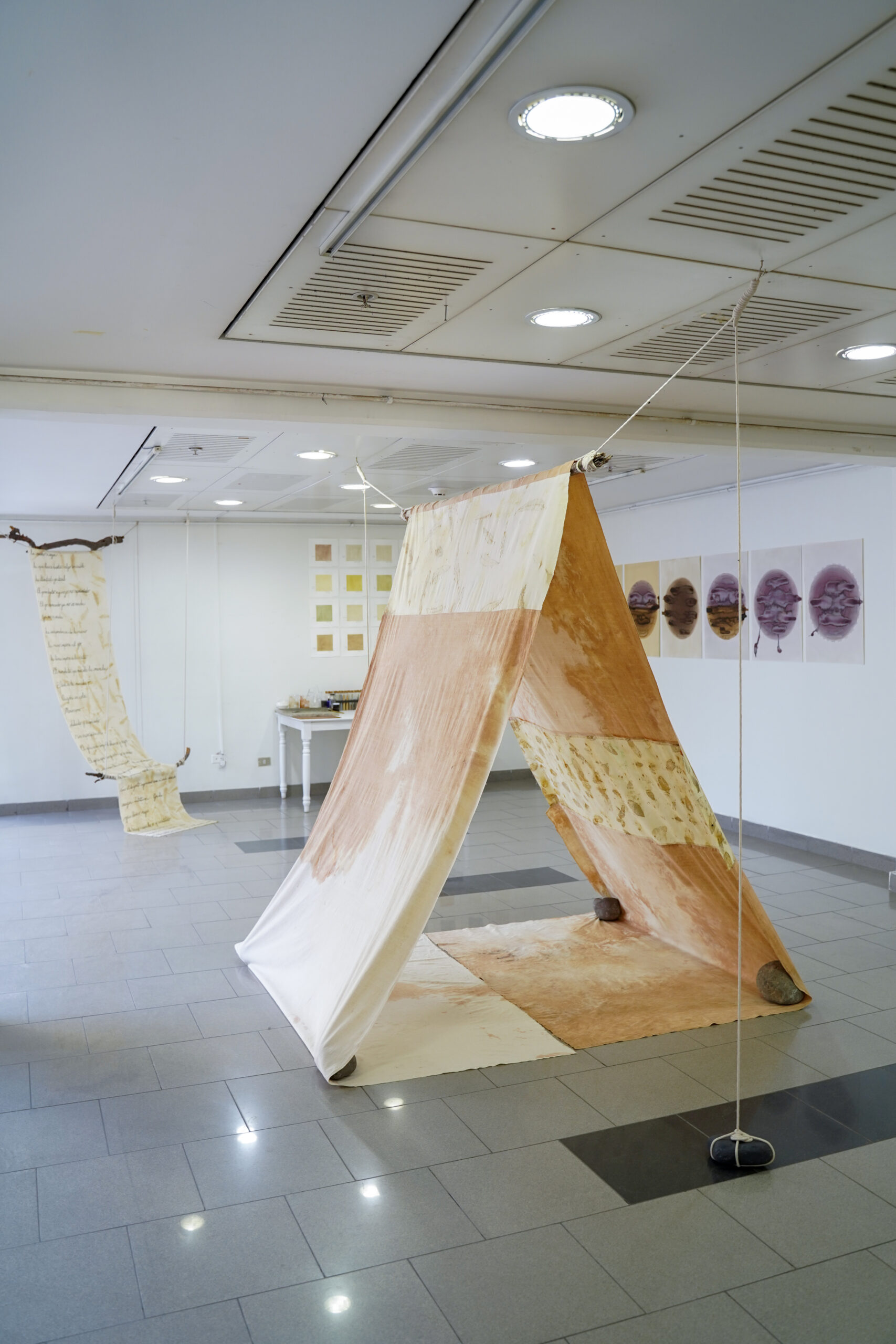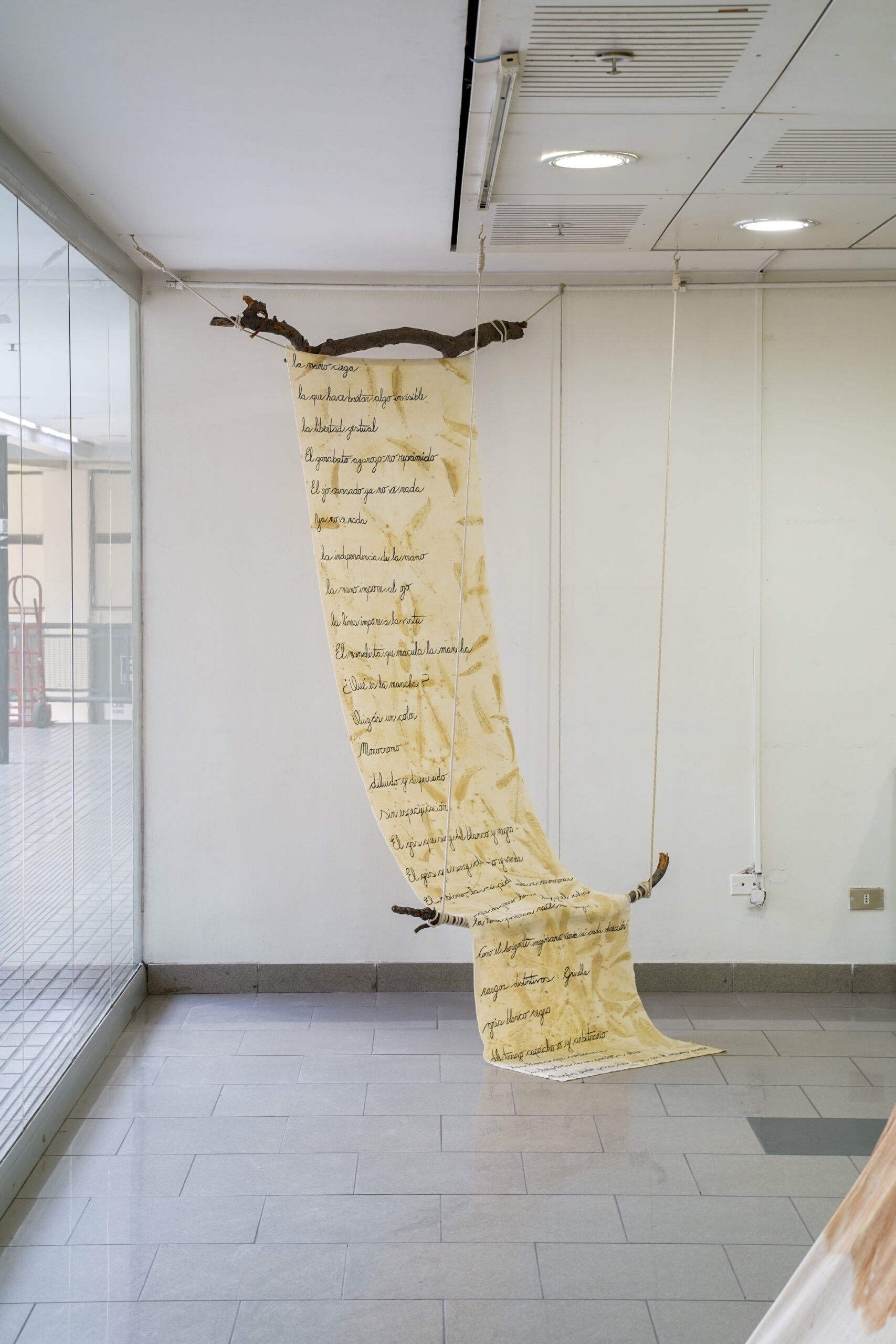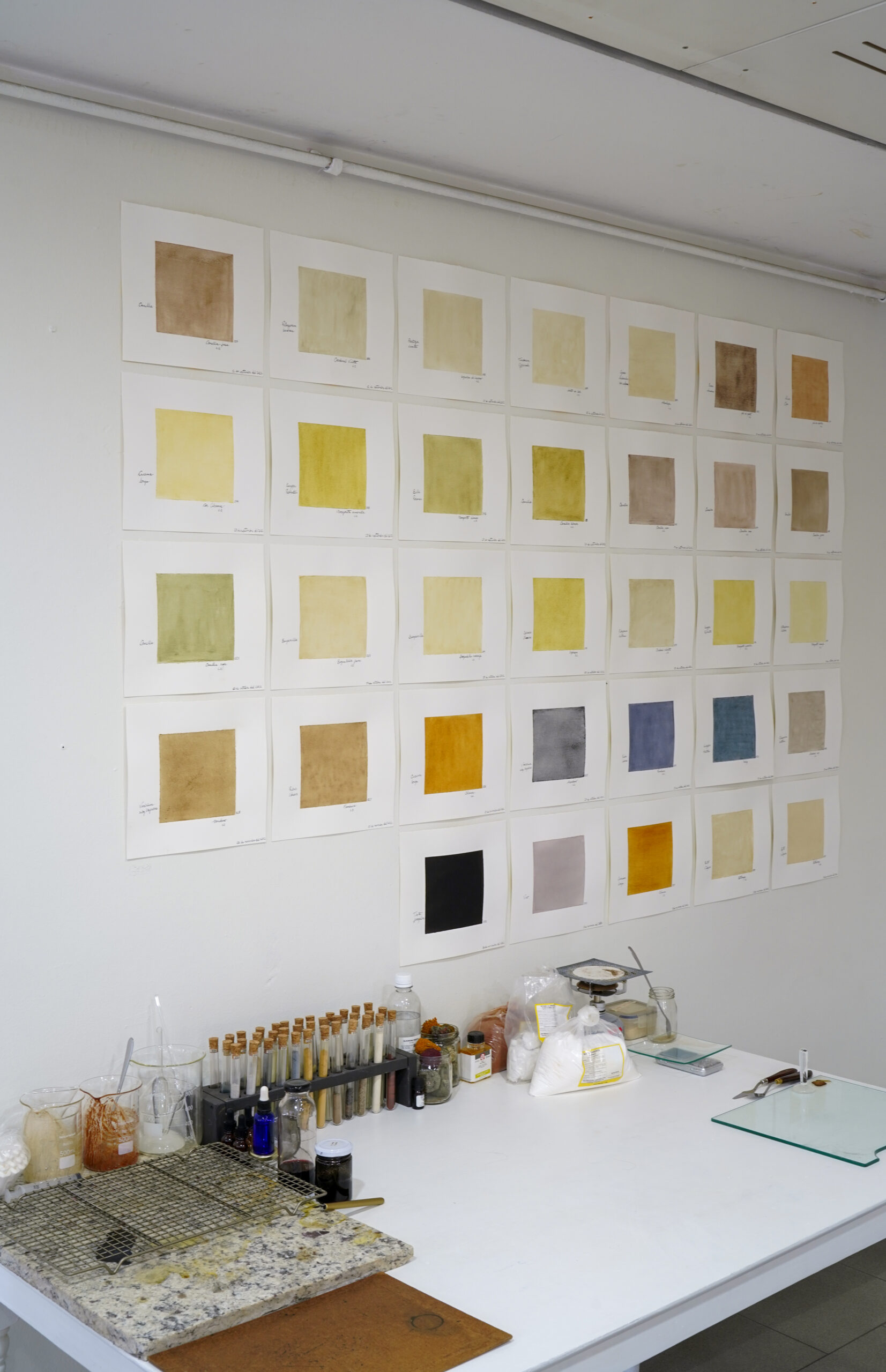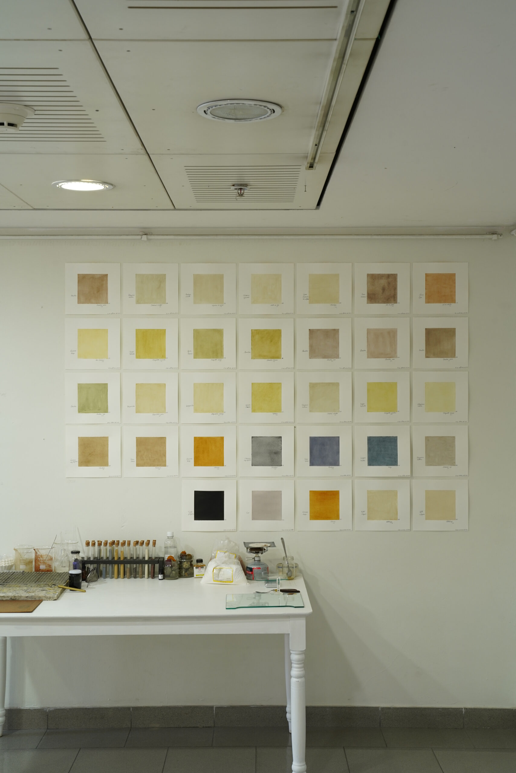 Pigmentos naturales sobre papel acuarelable. Tinta ferrogálica, lino español, rama árbol, cuerda de algodón, piedra. Mesa vasos precipitados, moleta, tubos de ensayo, vidrio grueso, rejilla, cocinilla chica, gotario ámbar, glicerina, aguamiel, panton en papel. Medidas variables.