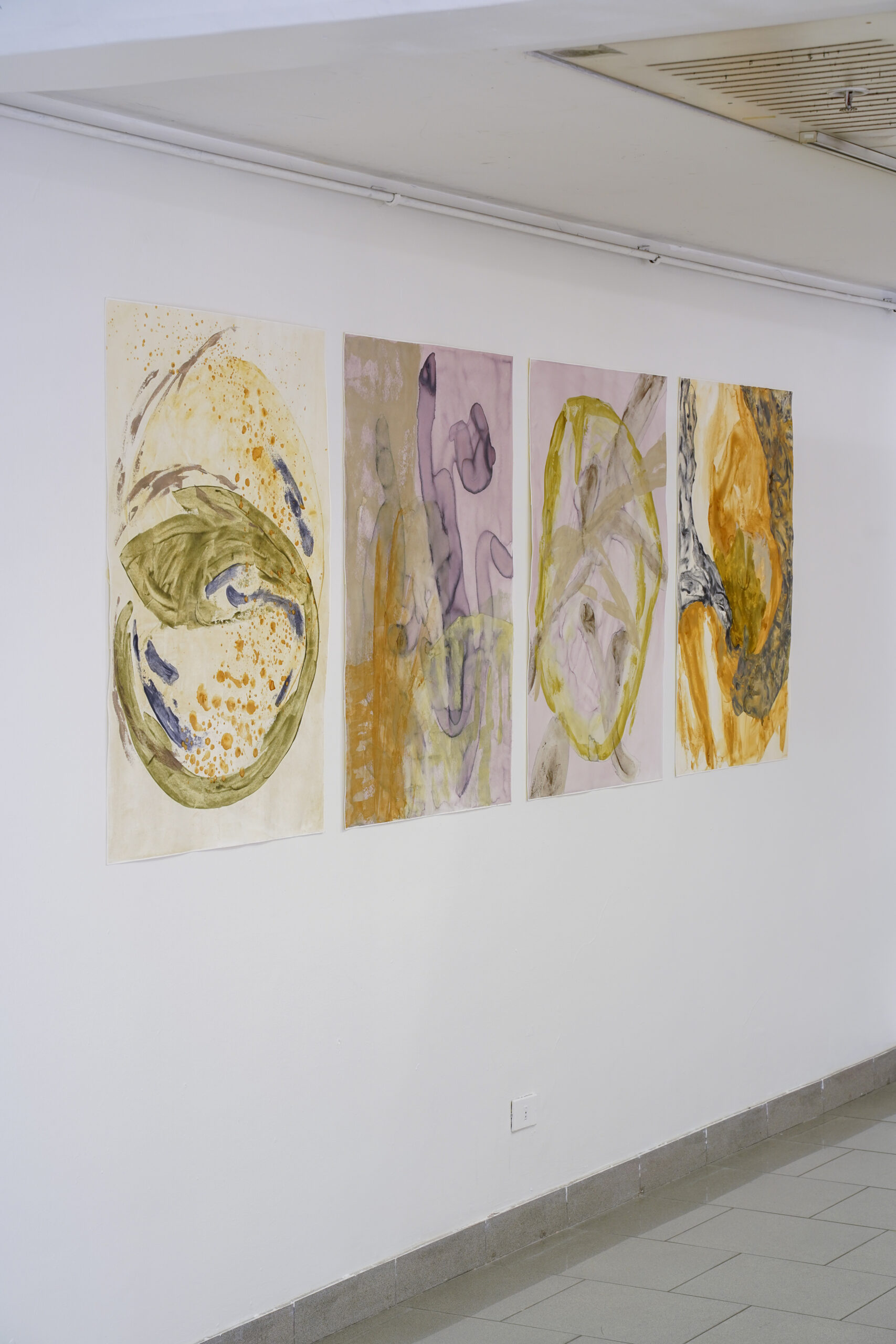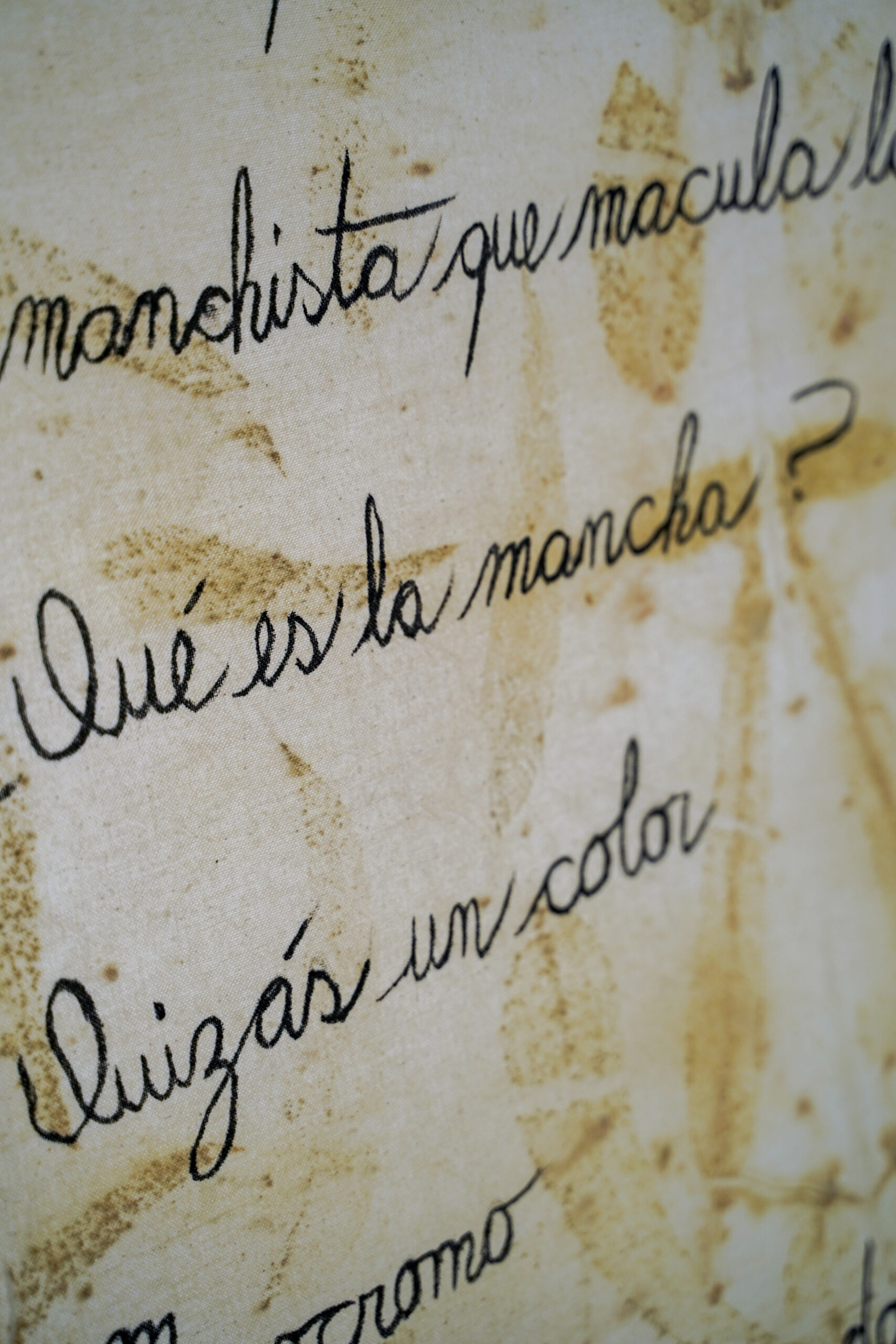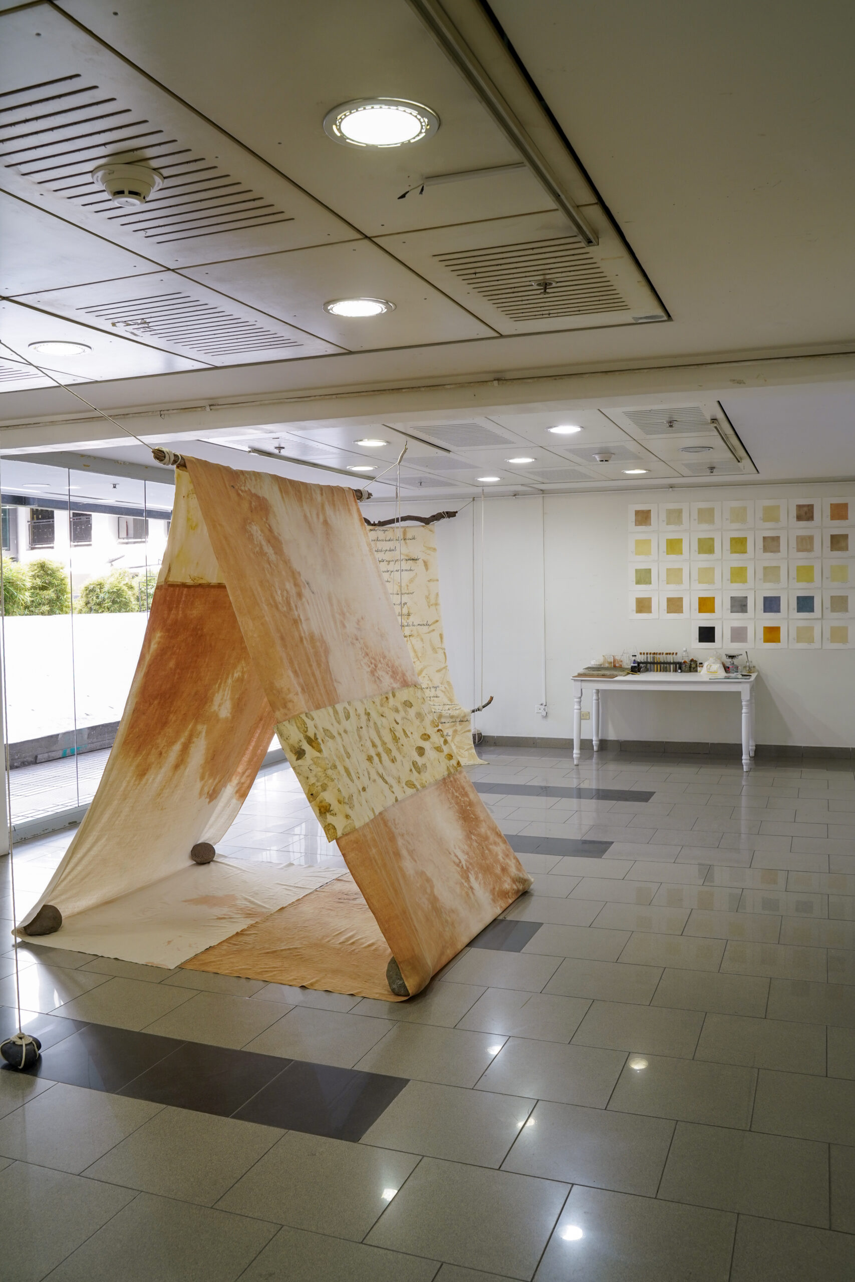 Pigmentos naturales sobre papel acuarelable. Tinta ferrogálica, lino español, rama árbol, cuerda de algodón, piedra. Mesa vasos precipitados, moleta, tubos de ensayo, vidrio grueso, rejilla, cocinilla chica, gotario ámbar, glicerina, aguamiel, panton en papel. Medidas variables.