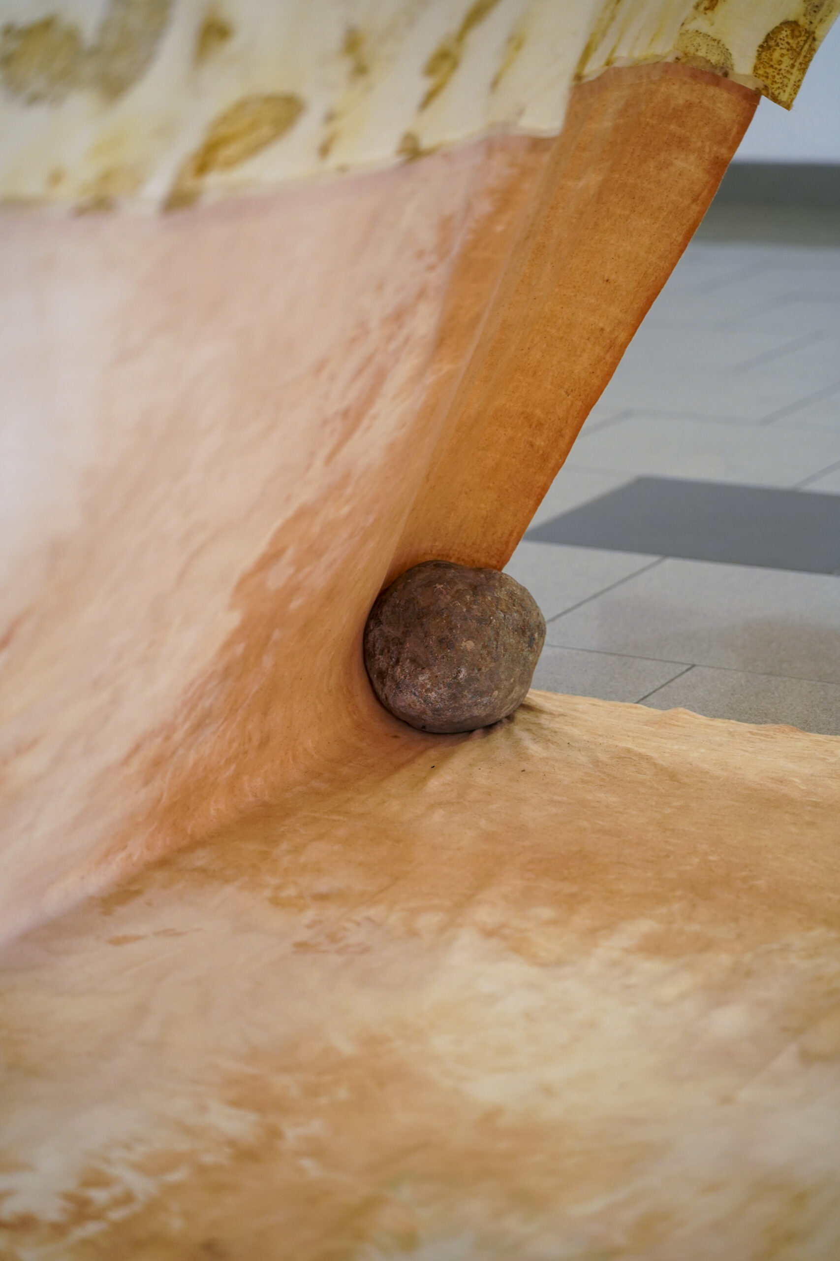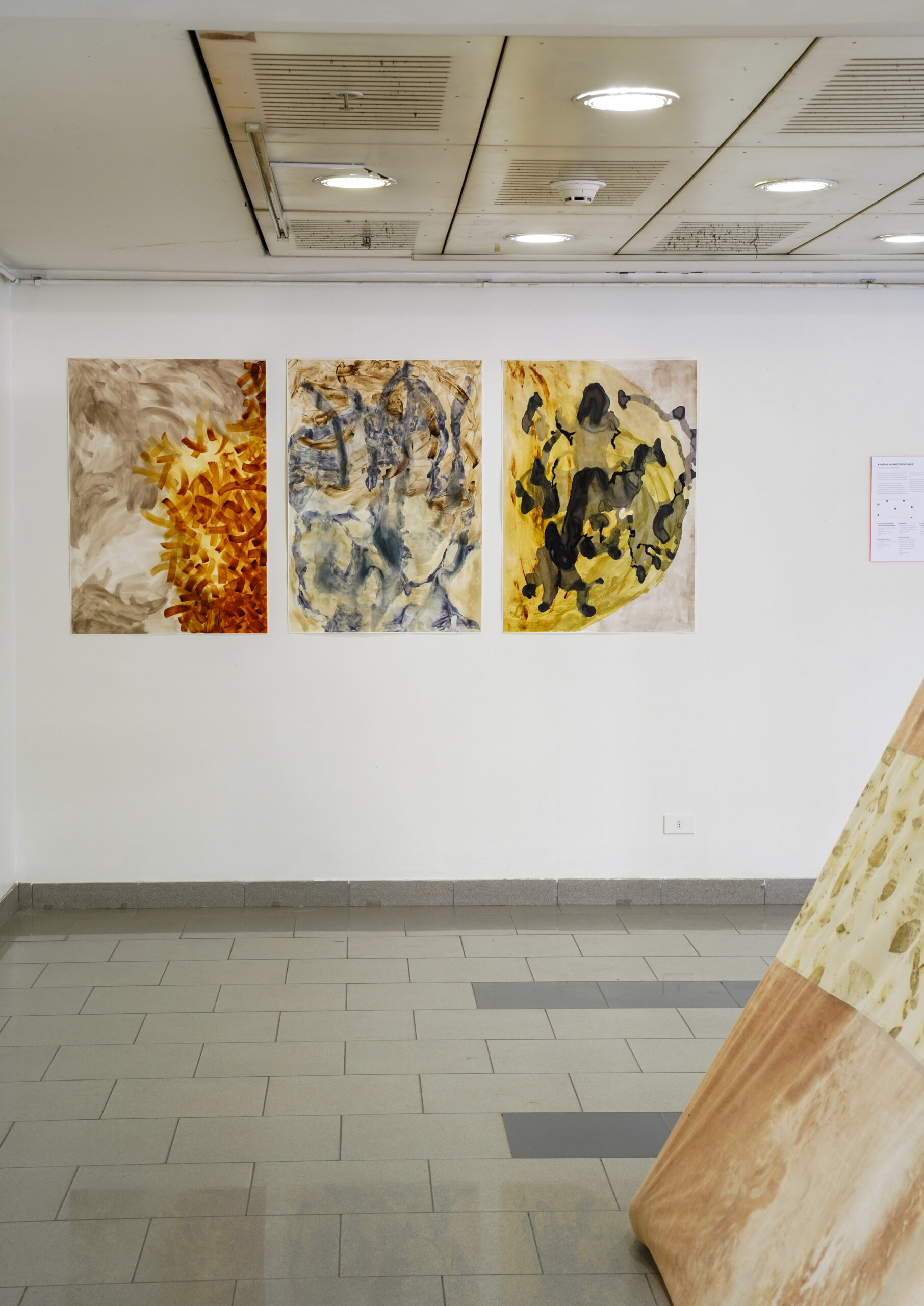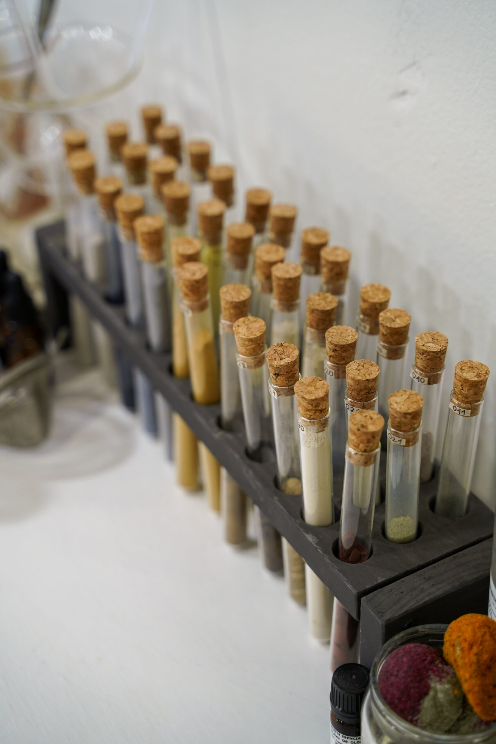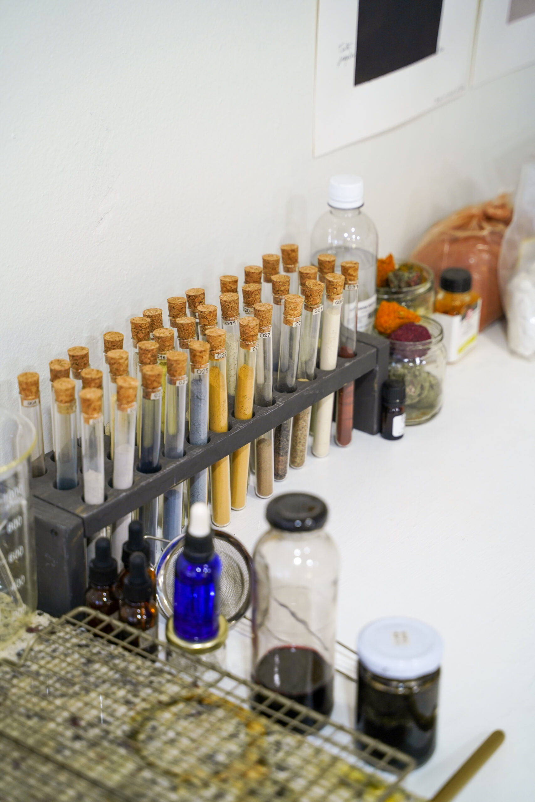 Pigmentos naturales sobre papel acuarelable. Tinta ferrogálica, lino español, rama árbol, cuerda de algodón, piedra. Mesa vasos precipitados, moleta, tubos de ensayo, vidrio grueso, rejilla, cocinilla chica, gotario ámbar, glicerina, aguamiel, panton en papel. Medidas variables.