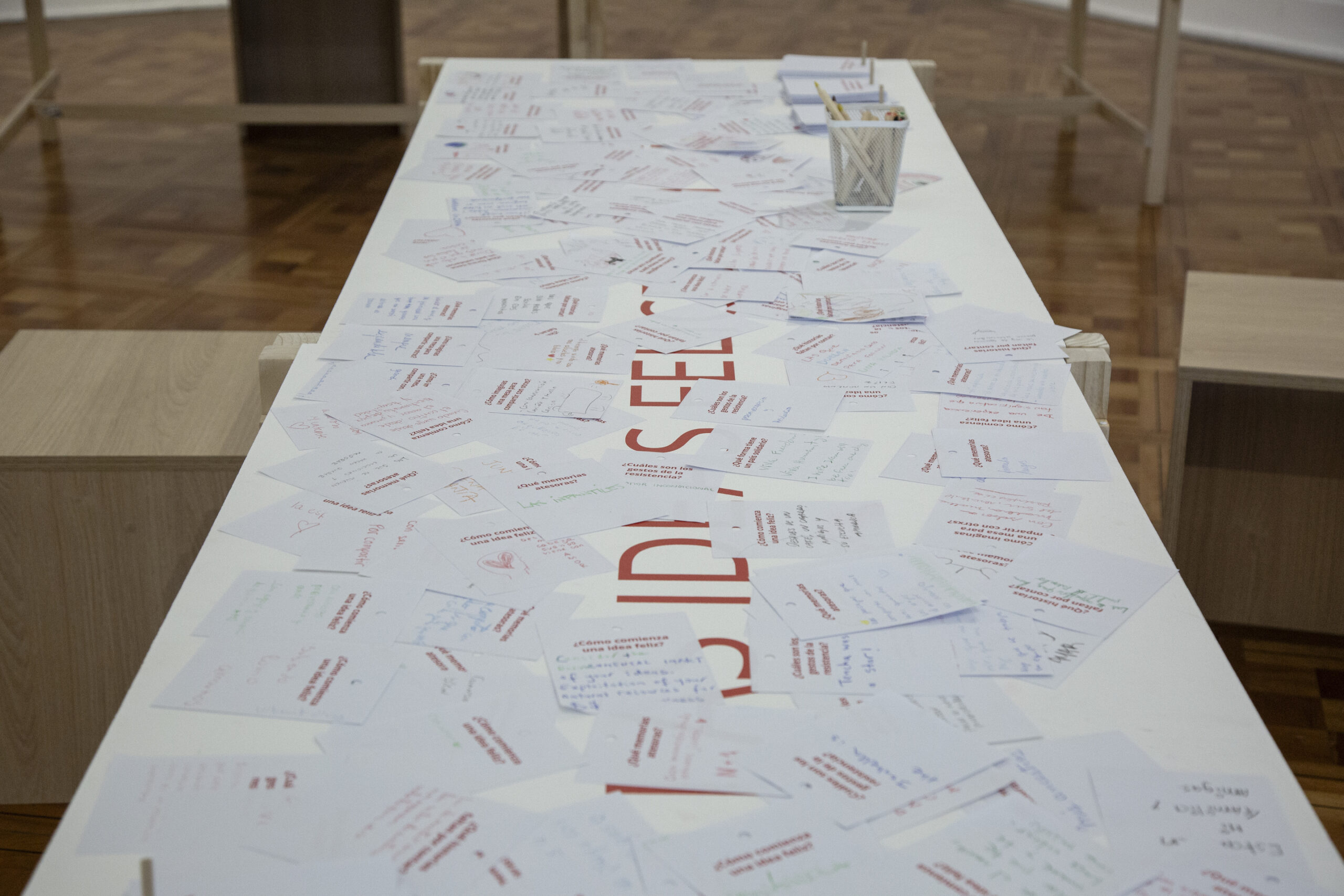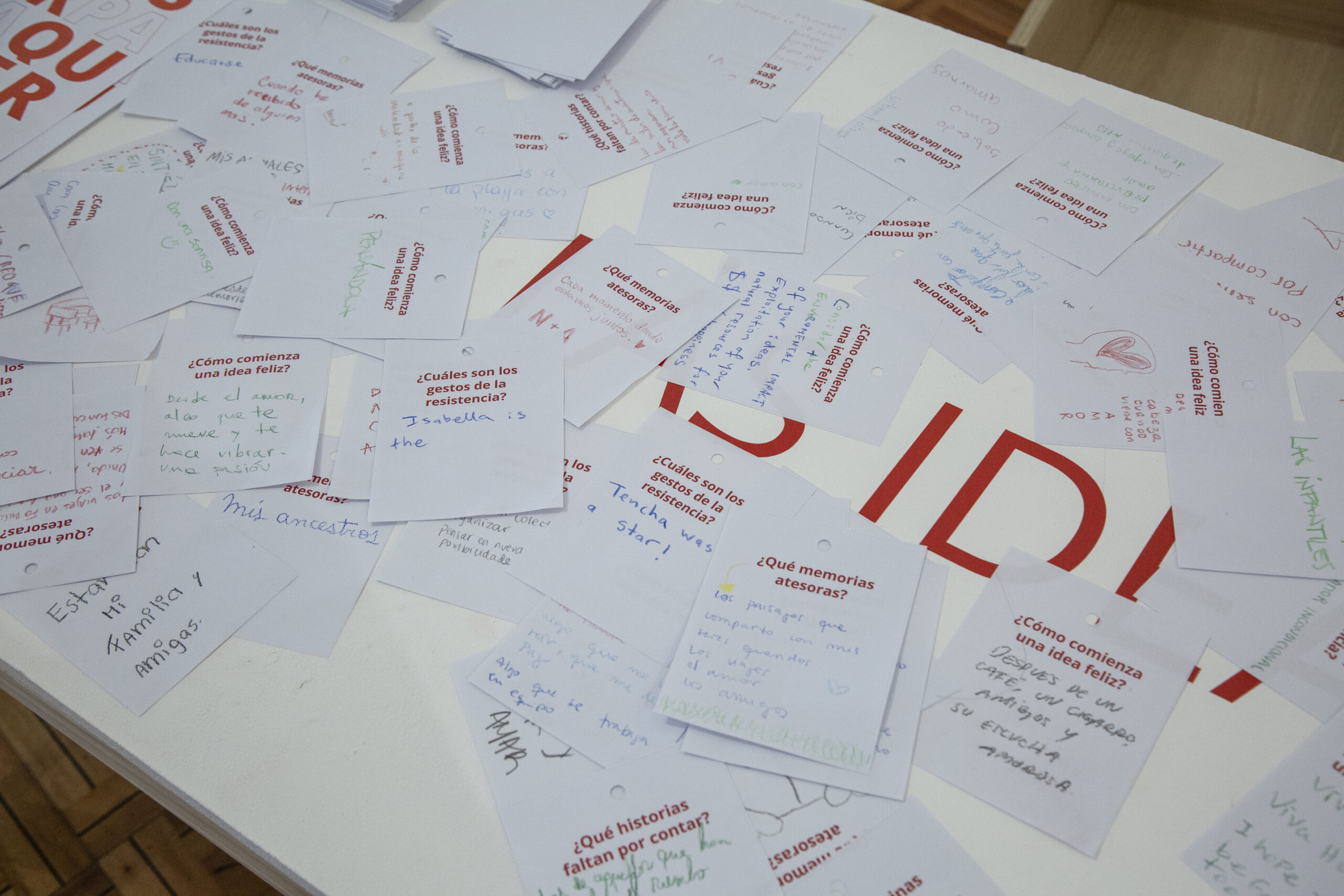 En la presente exhibición, Las ideas felices son así , mostramos los procesos del primer Laboratorio anual que se basó en el período del Museo Internacional de la Resistencia Salvador Allende (MIRSA), desde 1975 a 1990. Seis artistas-docentes de la Escuela invitados fueron a investigar acerca del cuerpo documental de las Fichas MIRSA, para indagar bajo el concepto de resistencia en las imágenes, retratos, escritos, declaraciones, correspondencias e incluso en las marcas que deja el paso del tiempo en la materialidad de un documento, o los vacíos de información que revelan los esfuerzos de un período de clandestinidad. El proceso de experimentación se estructuró a partir de visitas al Archivo para trabajar con materiales documentales, reuniones para compartir las investigaciones y hallazgos, y el trabajo en el taller de serigrafía de la Escuela. También involucró un proceso de colaboración entre varias organizaciones del Barrio República, cuya relevancia radica en la necesaria y urgente creación de comunidad: a partir de la correspondencia entre los procesos artísticos, las prácticas educativas y de mediación crítica.